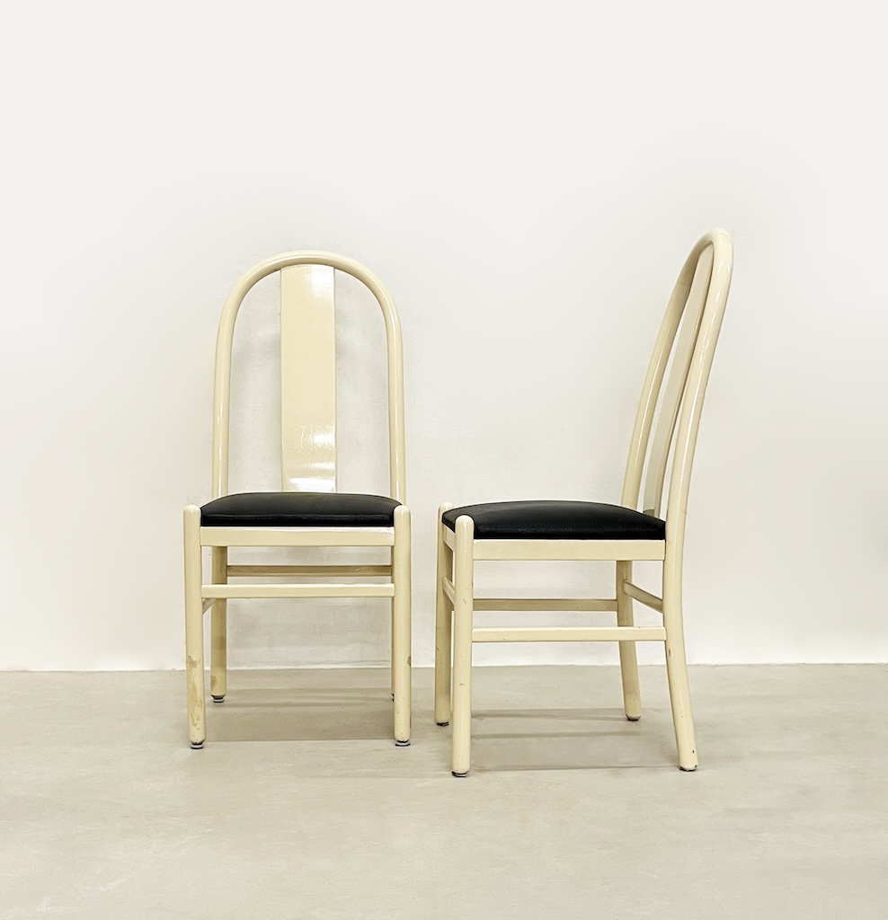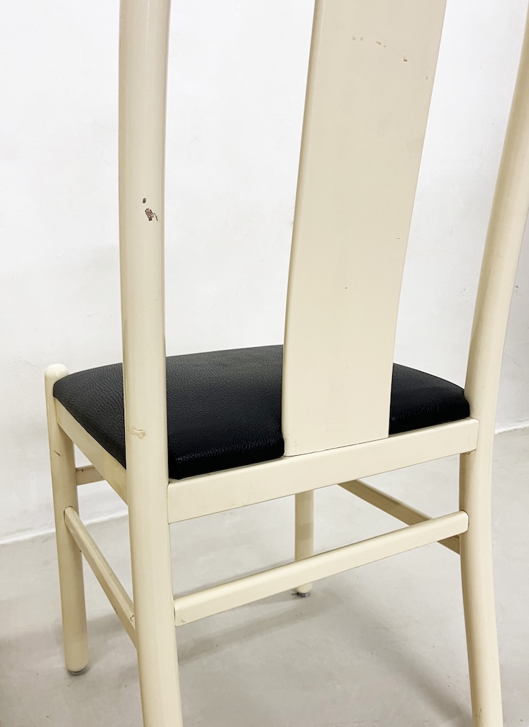 Particular set of four 1980s chairs entirely in lacquered wood with leather upholstered seat.