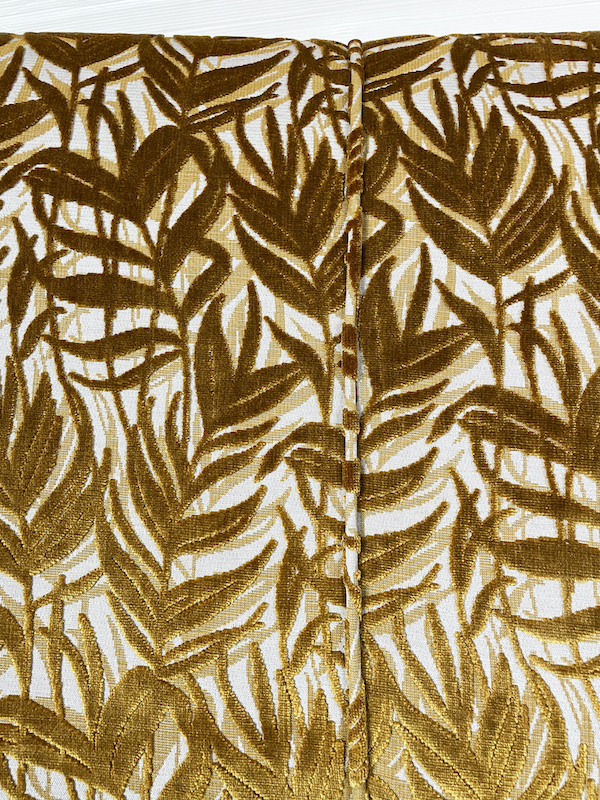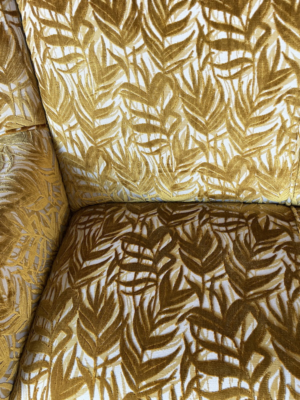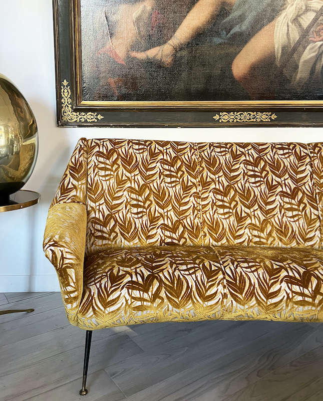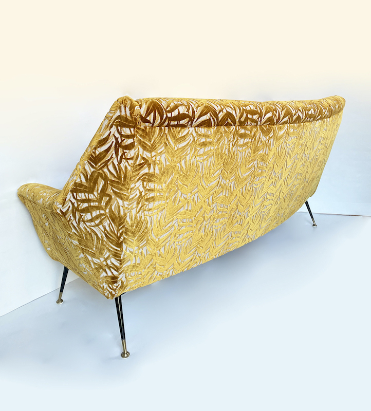 Particolare divano vintage 1970 dalla forma lineare e leggera completamente ritappezzato con tessuto color ocra di prima qualità in viscosa dall’elegante trama a foglie. Struttura in legno, piedini in legno laccato nero con dettaglio in ottone.