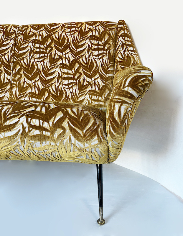 Particular vintage 1970s sofa with a linear and light shape, completely reupholstered with high-quality ochre-colored fabric in viscose with an elegant leaf pattern. Wooden frame, black lacquered wooden feet with brass detail.