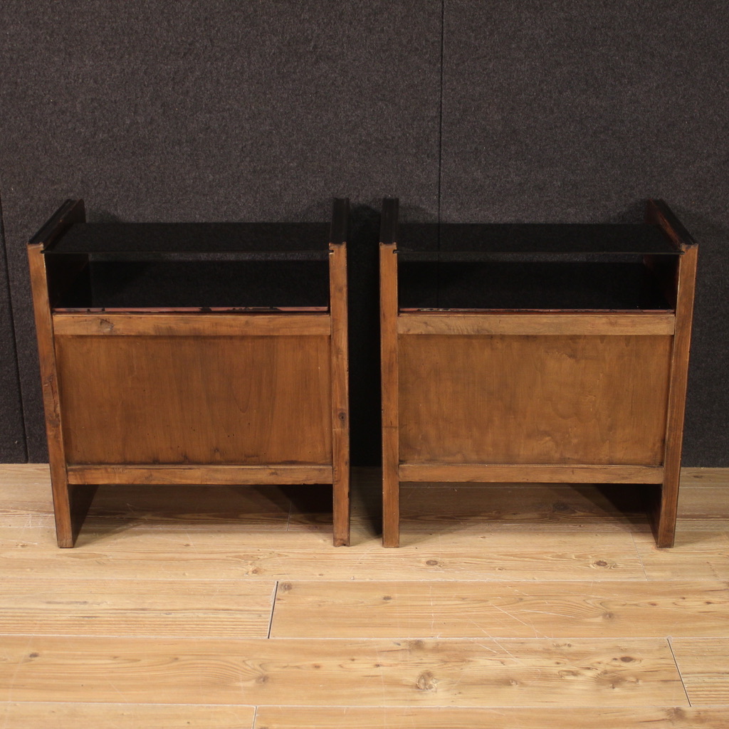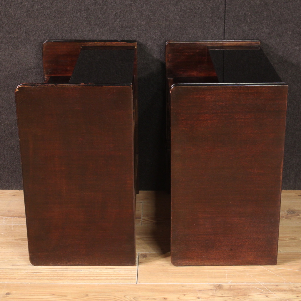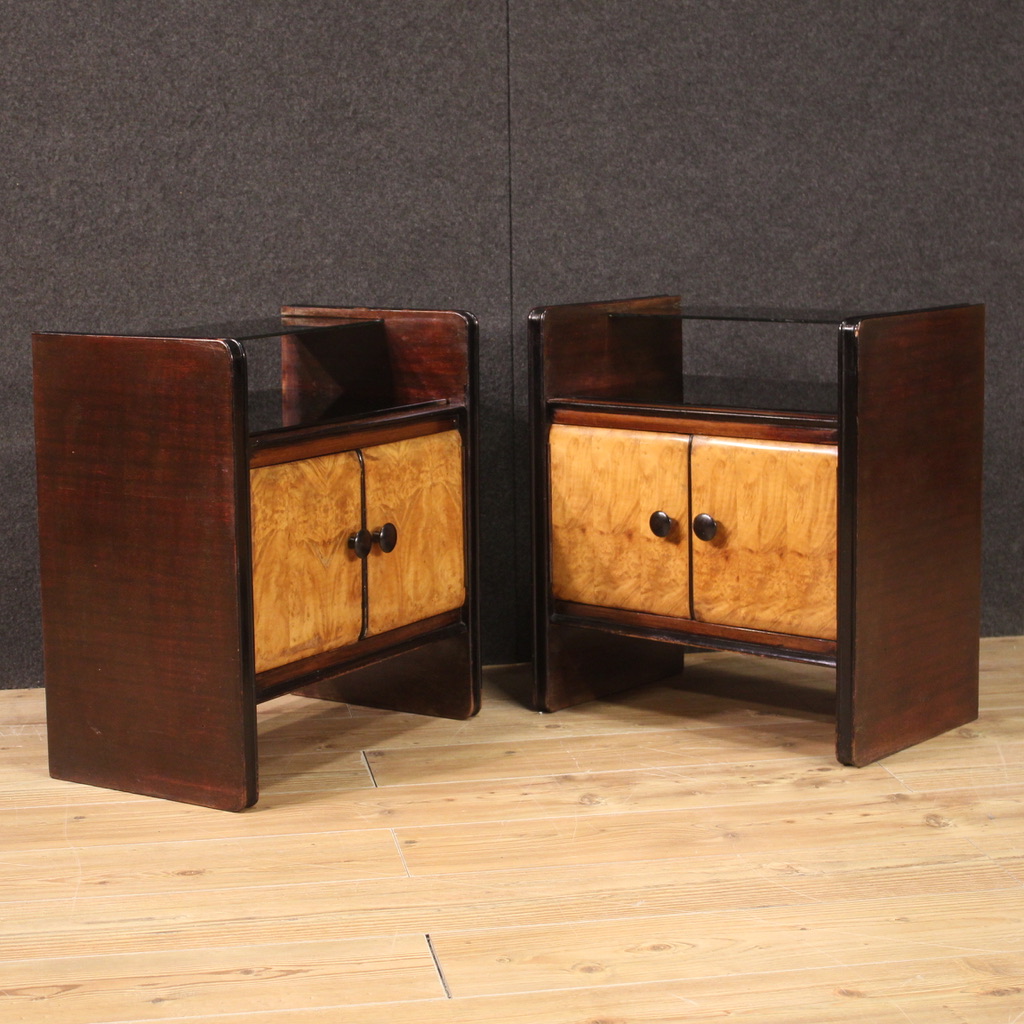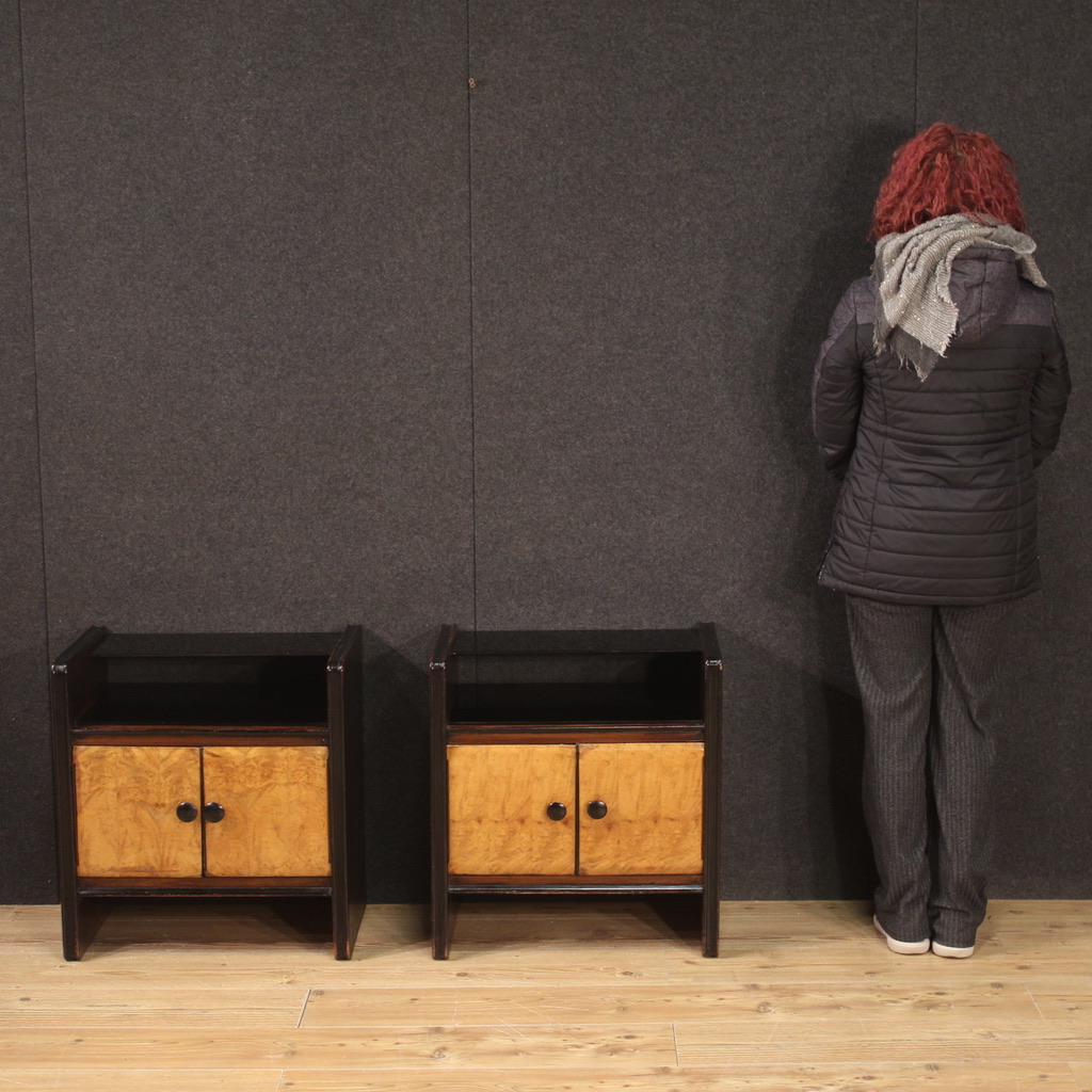 Beautiful pair of French bedside tables from the mid-20th century. Furniture veneered in mahogany, burr walnut, ebony wood and fruit woods, with a beautiful line and pleasant furnishing. Art Deco style bedside tables equipped with two frosted glass shelves of discreet size and service. Shelves showing small scratches, signs of wear (see photos). Furniture complete with two doors that offer inside a compartment of good capacity (see photos). Bedside tables for bedroom or living room of excellent proportion and beautiful decoration, for antique dealers and interior designers. They present some signs of wear, structurally sound, overall in good condition.