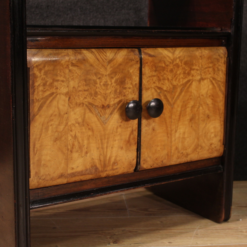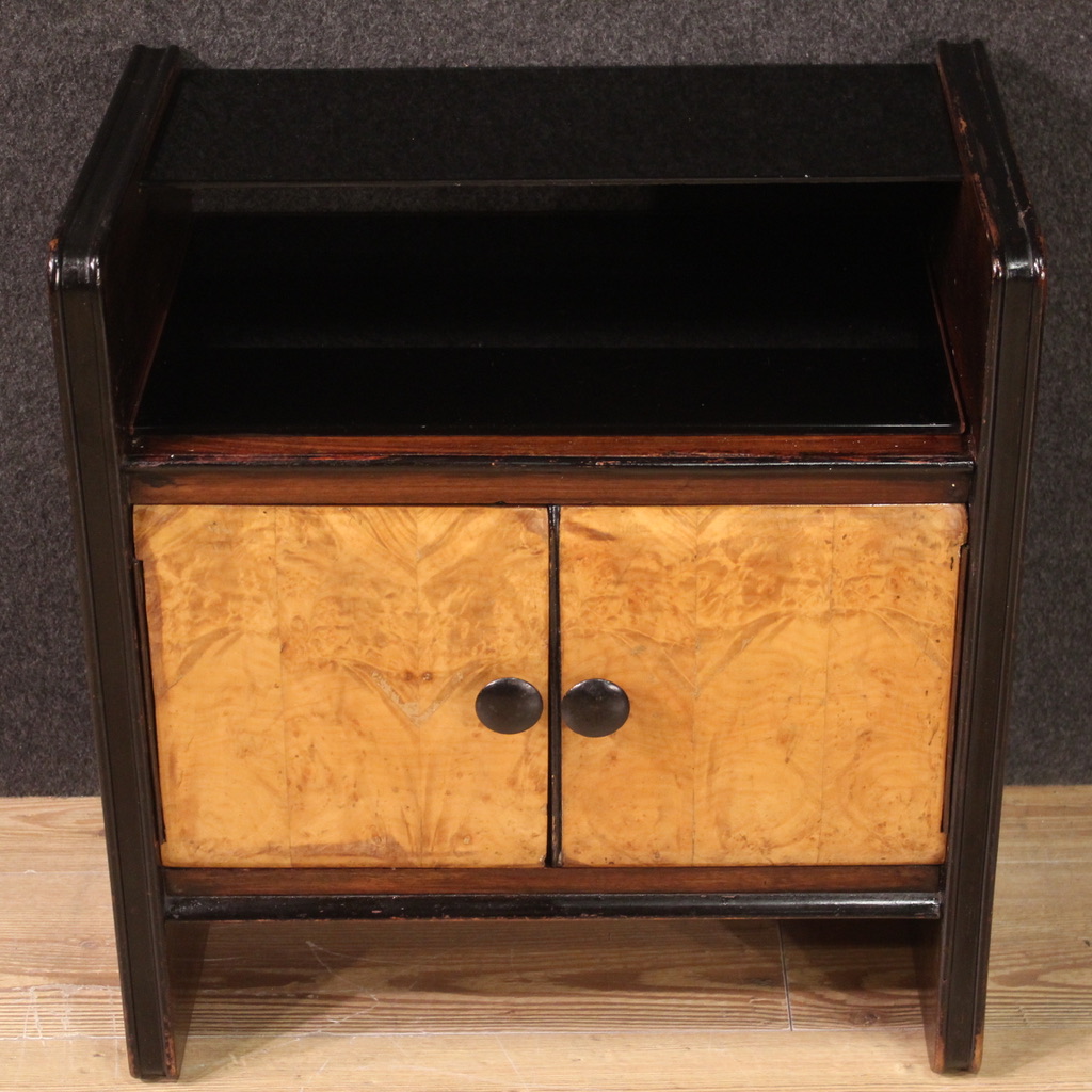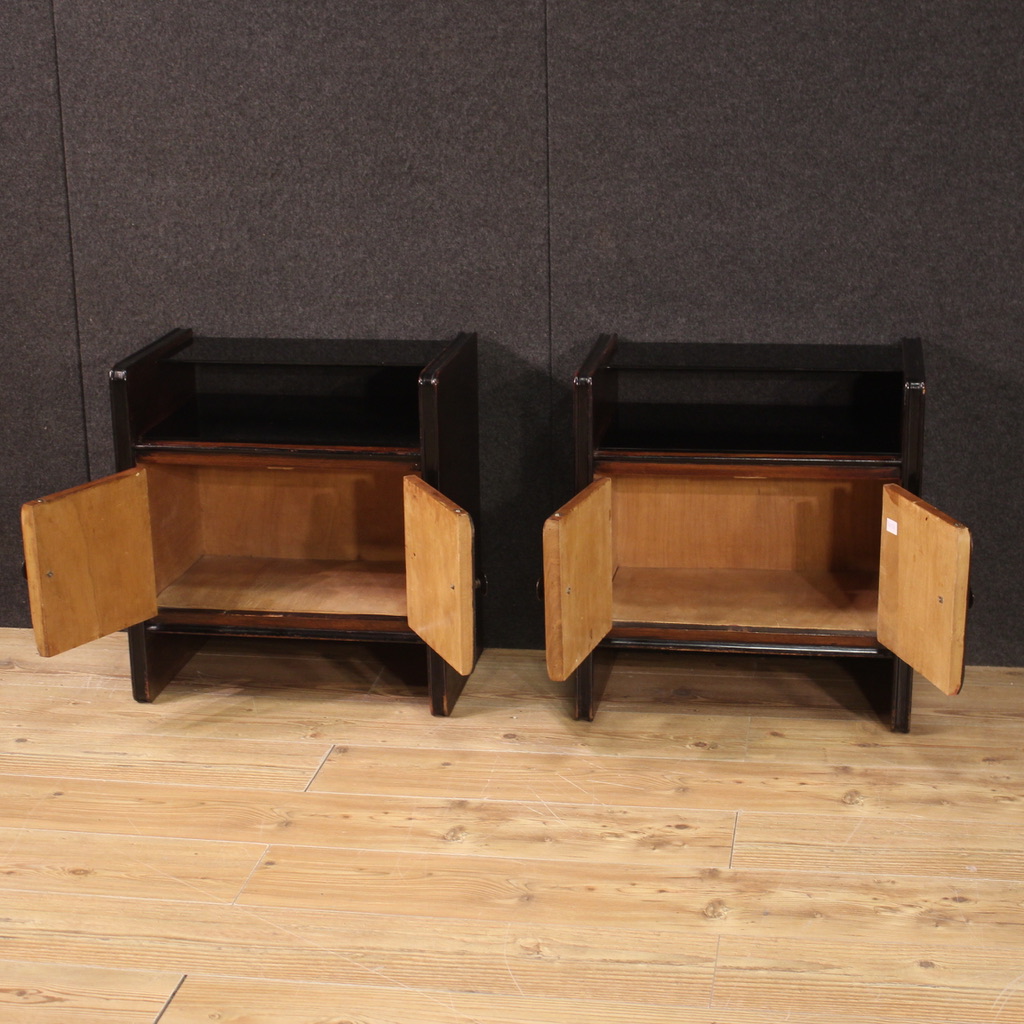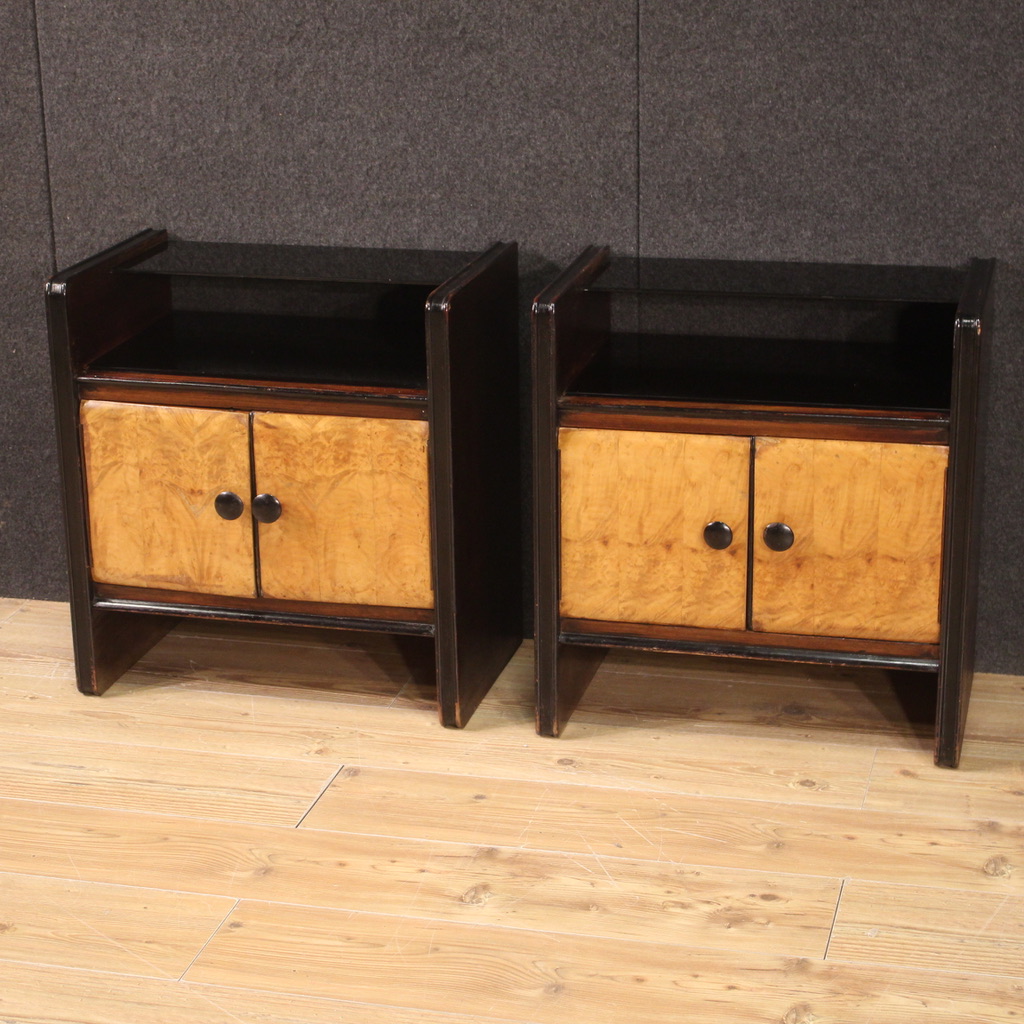 Beautiful pair of French bedside tables from the mid-20th century. Furniture veneered in mahogany, burr walnut, ebony wood and fruit woods, with a beautiful line and pleasant furnishing. Art Deco style bedside tables equipped with two frosted glass shelves of discreet size and service. Shelves showing small scratches, signs of wear (see photos). Furniture complete with two doors that offer inside a compartment of good capacity (see photos). Bedside tables for bedroom or living room of excellent proportion and beautiful decoration, for antique dealers and interior designers. They present some signs of wear, structurally sound, overall in good condition.