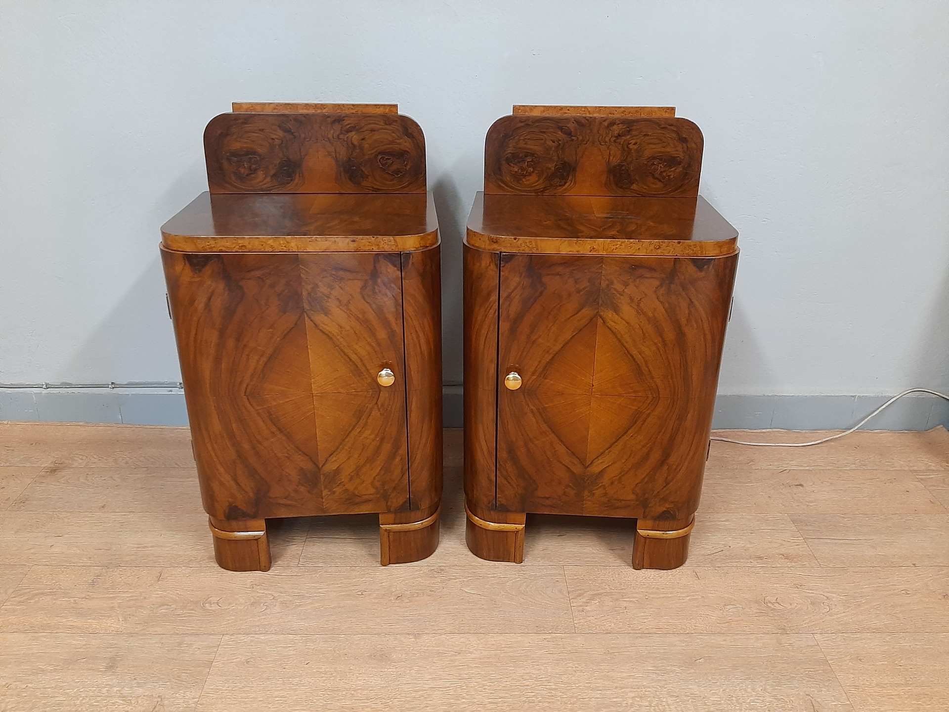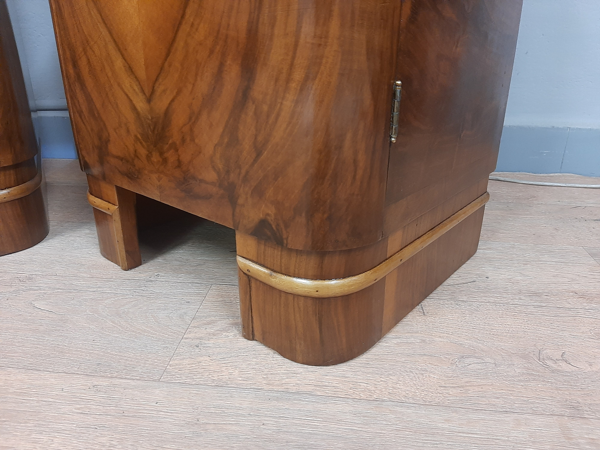 Pair of original Art Deco bedside tables in blond walnut and burr walnut, 1930-40