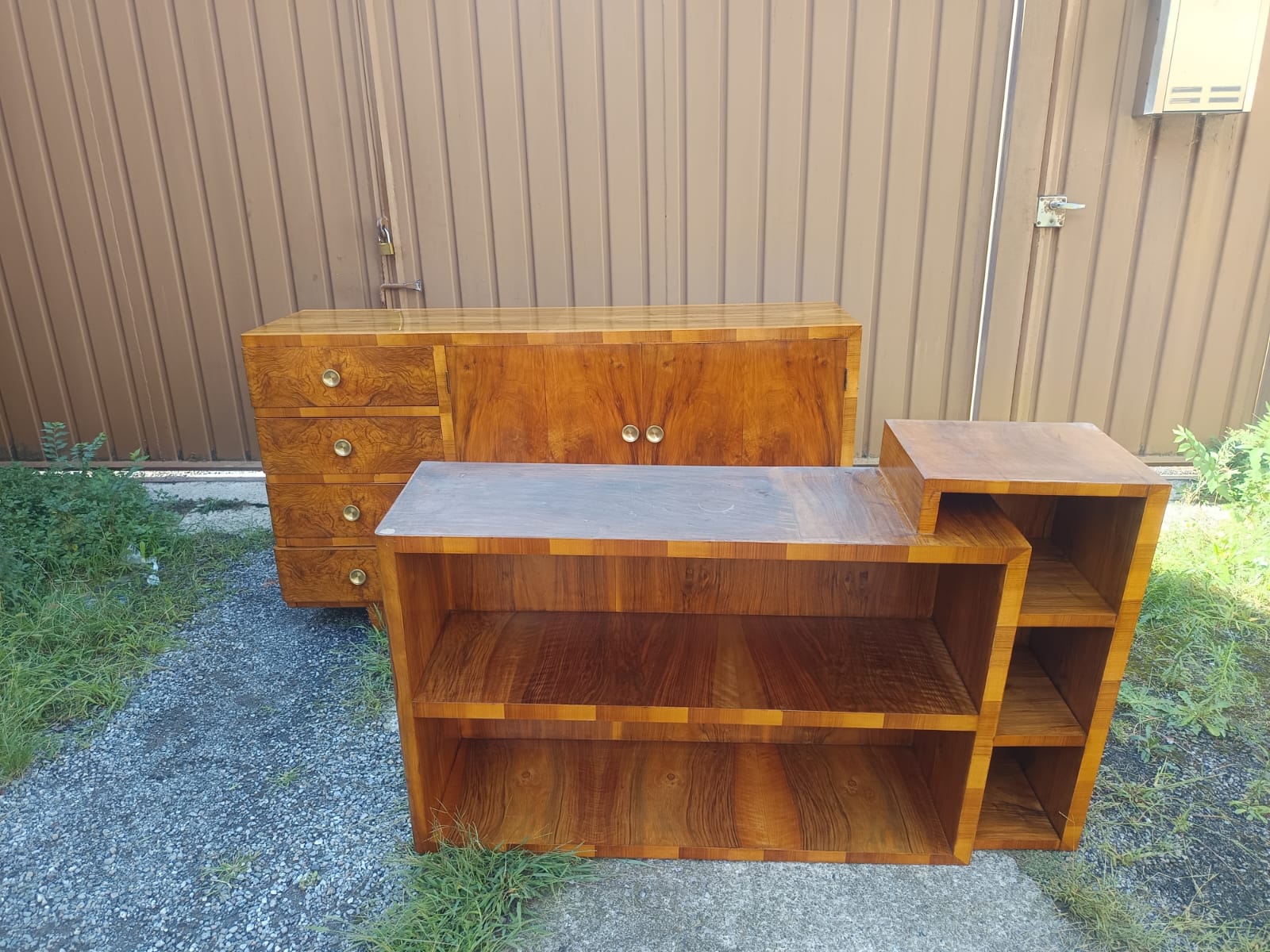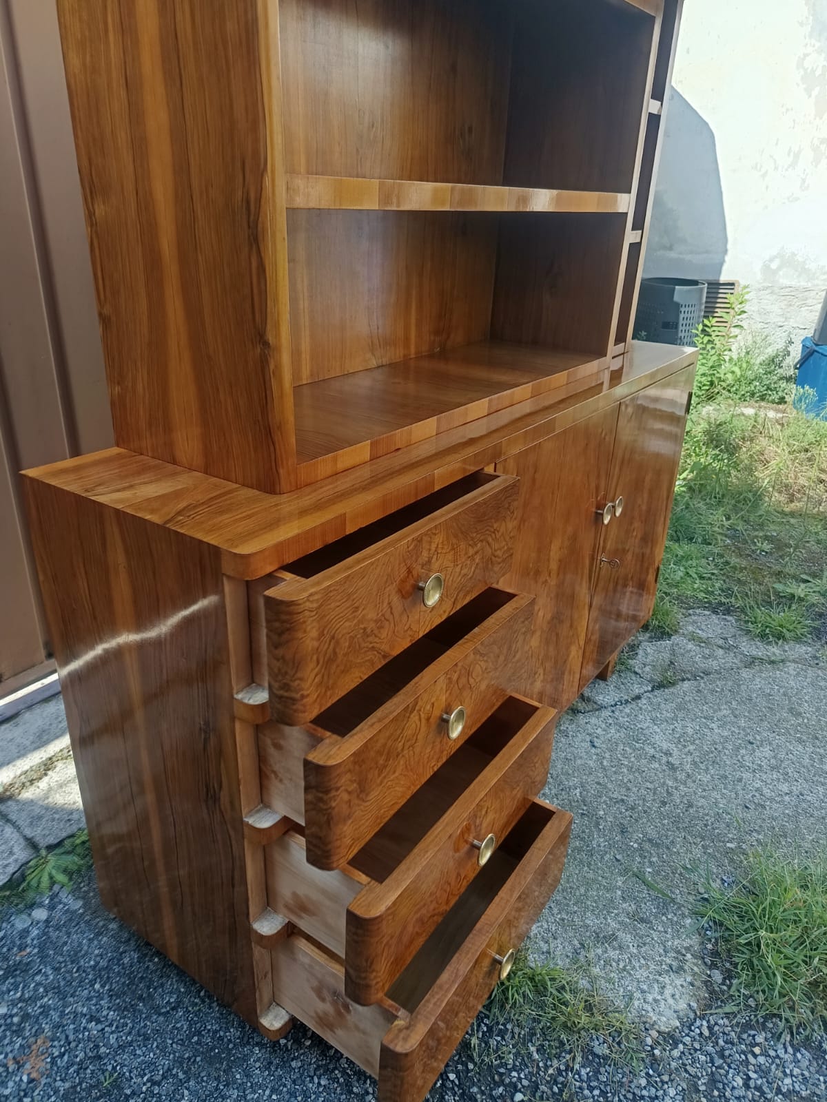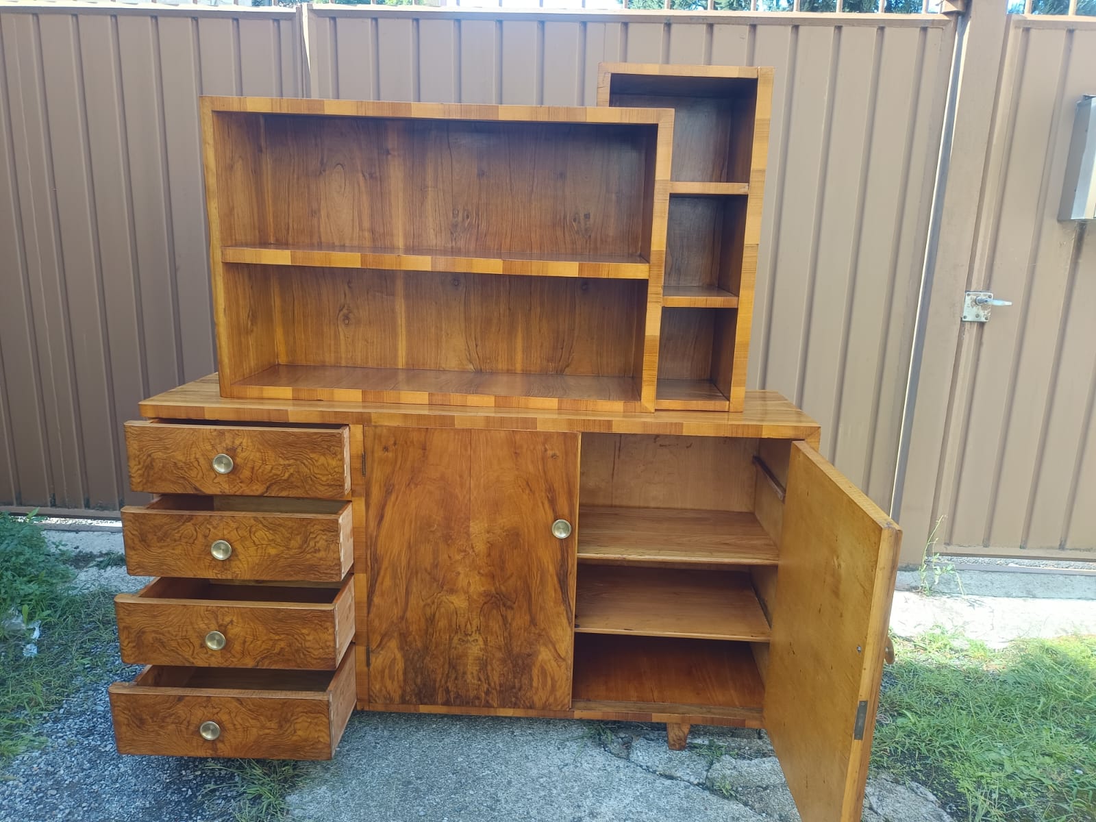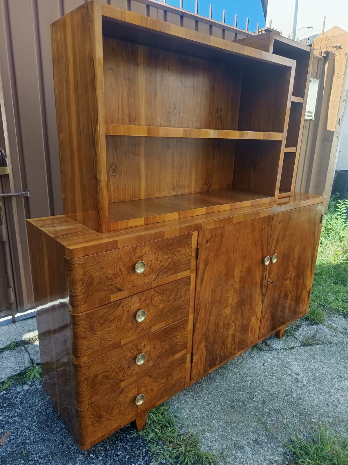 Unique sideboard with a visible top section. The furniture has been completely restored and repolished. Dimensions: 171 x 45 x 180 cm high. The upper part is less deep.