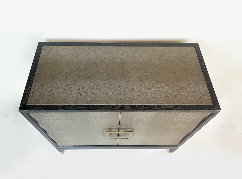 Unique sideboard - storage unit with an elegant and modern style, very spacious and characterized by two front doors entirely made of oak wood with golden metal details and faux leather.