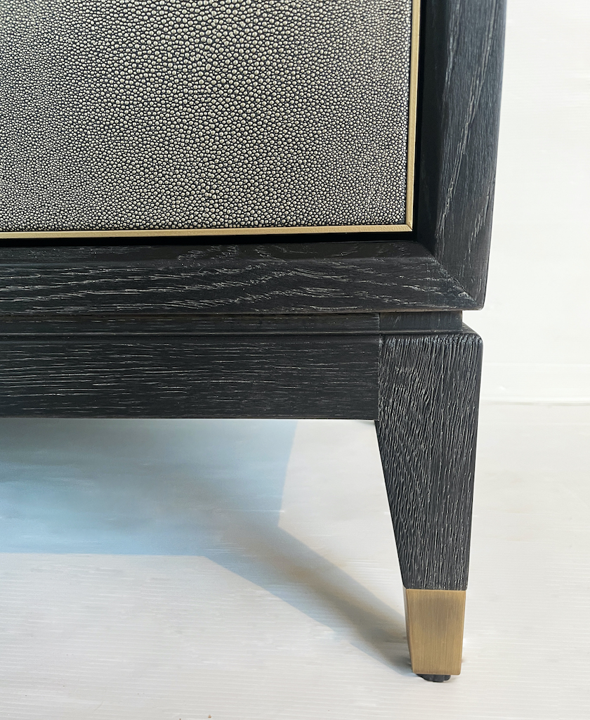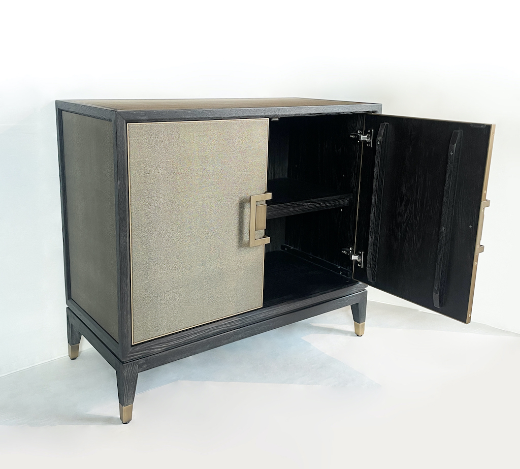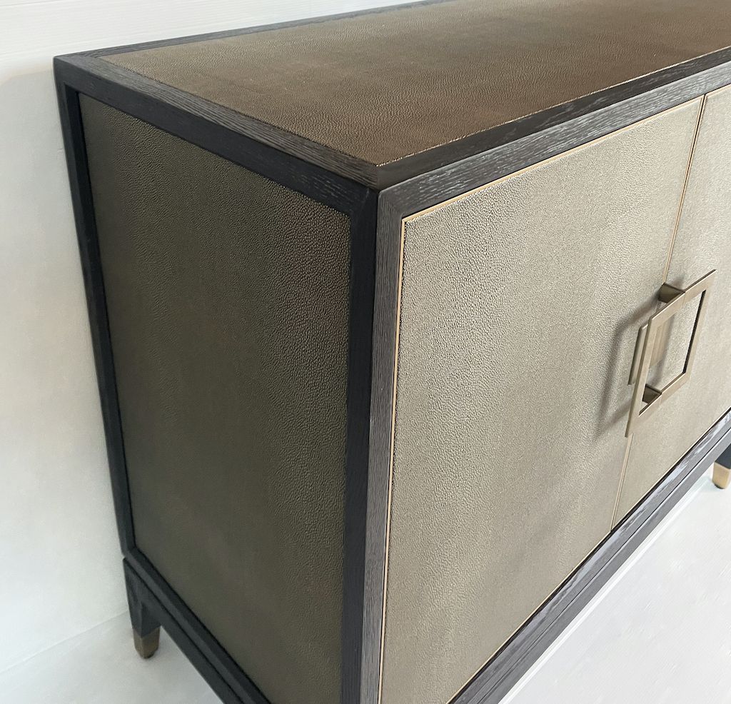 Unique sideboard - storage unit with an elegant and modern style, very spacious and characterized by two front doors entirely made of oak wood with golden metal details and faux leather.