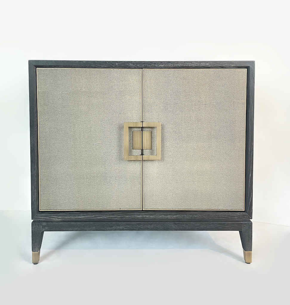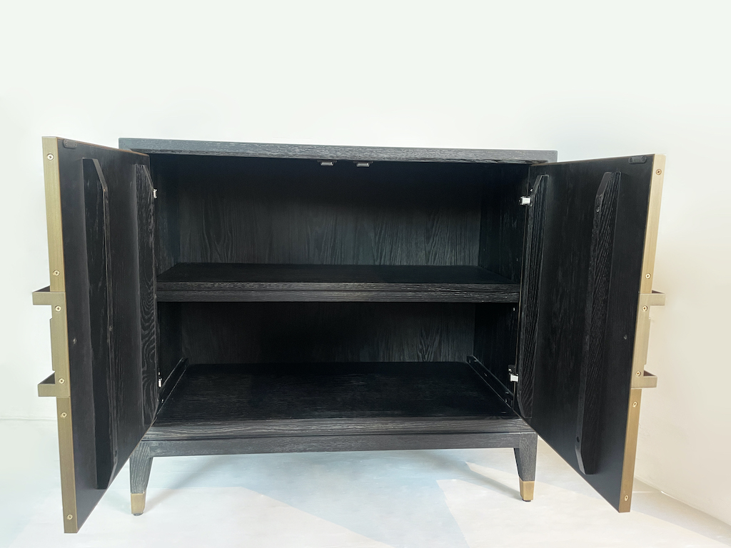 Unique sideboard - storage unit with an elegant and modern style, very spacious and characterized by two front doors entirely made of oak wood with golden metal details and faux leather. Dimensions: L 97 x D 45 x H 85 cm Origin: Italy Period: Contemporary