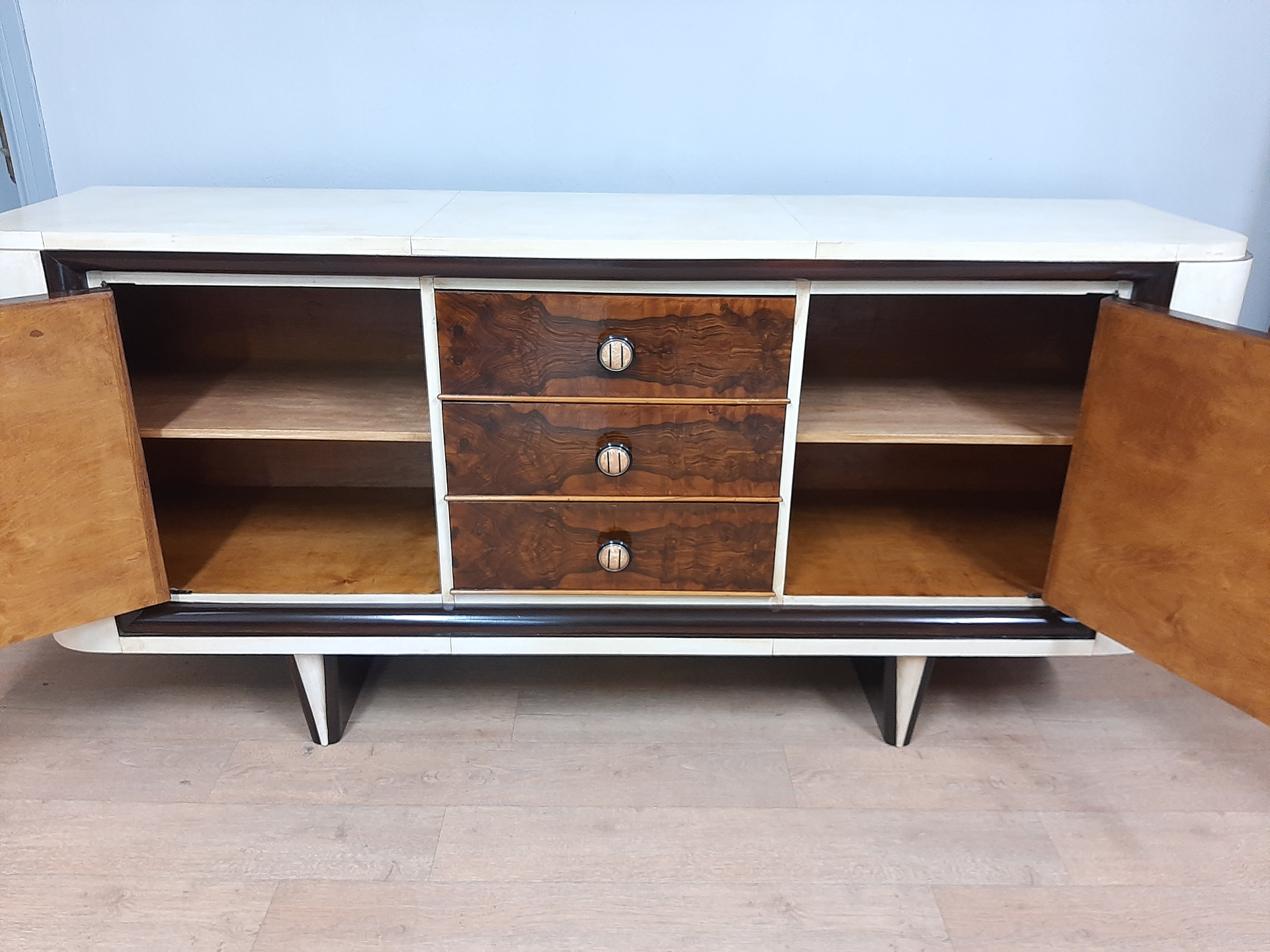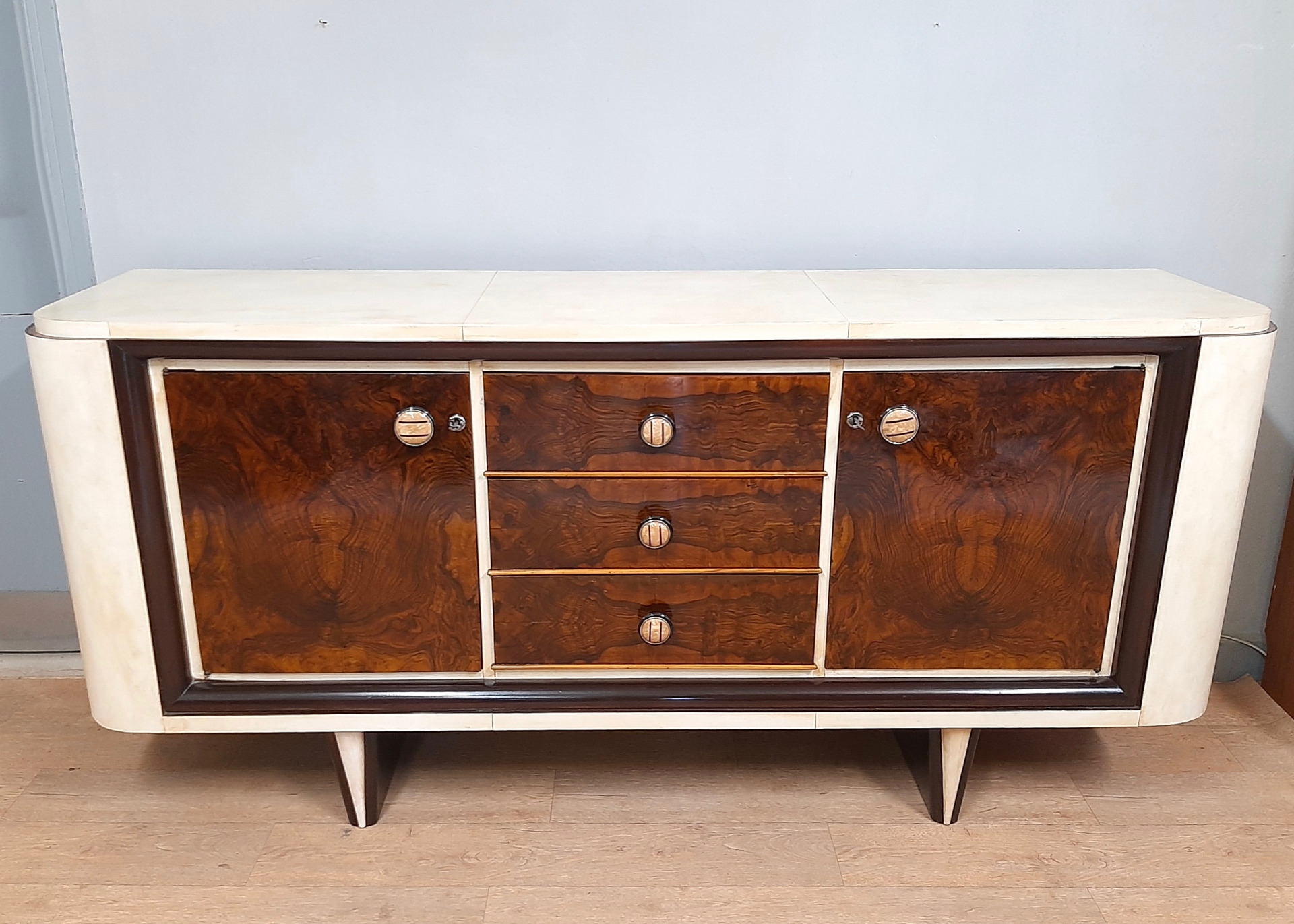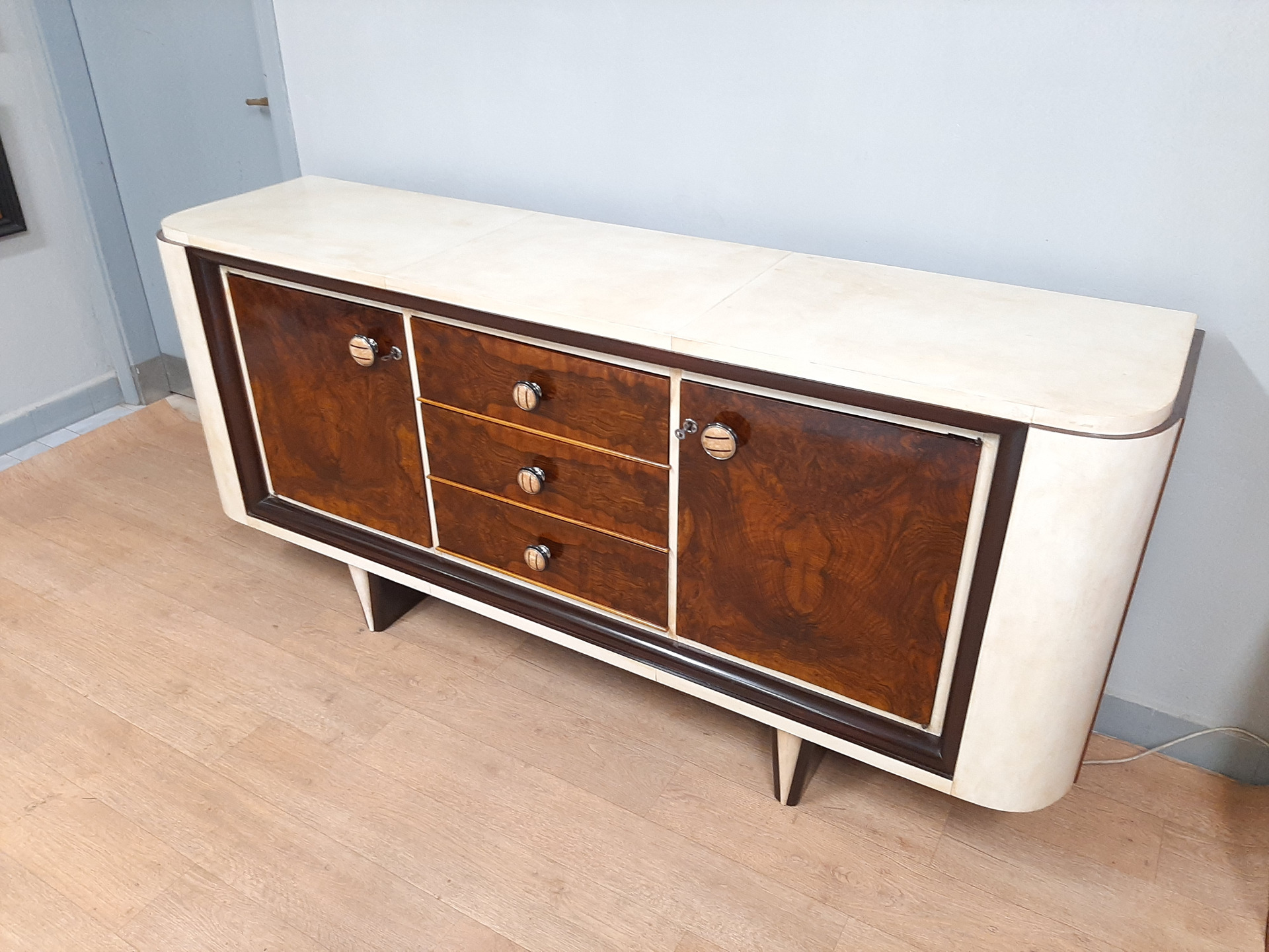 Notes: magnificent art deco sideboard from the 1930s-40s covered in walnut burl and parchment, featuring 2 large doors and 3 drawers in the center. very high quality original knobs. The furniture has been professionally and conservatively restored and shellac polished, ready to be inserted immediately.