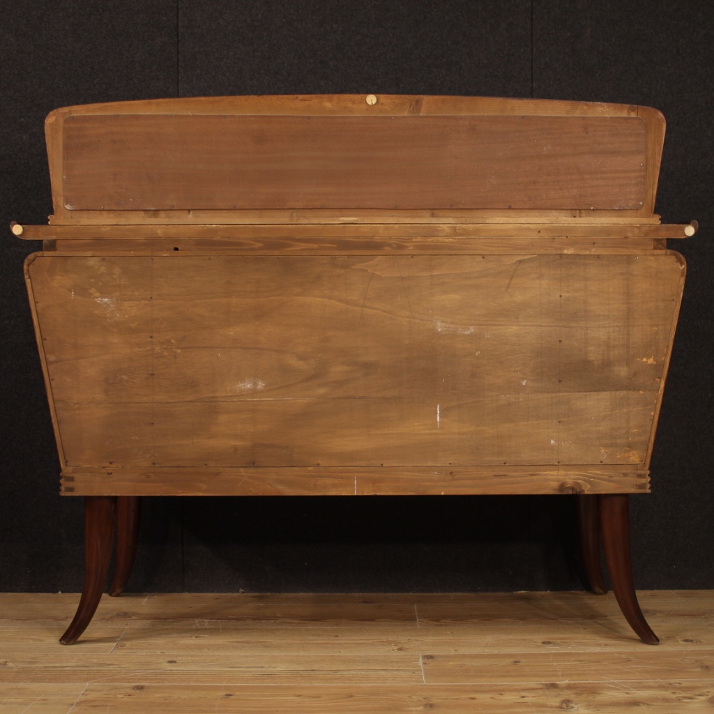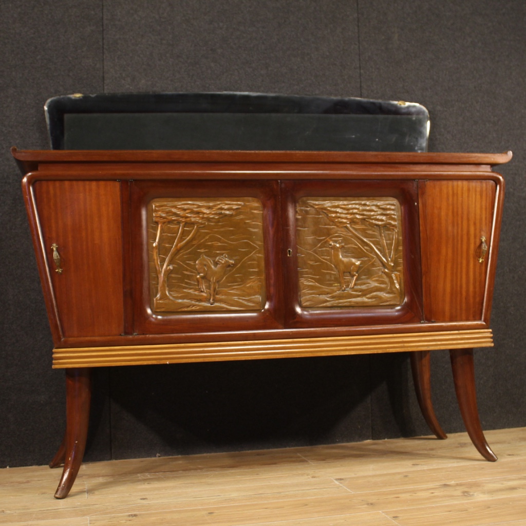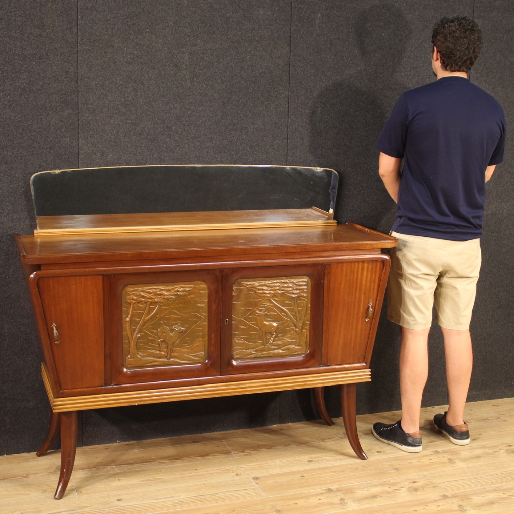 Italian design sideboard from the 50s / 60s. High quality furniture carved and veneered in mahogany, walnut, beech and fruitwood. Sideboard with four doors, of good capacity, complete with a working key. Wooden top in character, of good size and service, equipped with interlocking mirror with special wooden grafts. Original mirror of small size that has some small stain, sign of time, without breakage or chipping (see photo). Two central doors adorned with wooden panels chiseled with fawns in the woods (see photo). Furniture supported by four solid saber legs (see photo). Sideboard of excellent proportion, for antique dealers and interior decorators, ideal to be placed in a living room. In good condition with some small signs of aging.