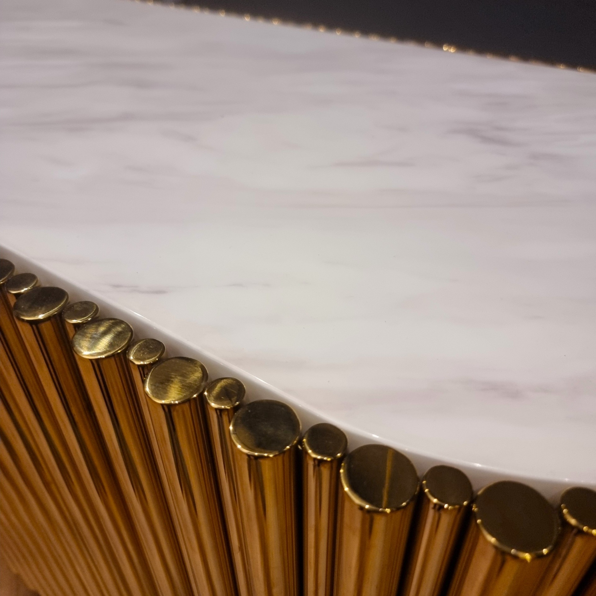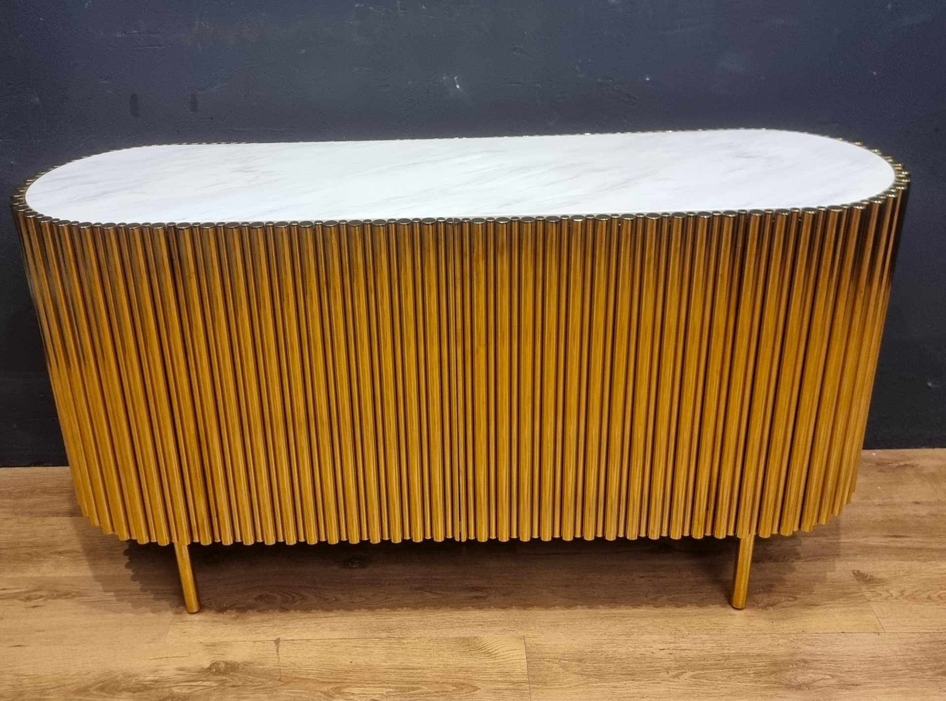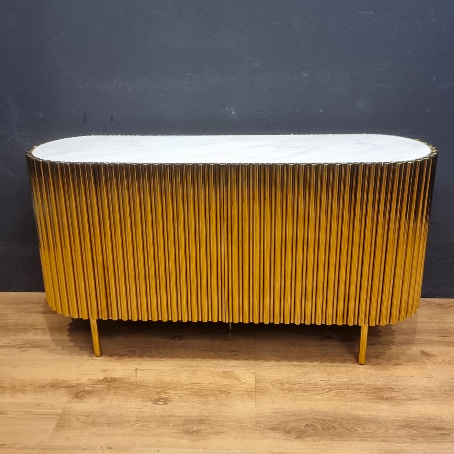 The credenza is made of gold plated steel, a solid and durable material that adds a touch of modernity and refinement. The white marble top further enhances the beauty and elegance of the piece, giving it a timeless charm. Ideal for placement in a living room or dining room, this credenza offers ample and practical storage space.