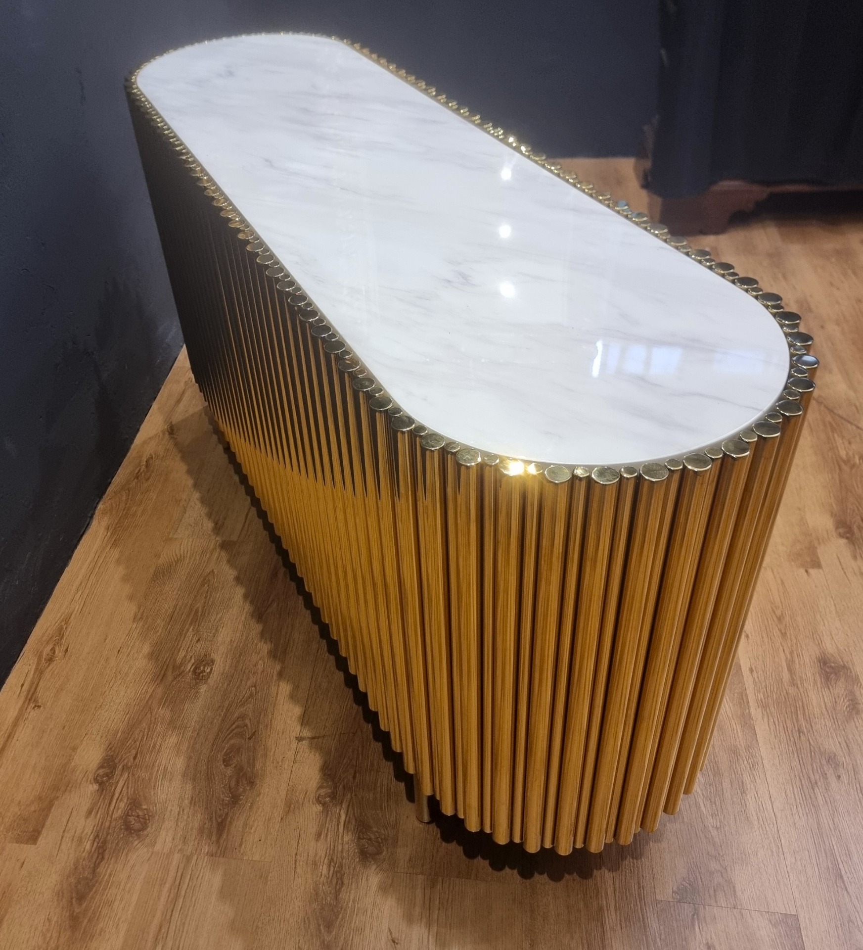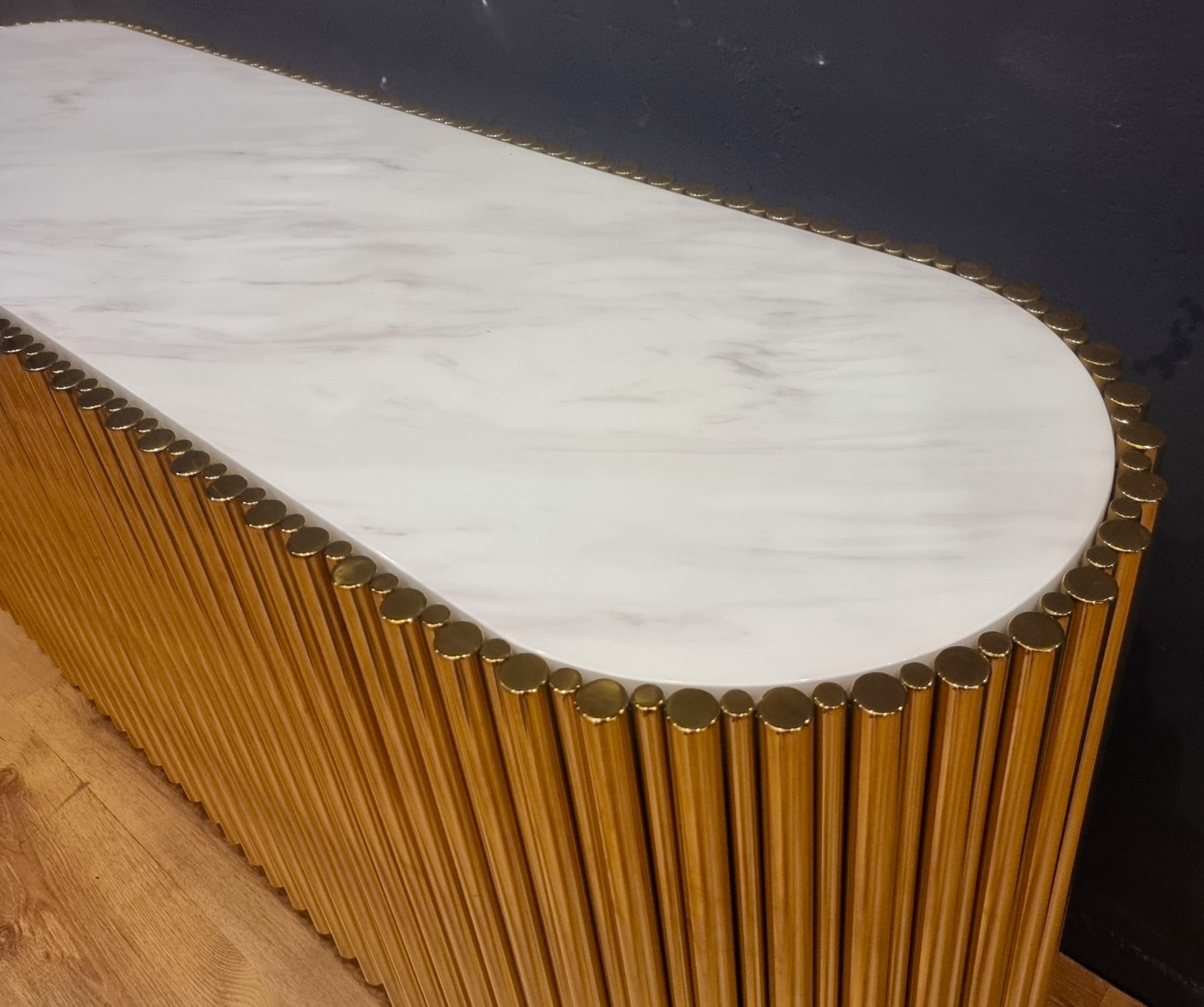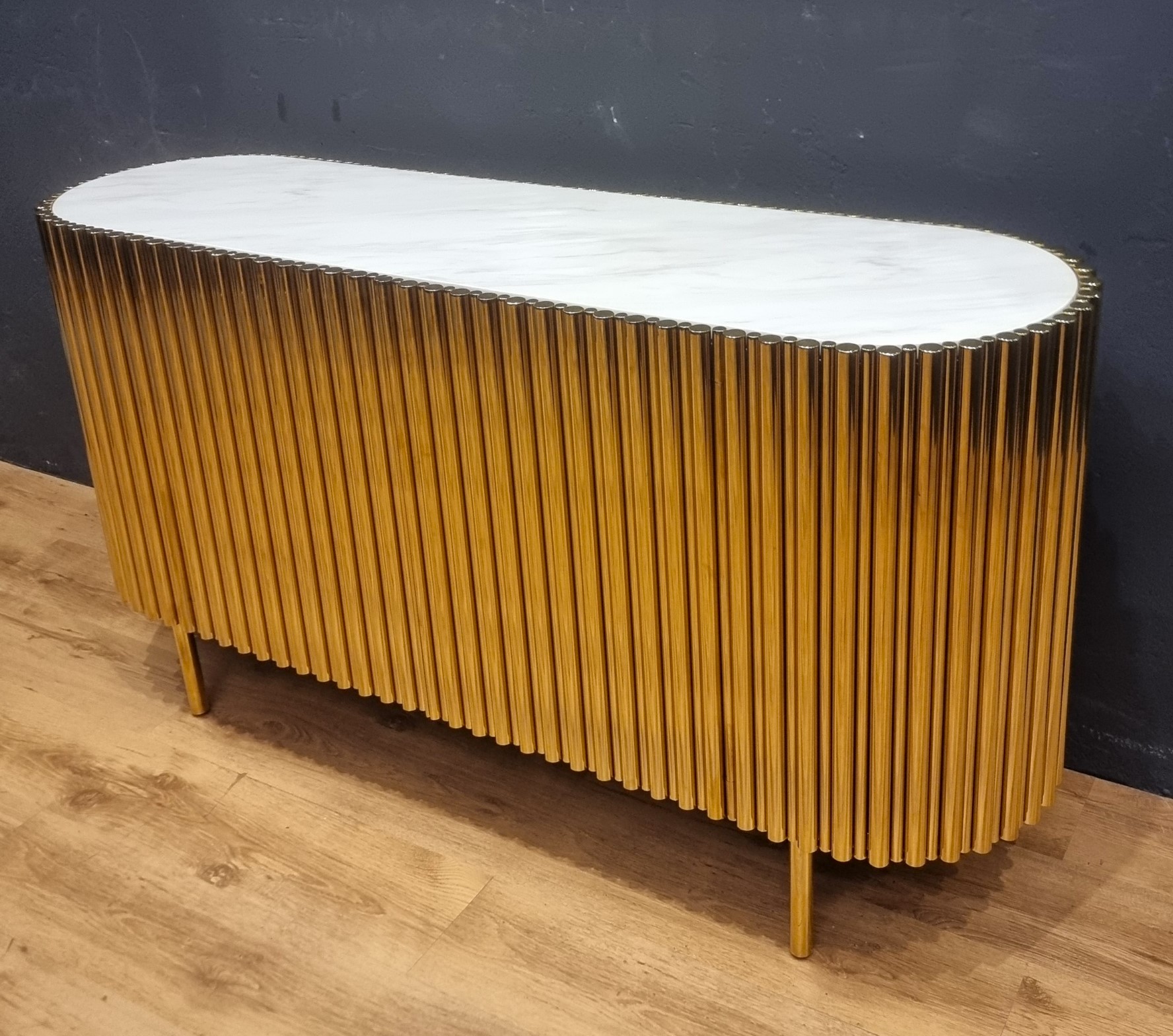 The credenza is made of gold plated steel, a solid and durable material that adds a touch of modernity and refinement. The white marble top further enhances the beauty and elegance of the piece, giving it a timeless charm. Ideal for placement in a living room or dining room, this credenza offers ample and practical storage space.