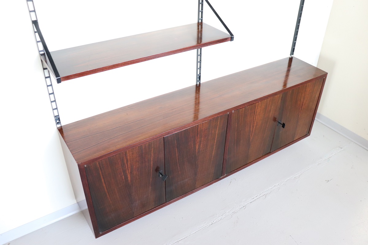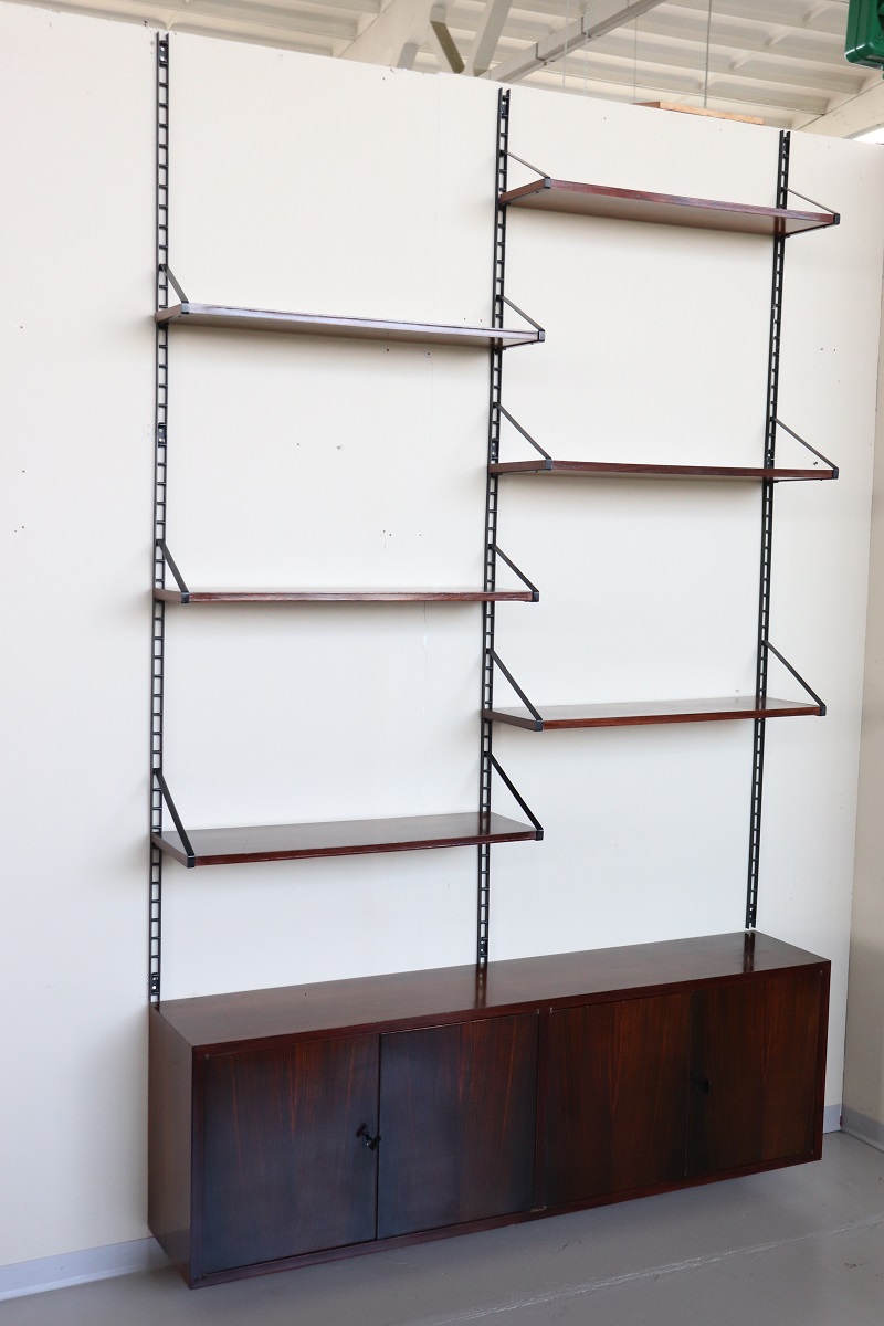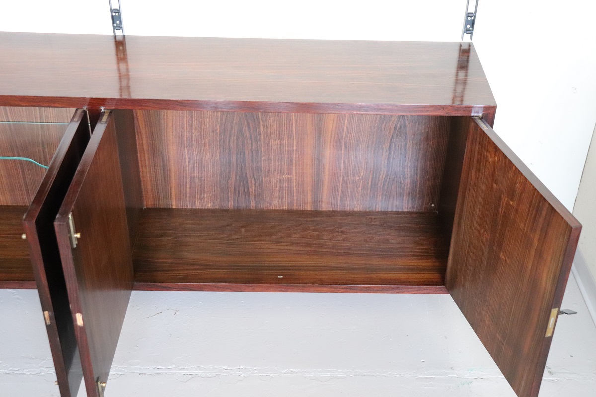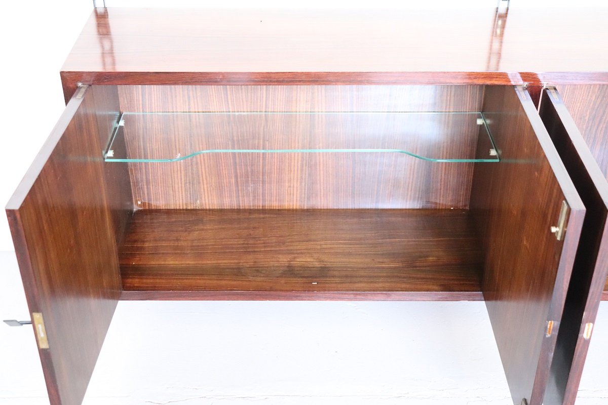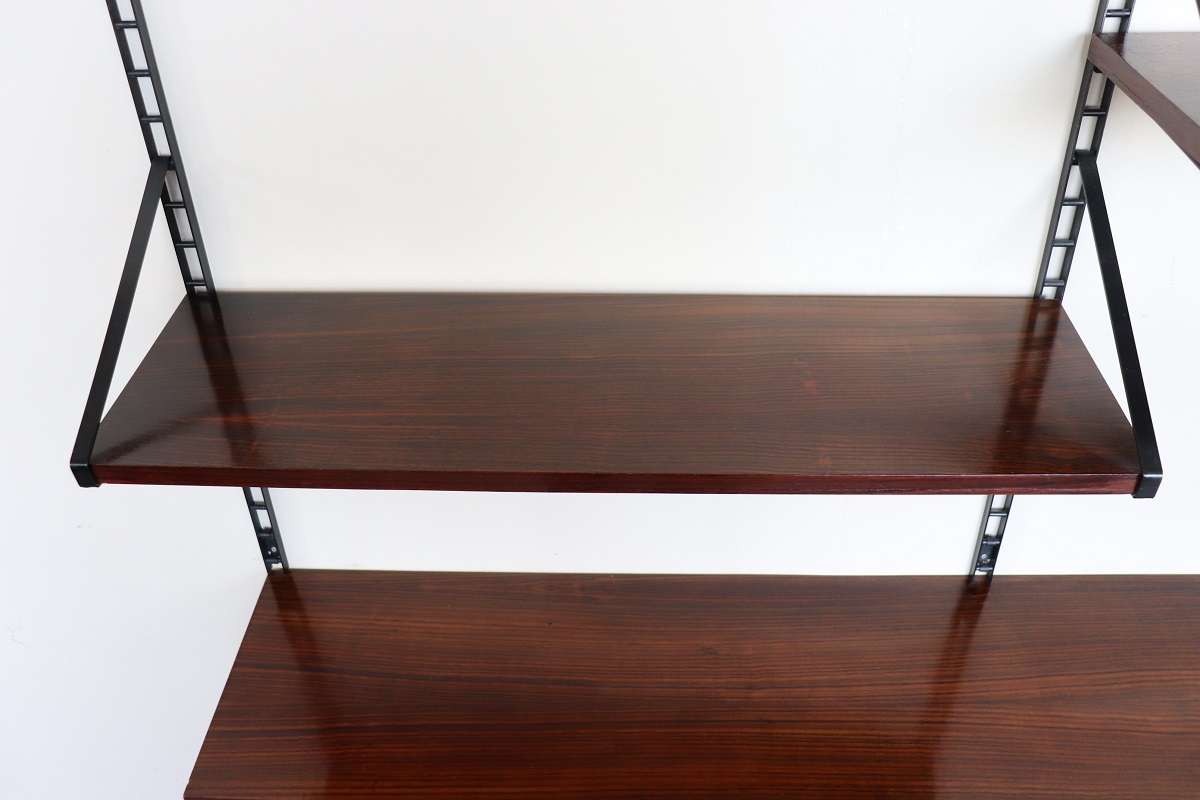 This refined mid-century wall bookcase embodies the timeless elegance of 1960s Italian design. Crafted with high-quality rosewood veneer and supported by a sleek metal frame, it exudes a minimalist aesthetic that seamlessly integrates into any decor.
