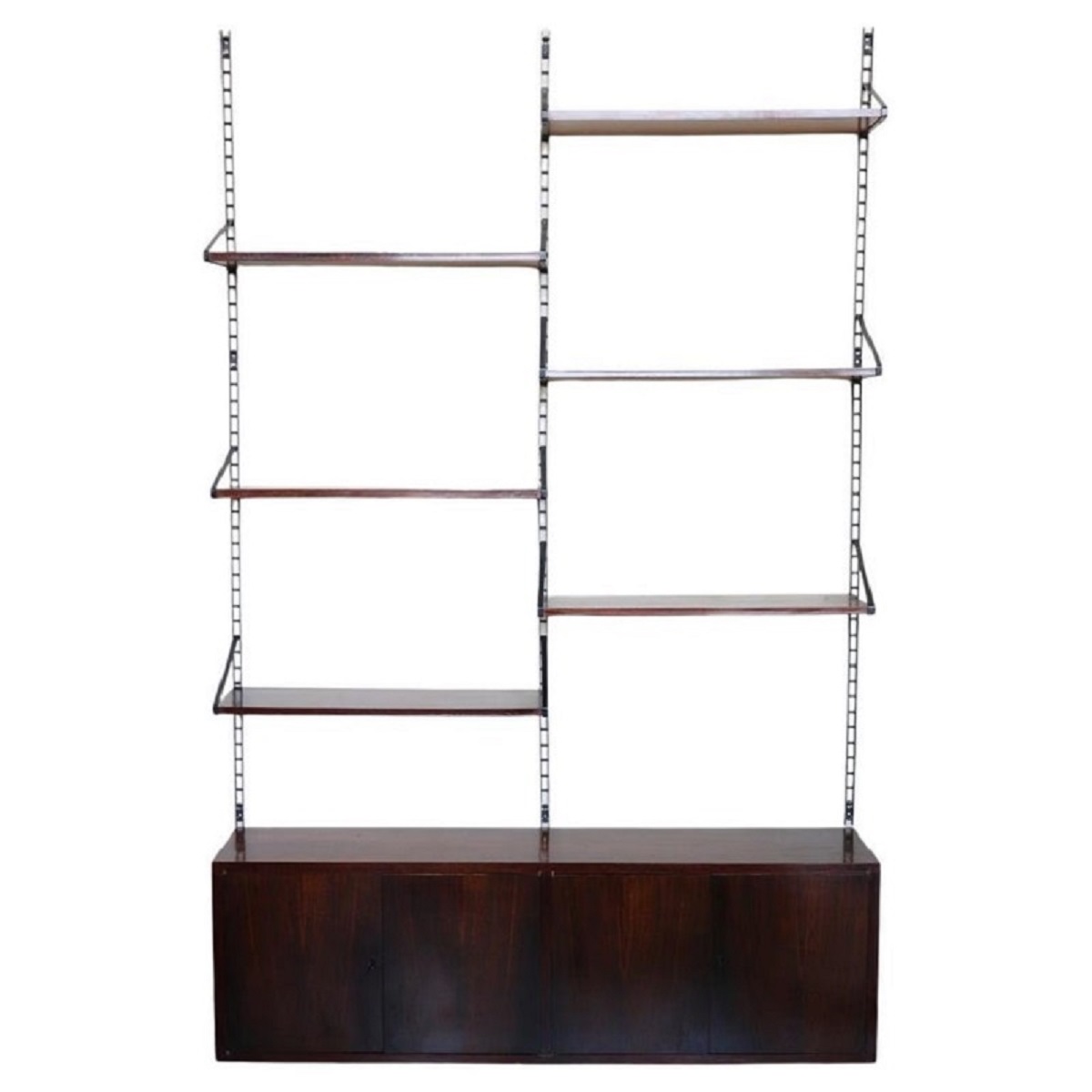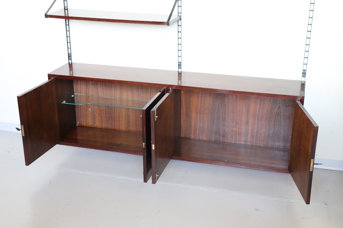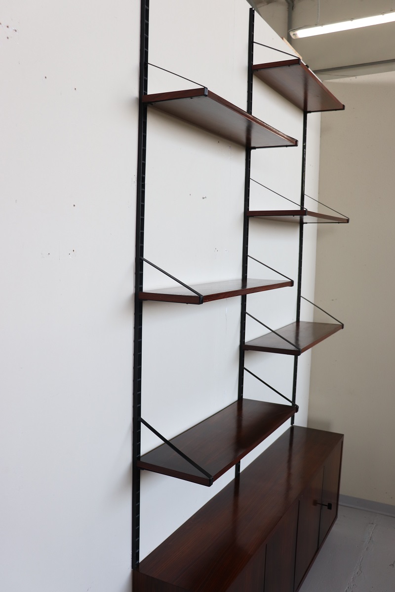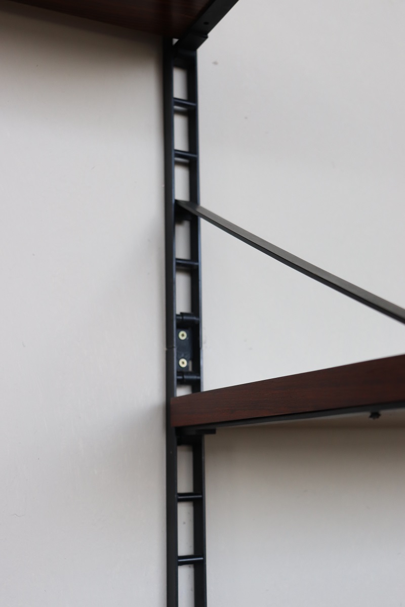This refined mid-century wall bookcase embodies the timeless elegance of 1960s Italian design. Crafted with high-quality rosewood veneer and supported by a sleek metal frame, it exudes a minimalist aesthetic that seamlessly integrates into any decor.