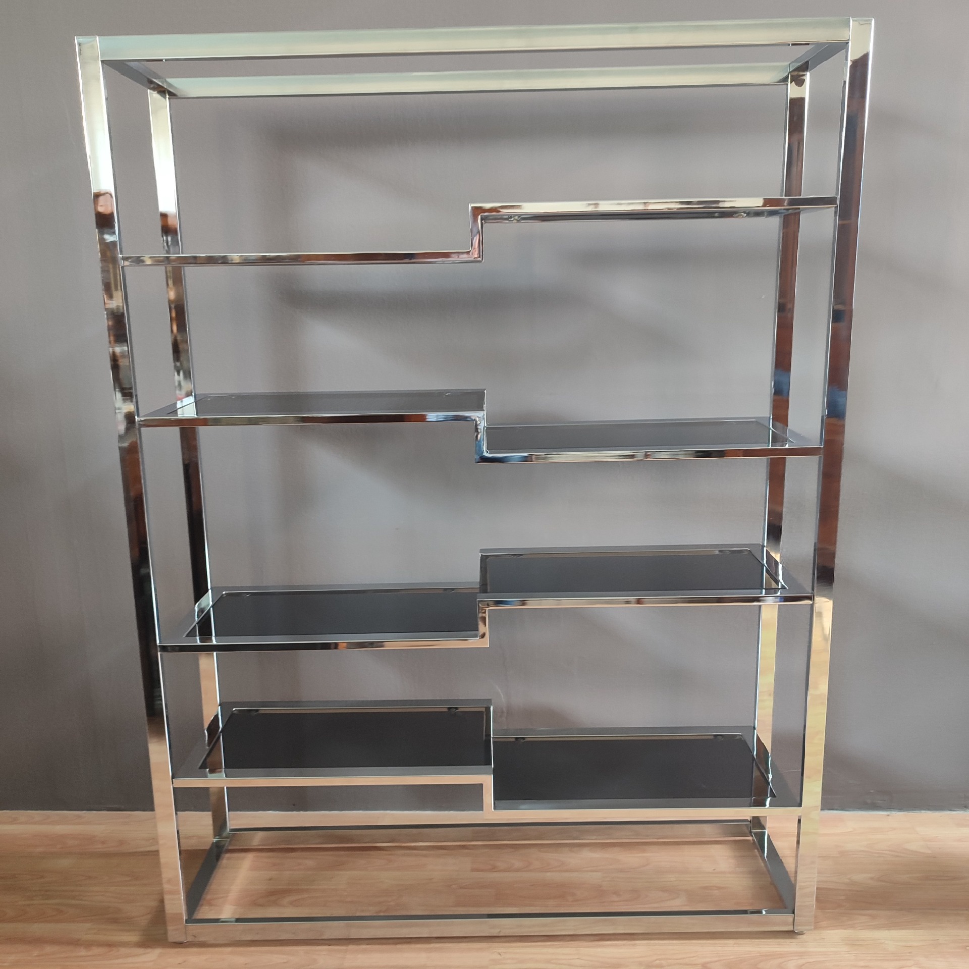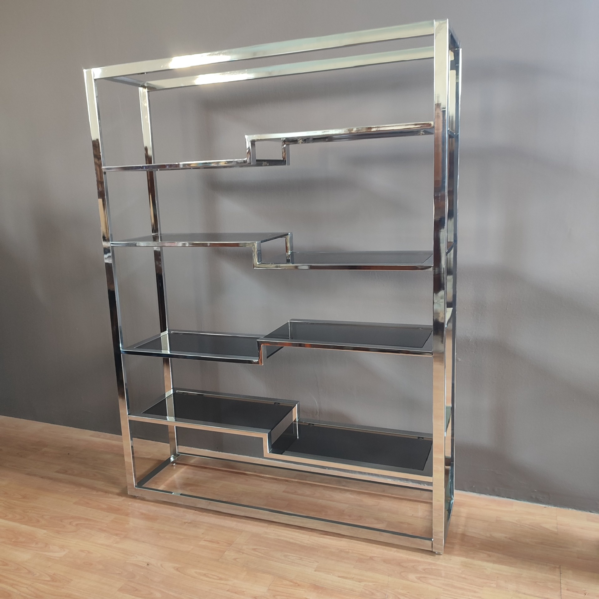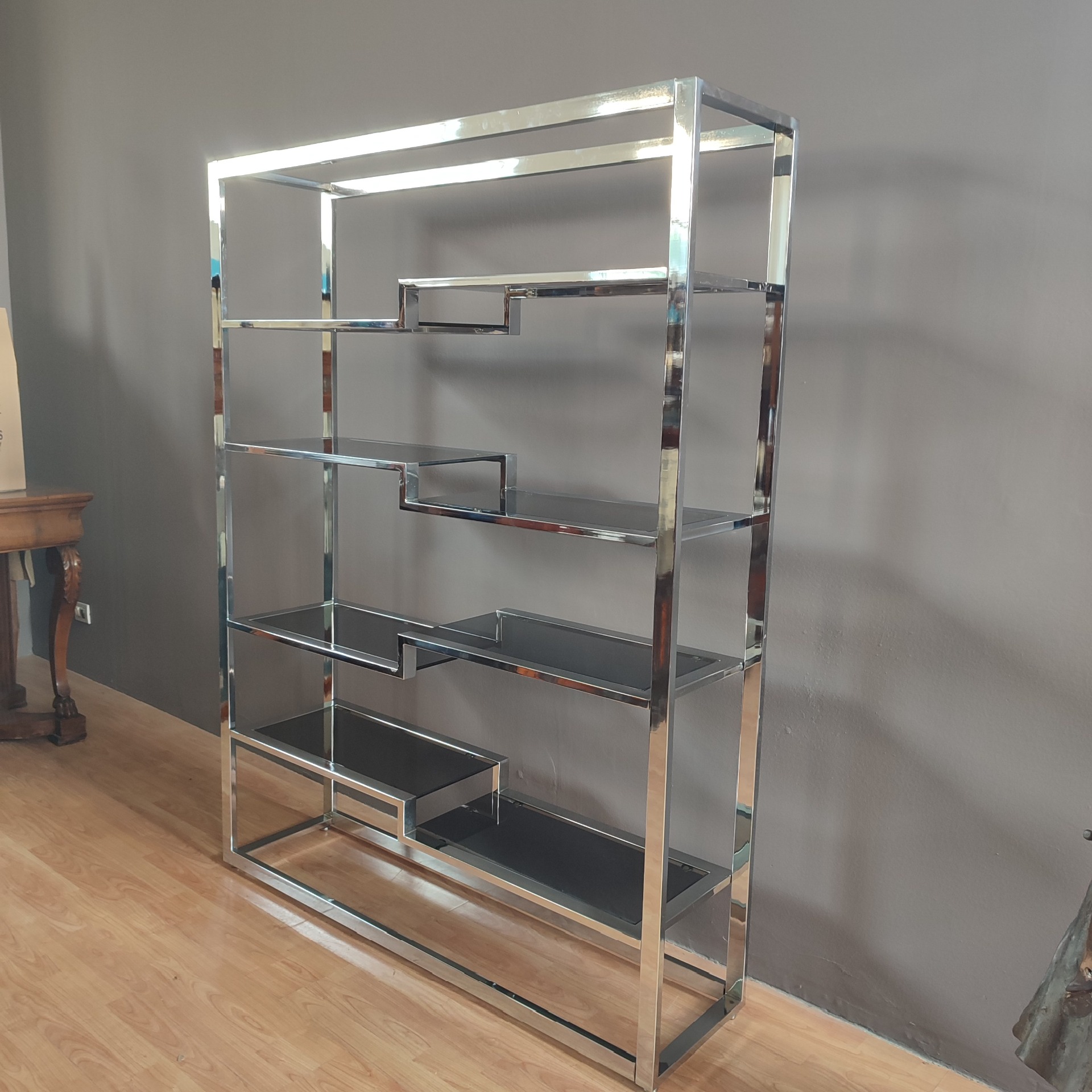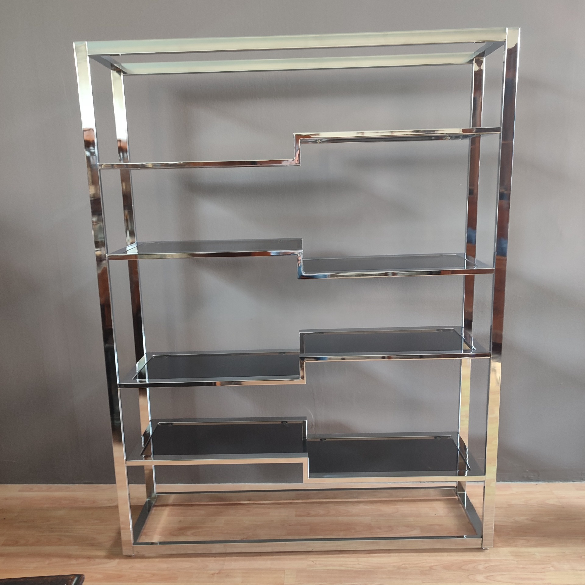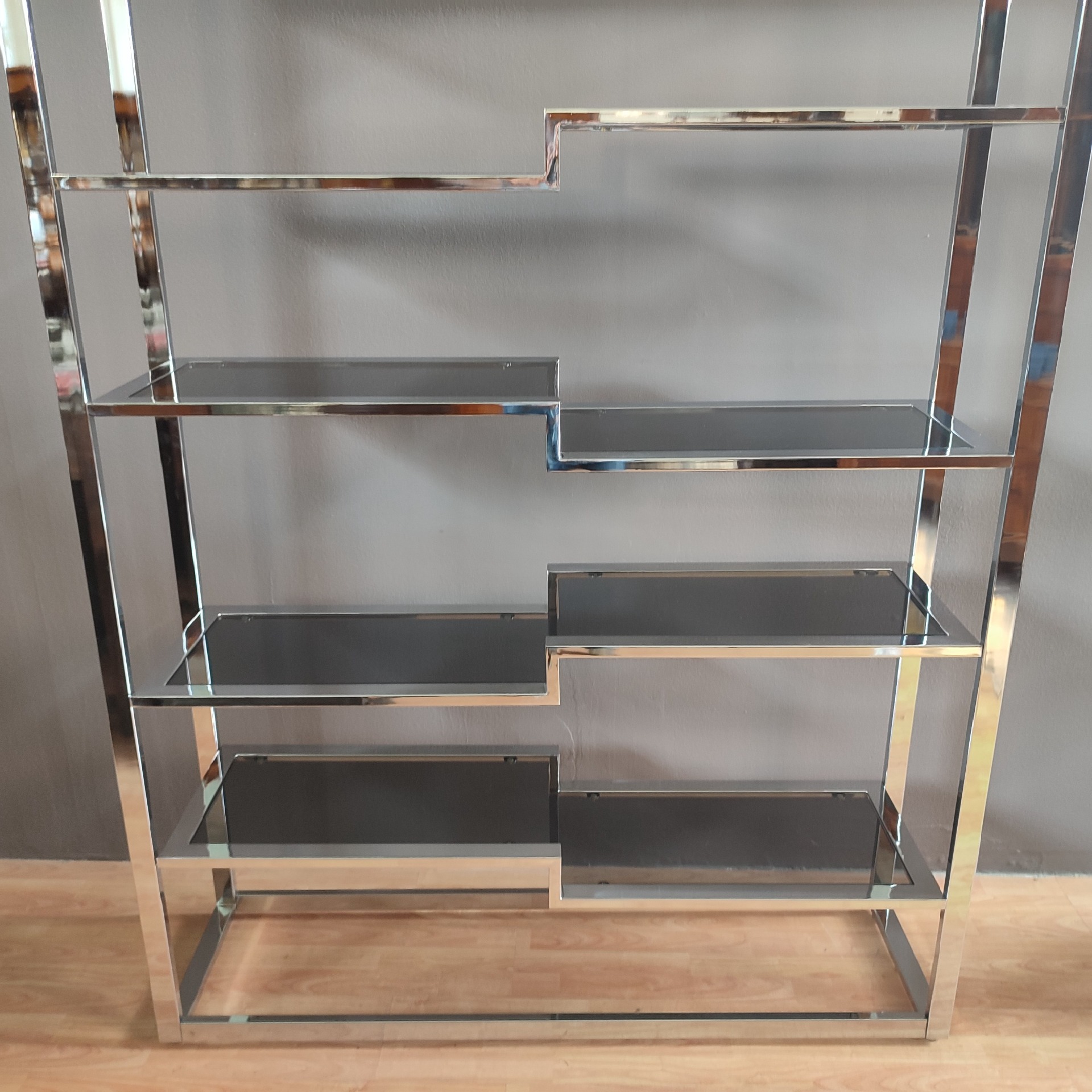 1970s bookcase with smoked glass shelves. Wear due to age. Dimensions: Width 140 cm, Depth 36 cm, Height 180 cm. We are available for photos or questions.
