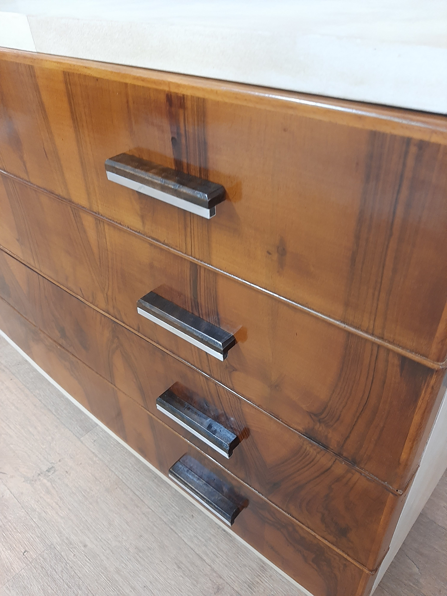Notes: Beautiful Art Deco chest of drawers from 1930-40, completely covered in parchment, excellent quality construction, recently restored in a professional conservative manner and polished with shellac.