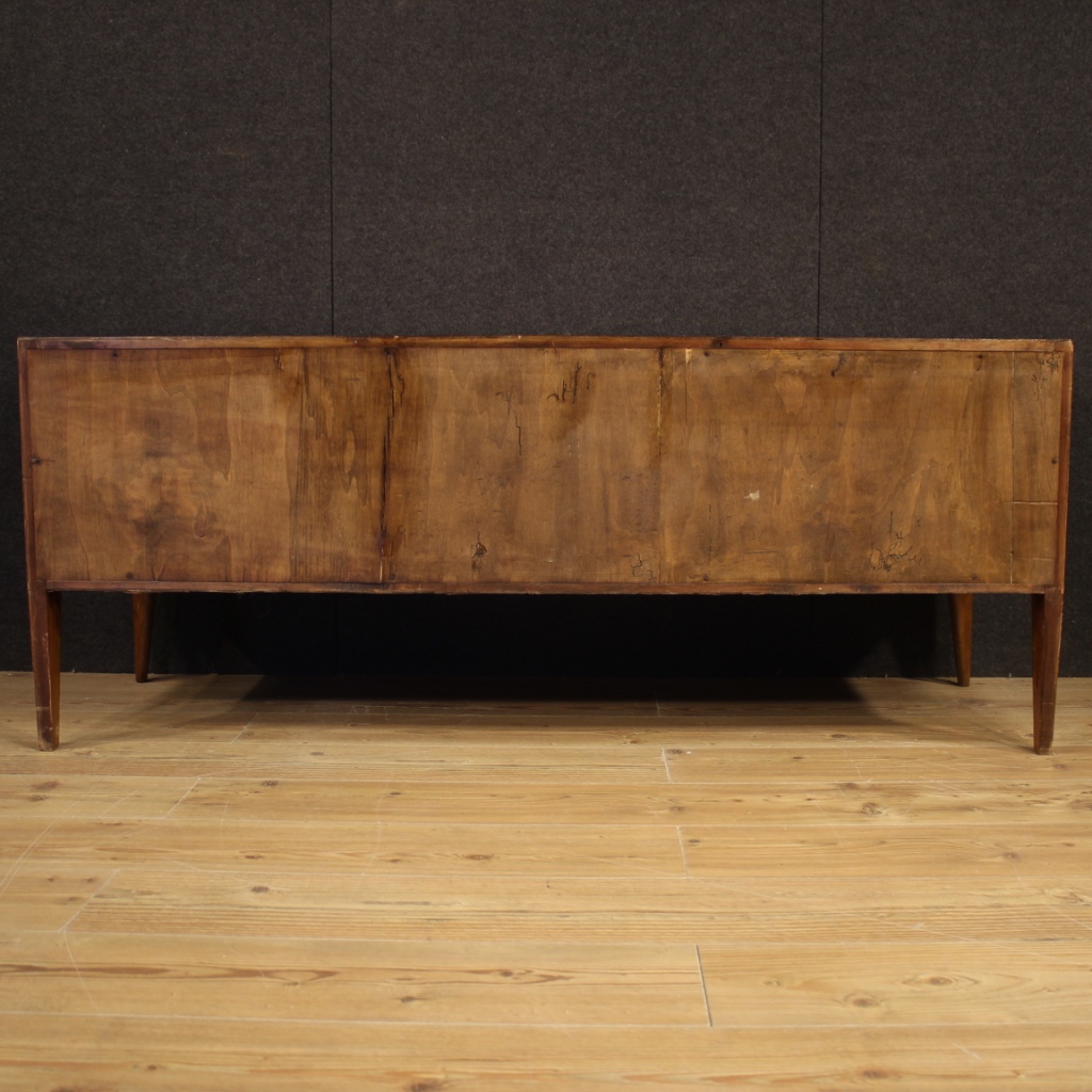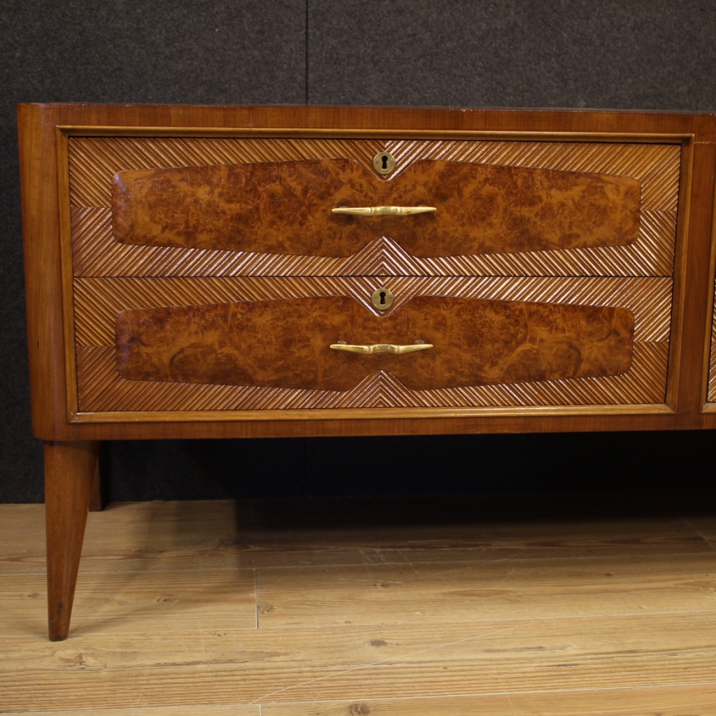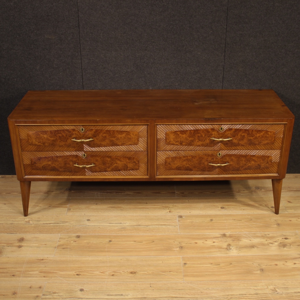 Low chest of drawers of Italian design from the 60s / 70s. Beautiful dresser carved in walnut, burl, beech and fruitwood. Furniture of particular construction, equipped with four drawers of excellent capacity with golden brass handles. Without keys, chest of drawers with wooden top in character (see photo). Furniture that can be also used as a TV stand, supported by four solid wooden legs. It shows some signs of wear, overall in good state of conservation.