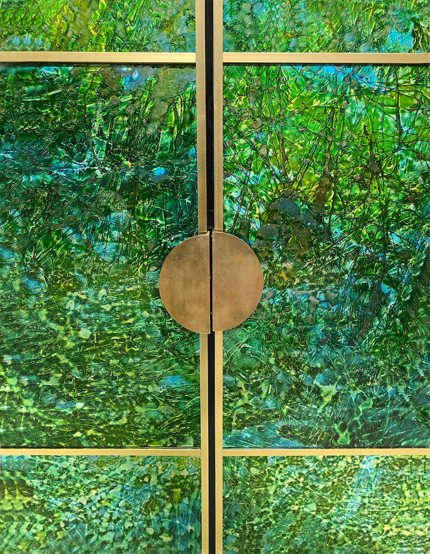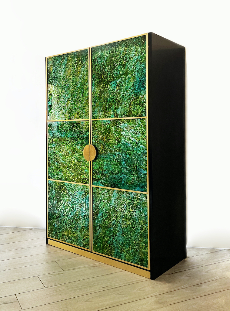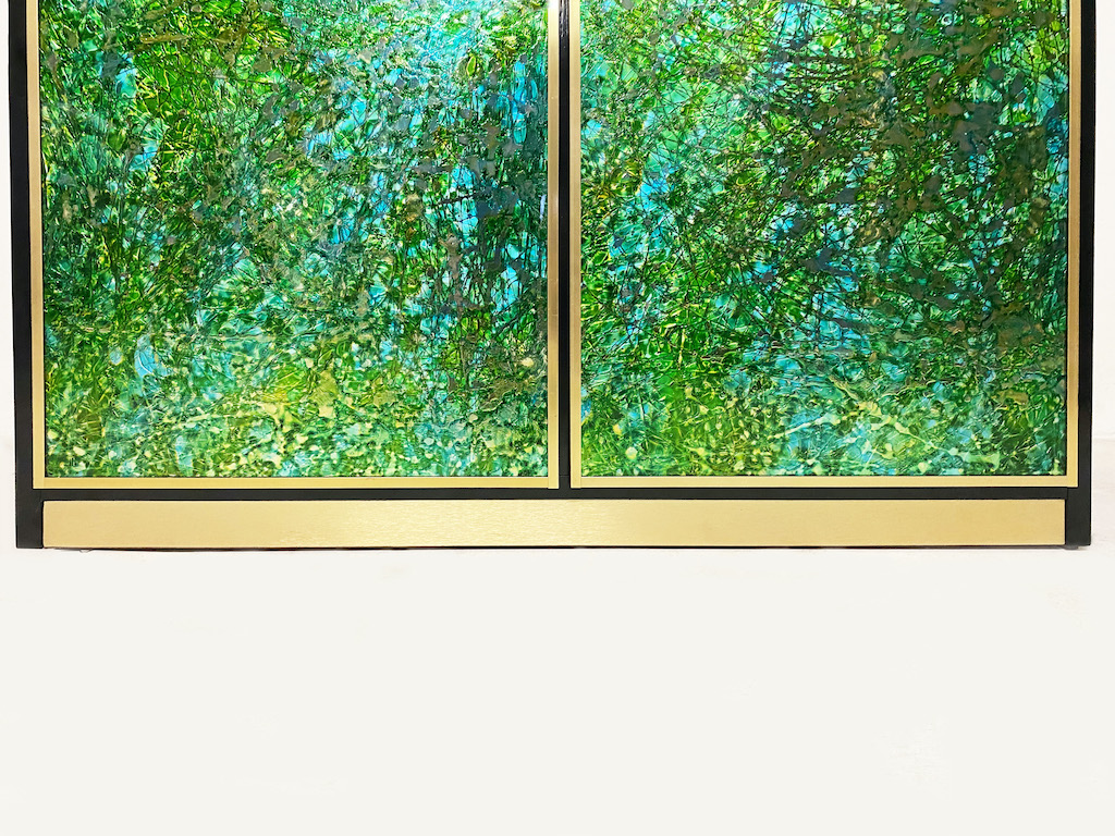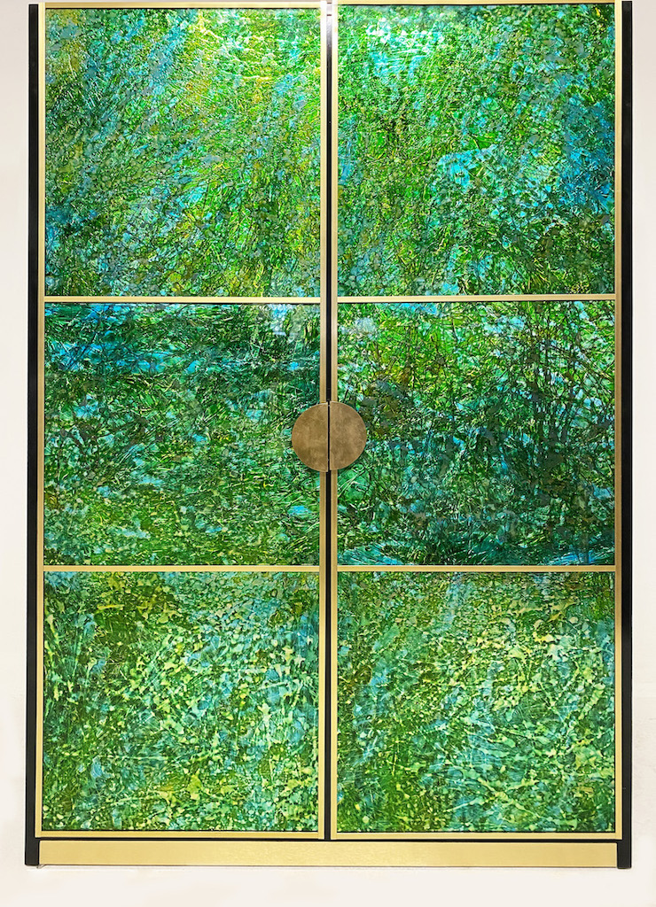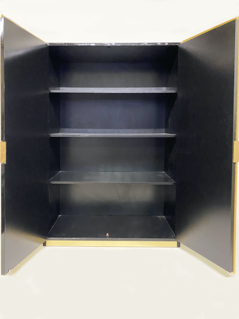 Unique 1970s vintage wardrobe cabinet with brass and stained glass doors and four internal shelves.