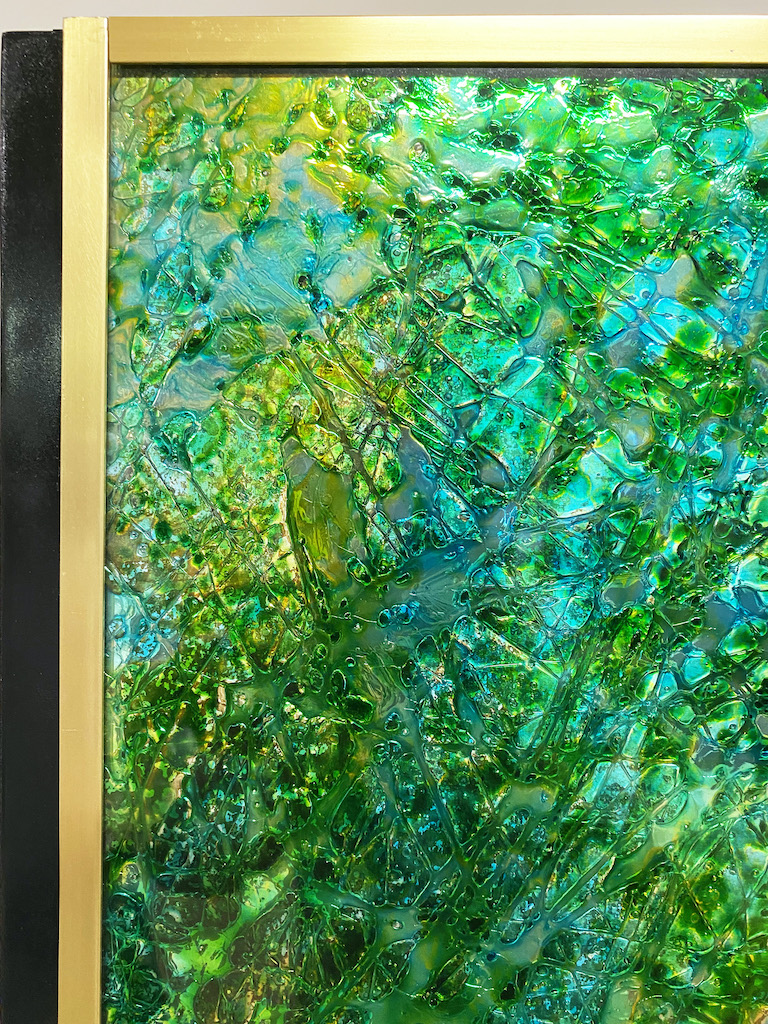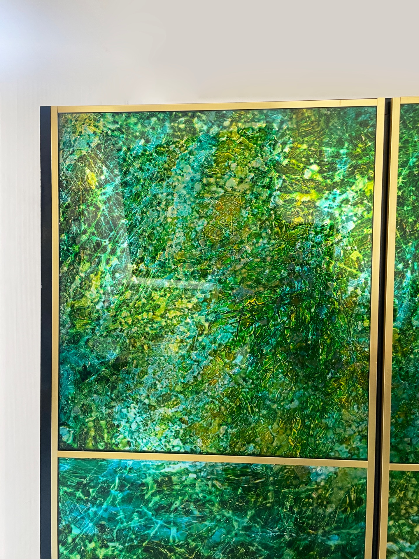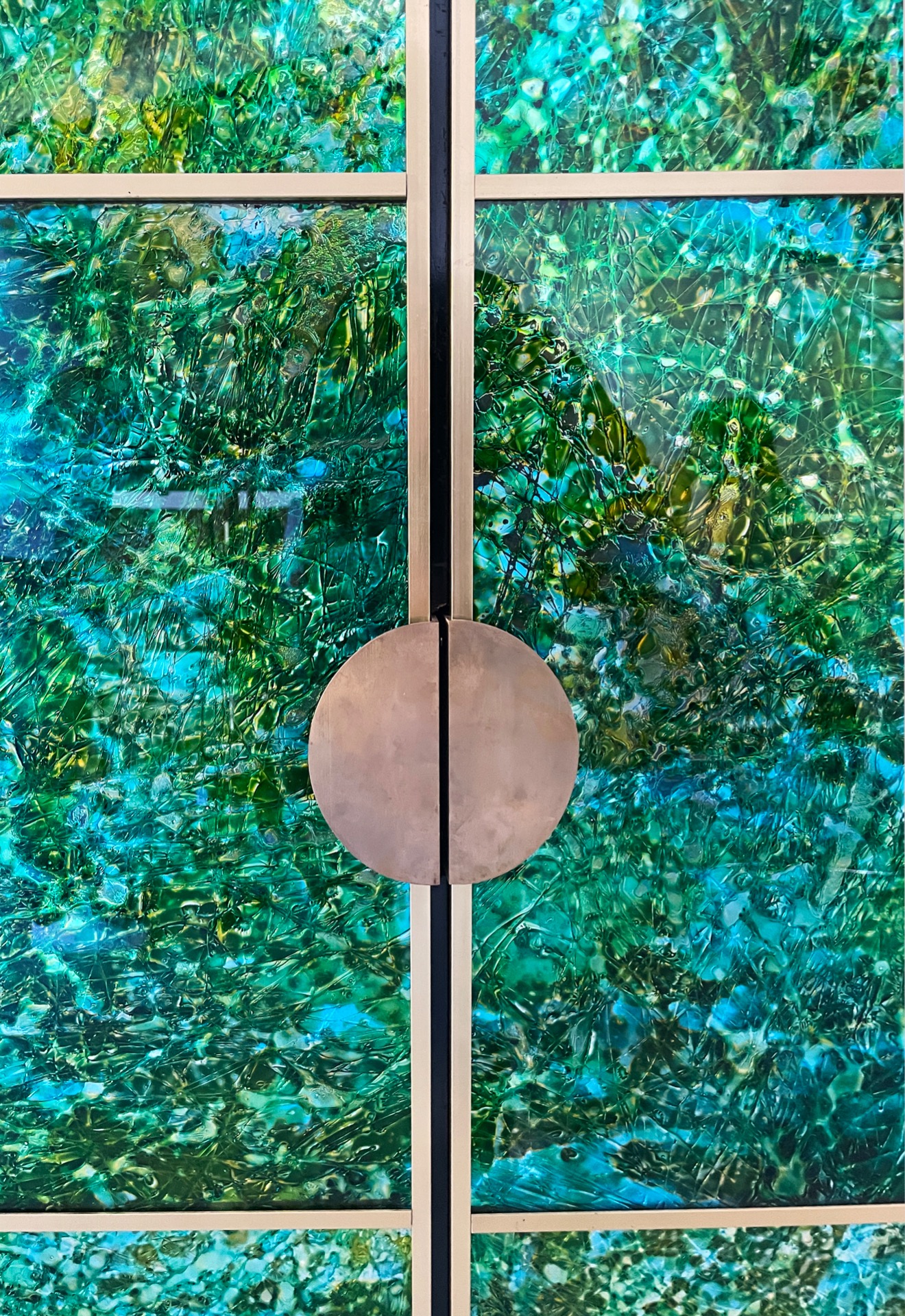 Unique 1970s vintage wardrobe cabinet with brass and stained glass doors and four internal shelves.