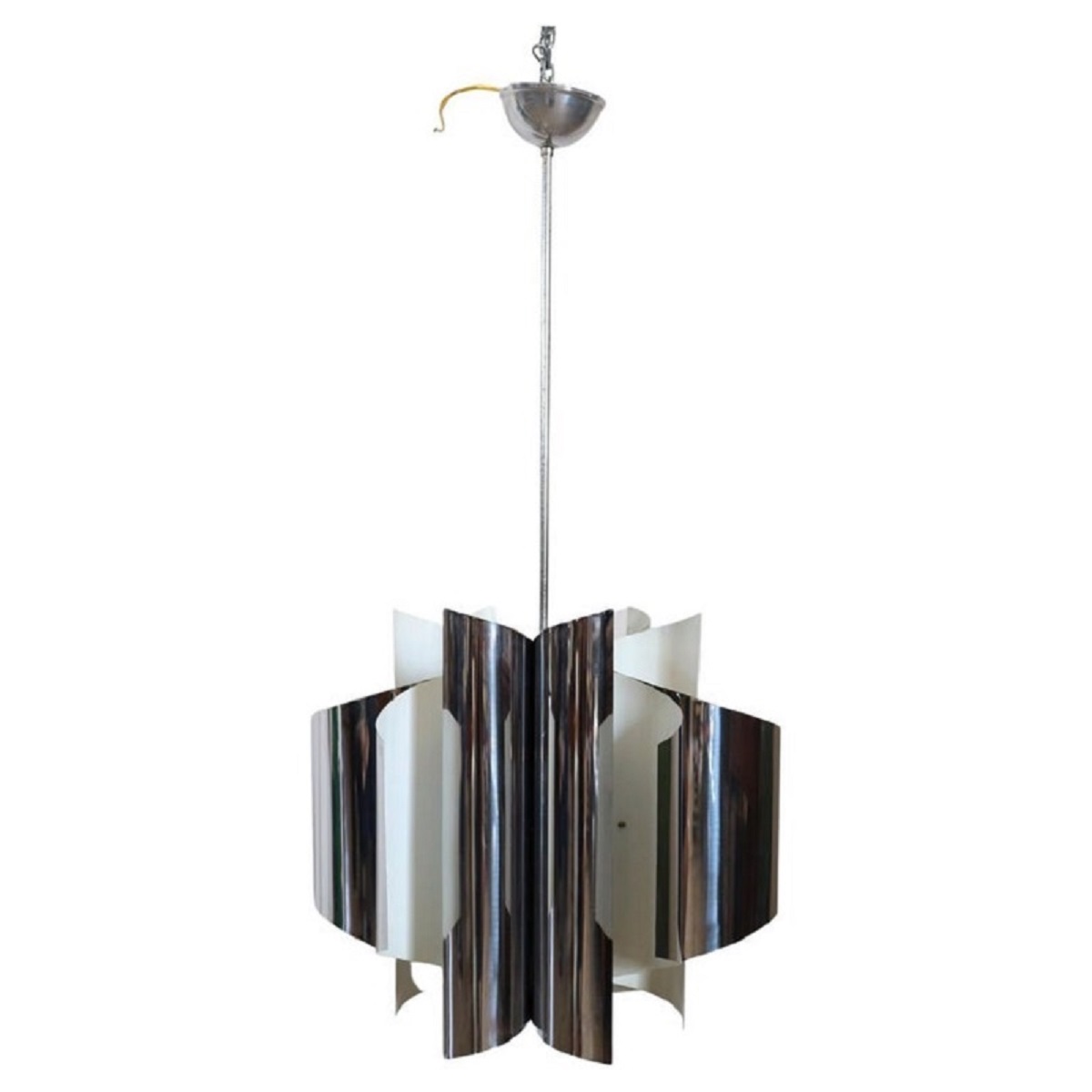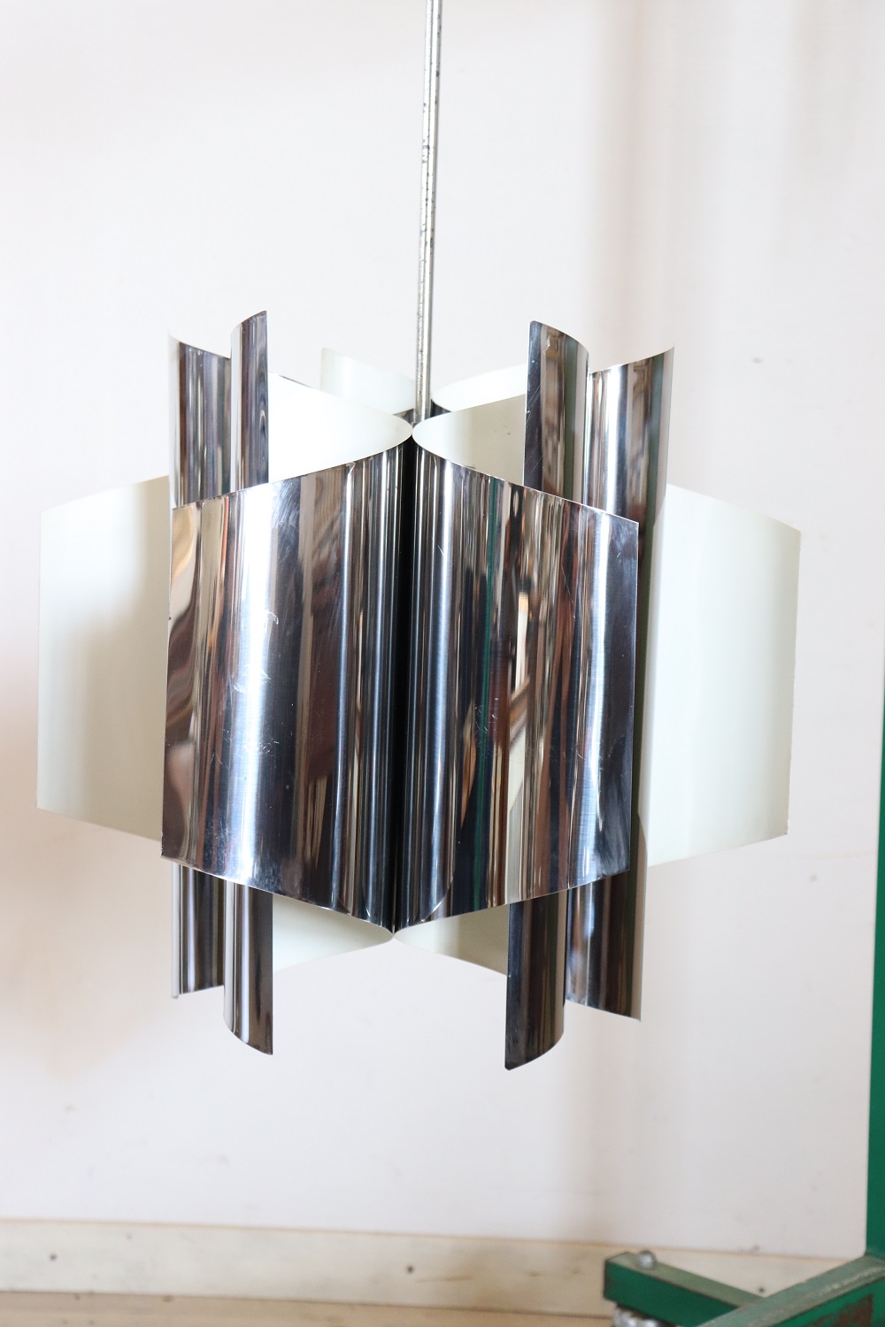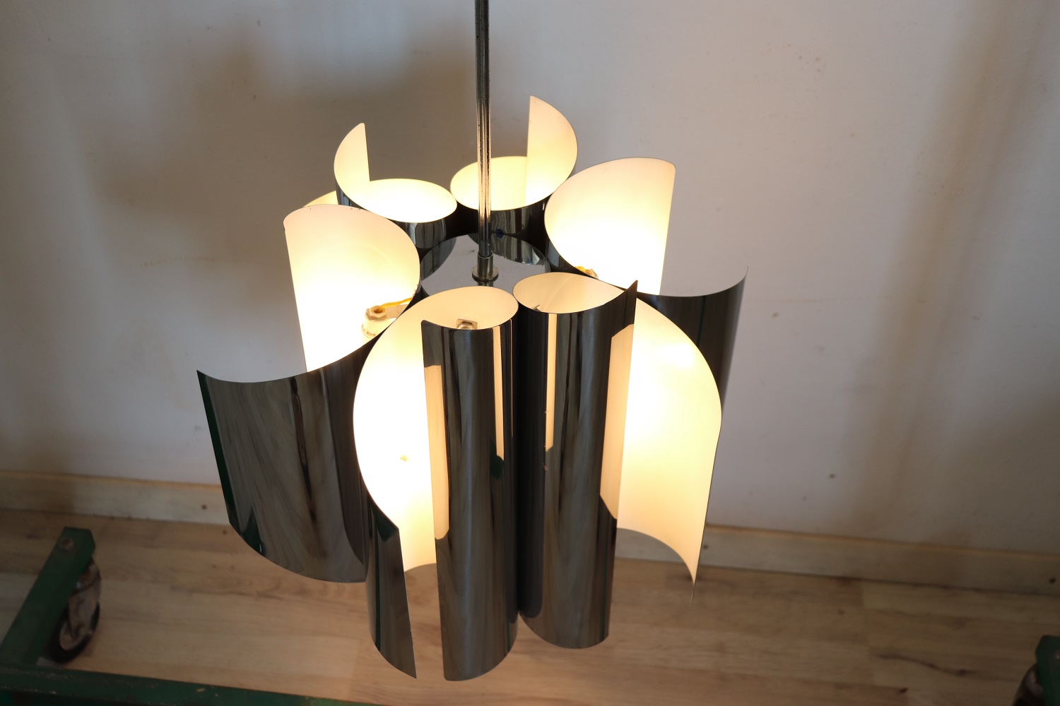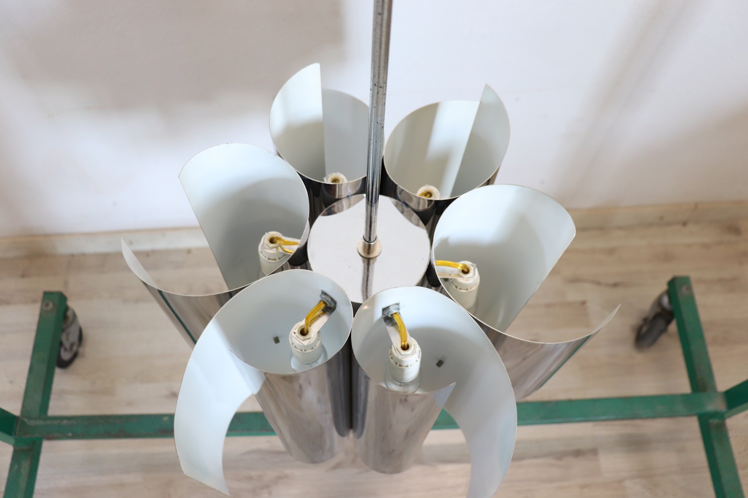 Beautiful Italian design chandelier, Space Age period, in steel with six lights, from the 1970s. Perfect and fully functional condition. Offered at a negotiable price, we invite you to send us your purchase proposals, we will gladly evaluate them. We advise you to look carefully at all the attached photos in detail.