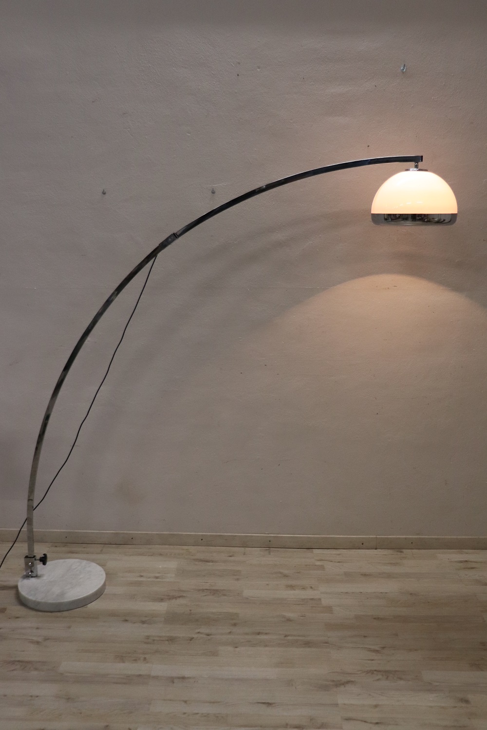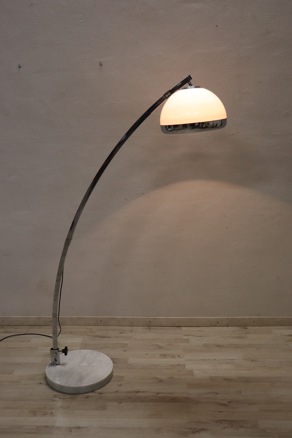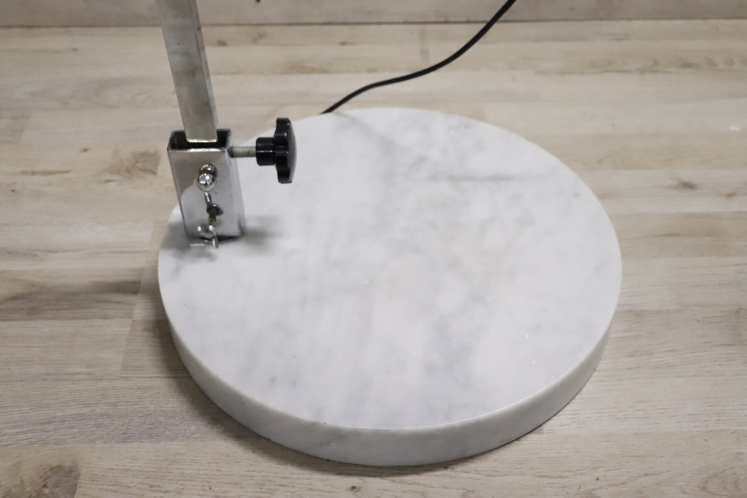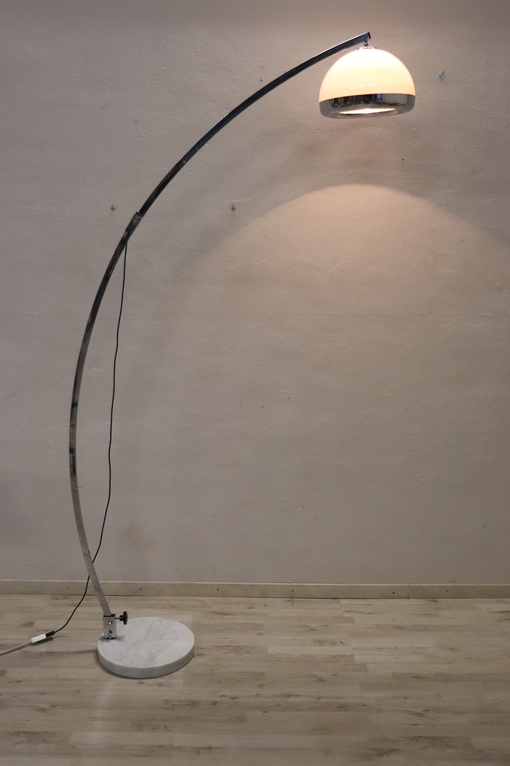 Beautiful Italian design chrome-steel arc floor lamp from the 1970s, produced by Guzzini. The lampshade is made of acrylic glass. The indicated height is the maximum, but it is possible to adjust it as desired and direct the lampshade where you want. Working. Some signs of wear. There are no brands or signatures. Very elegant, for vintage environments. Characterized by two lights and a beautiful and refined white Carrara marble base. We advise you to look closely at all the attached photos. Offered at an excellent negotiable price, we invite you to send us your purchase proposals, we will gladly evaluate them.