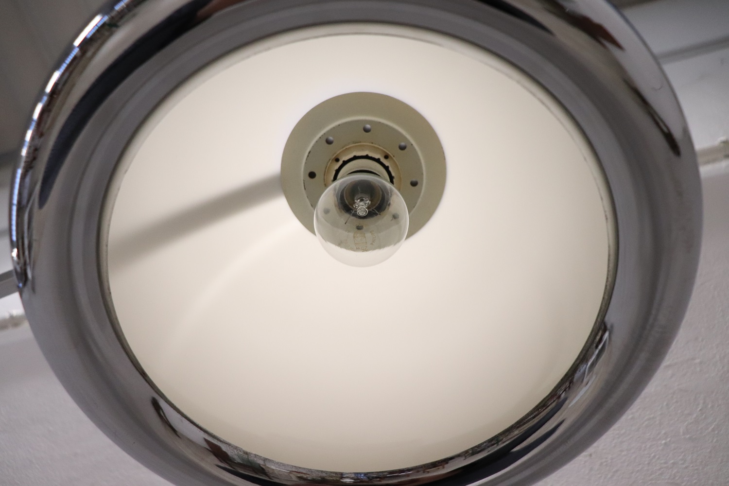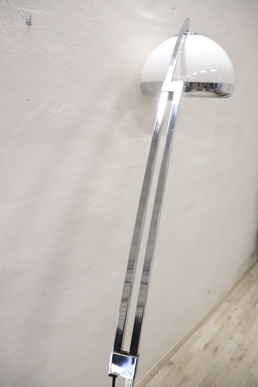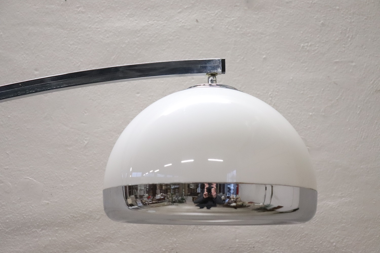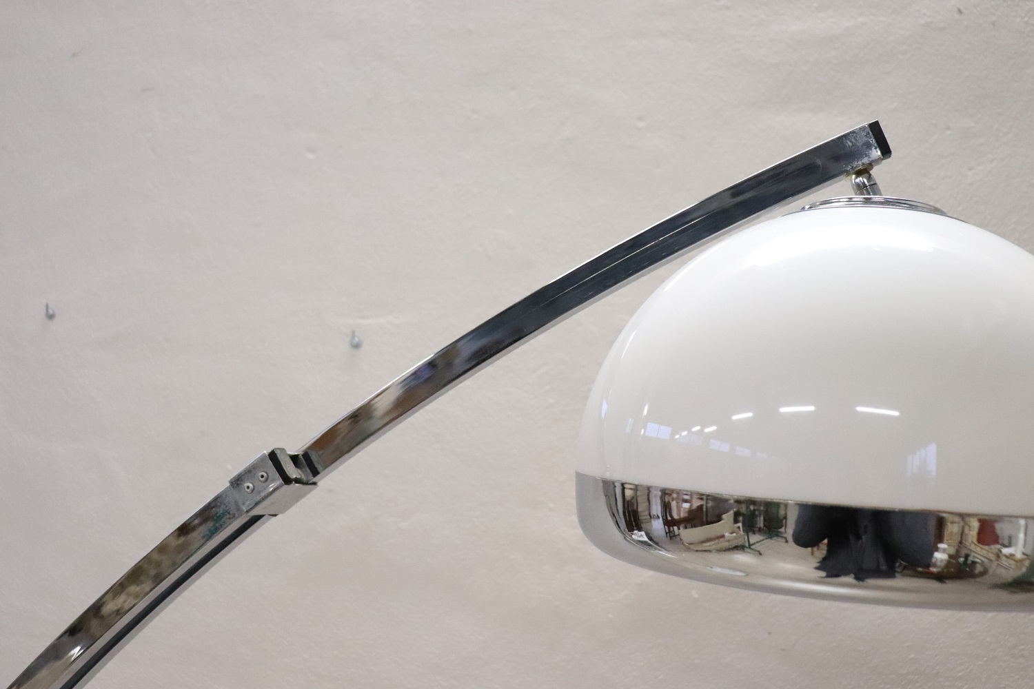 Beautiful Italian design chrome-steel arc floor lamp from the 1970s, produced by Guzzini. The lampshade is made of acrylic glass. The indicated height is the maximum, but it is possible to adjust it as desired and direct the lampshade where you want. Working. Some signs of wear. There are no brands or signatures. Very elegant, for vintage environments. Characterized by two lights and a beautiful and refined white Carrara marble base. We advise you to look closely at all the attached photos. Offered at an excellent negotiable price, we invite you to send us your purchase proposals, we will gladly evaluate them.