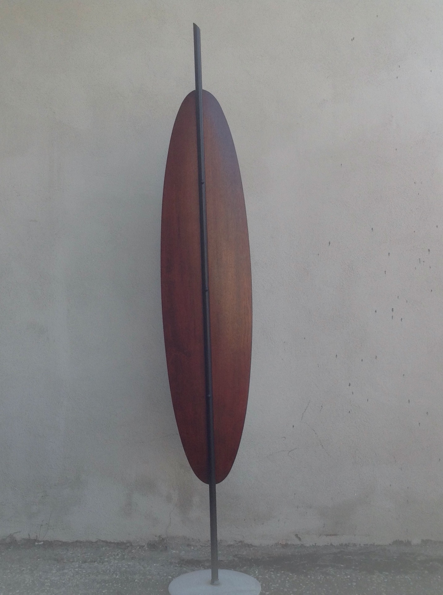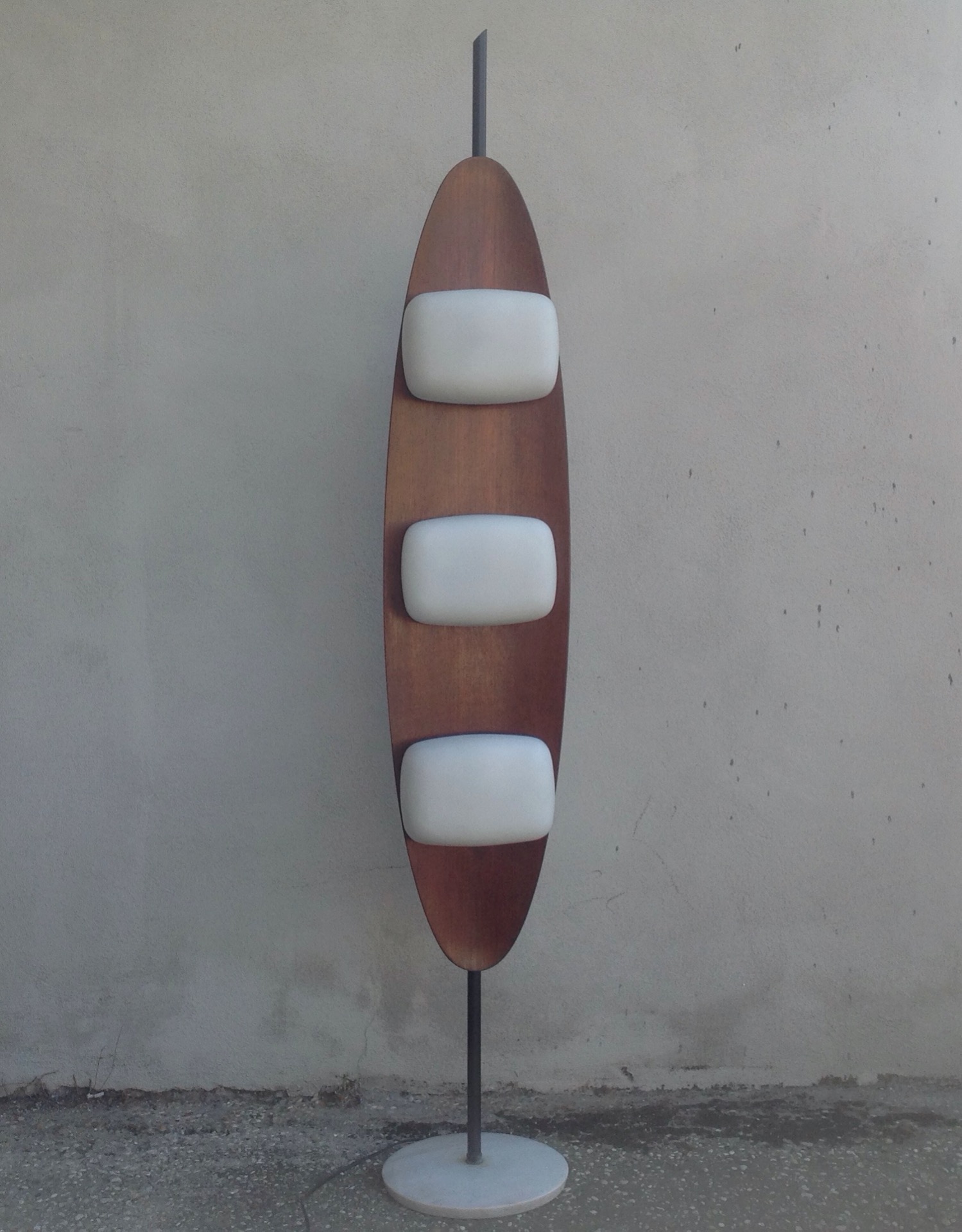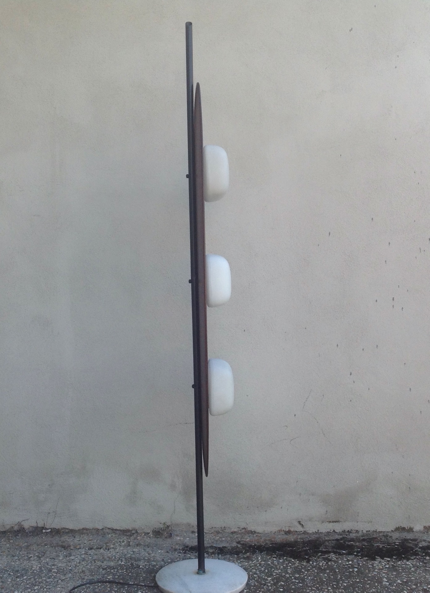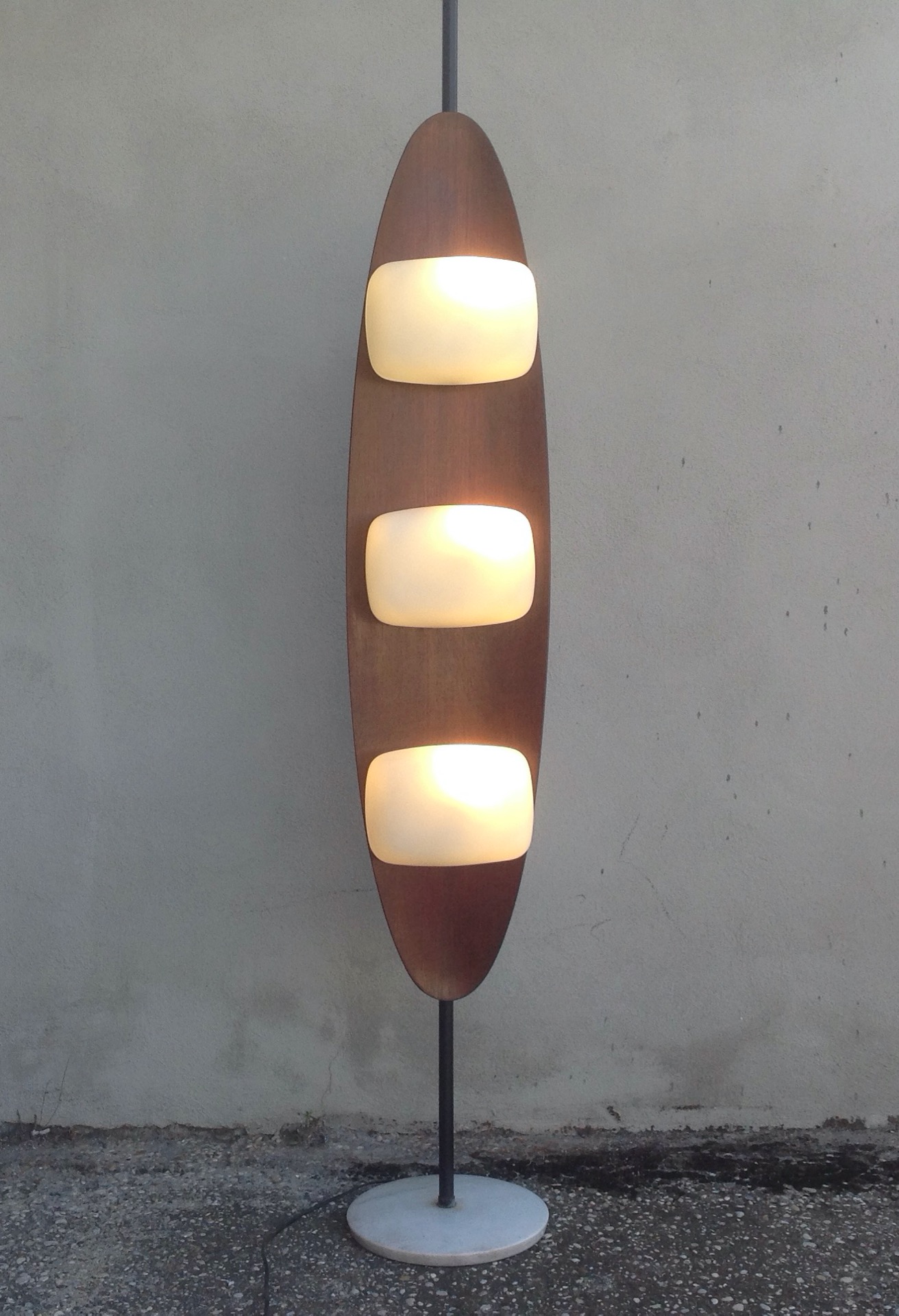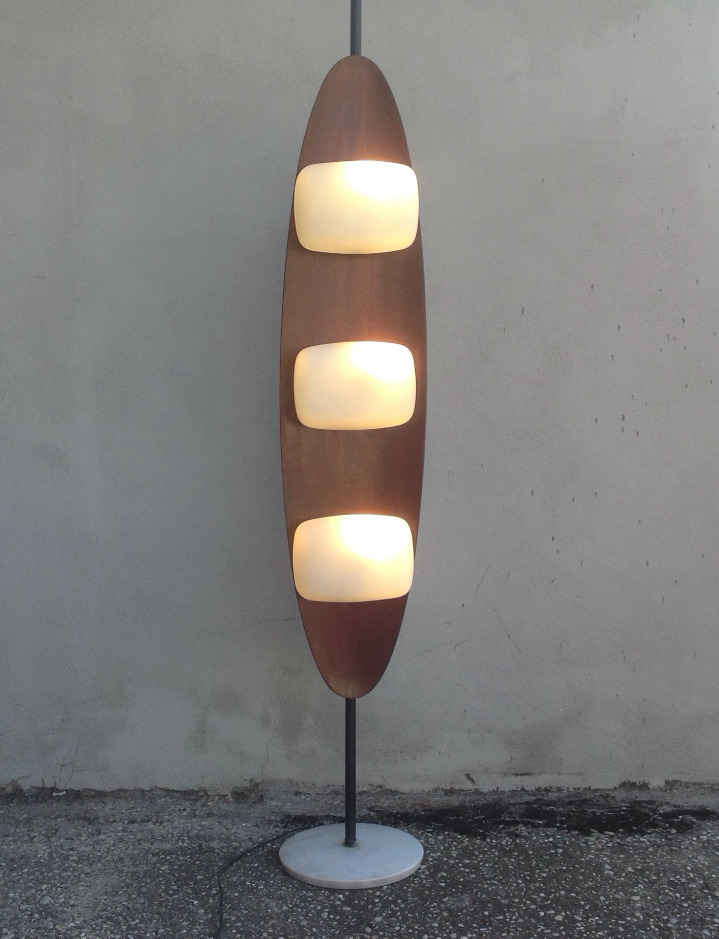 Scandinavian floor lamp, 1960s, curved plywood, metal, and marble base. Wired according to CE standards.