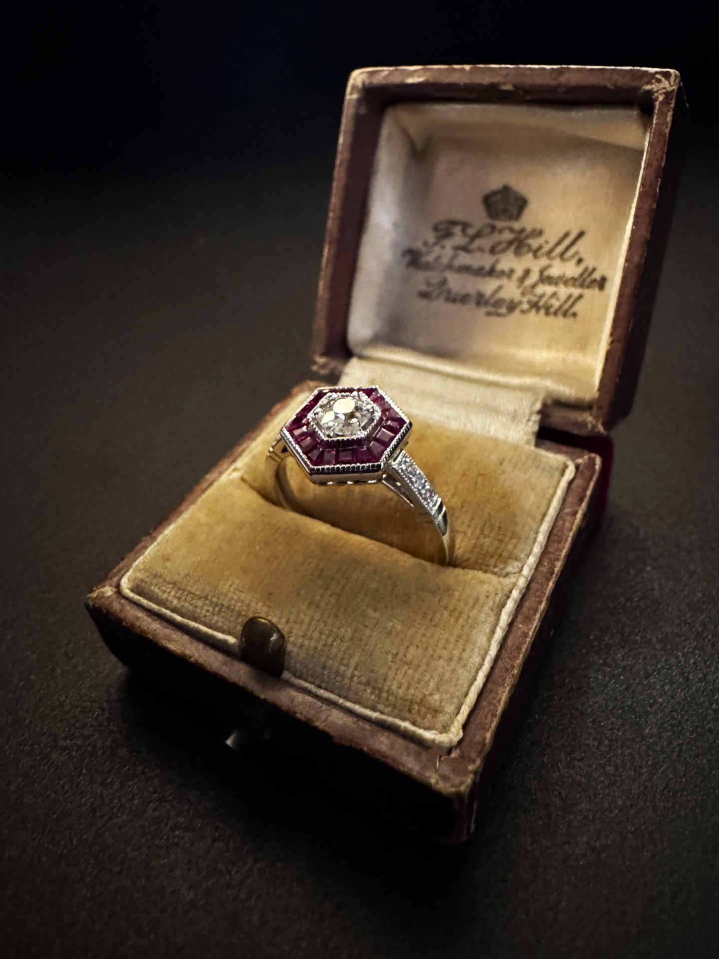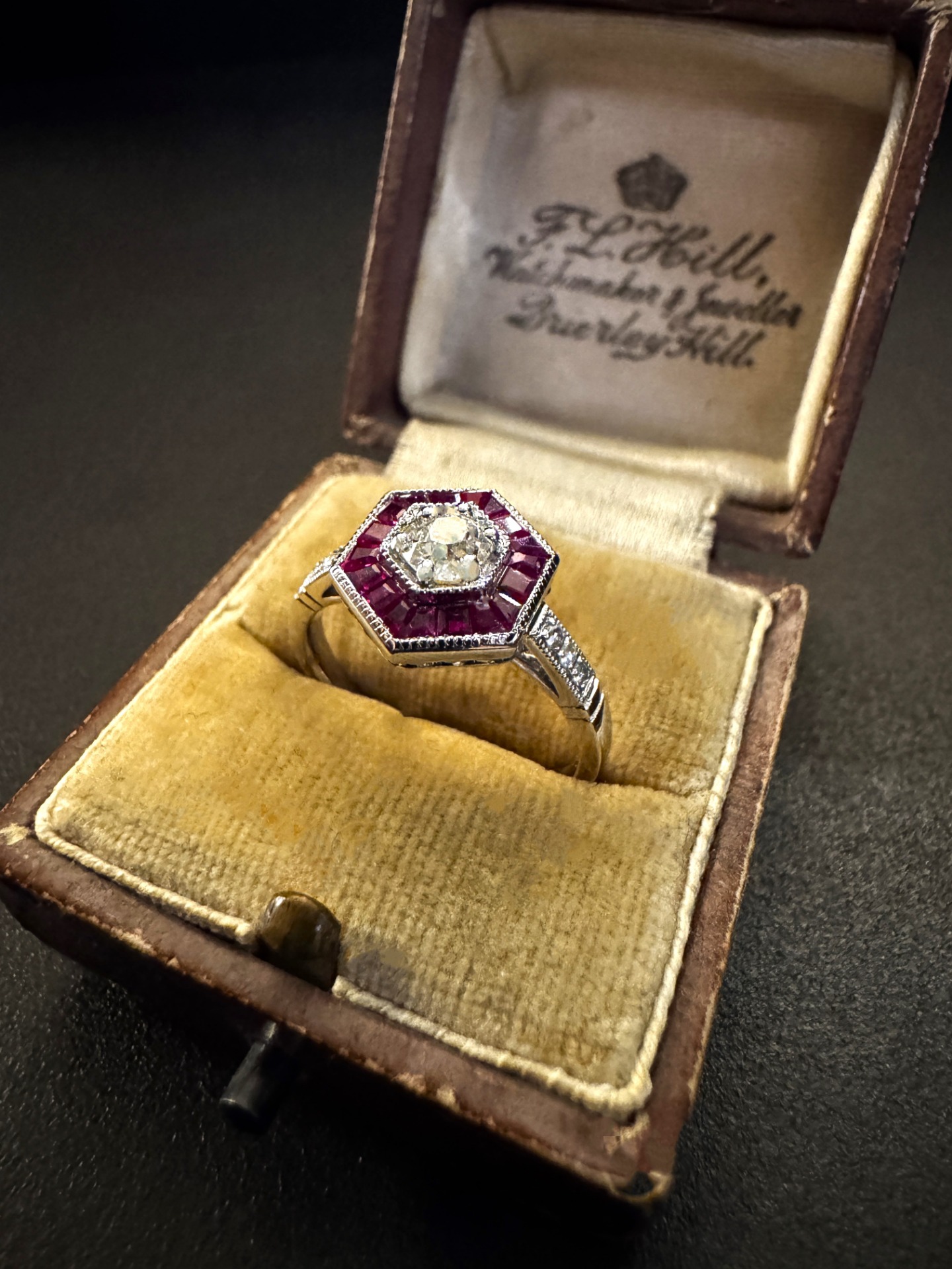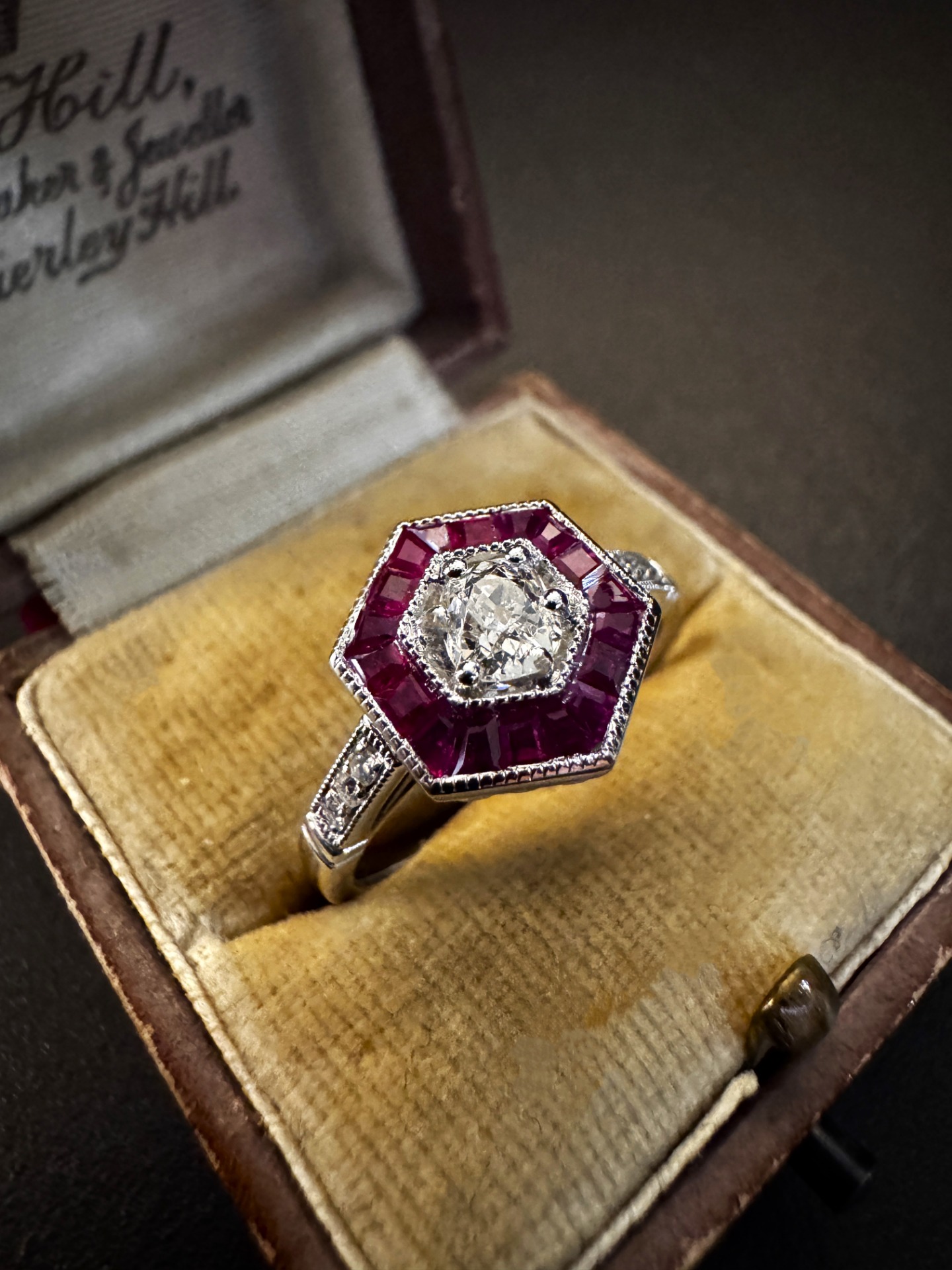 La struttura dell’anello si sviluppa attorno a una splendida montatura esagonale, un dettaglio tipico dei modelli d’ispirazione Déco, progettata per esaltare le linee geometriche.