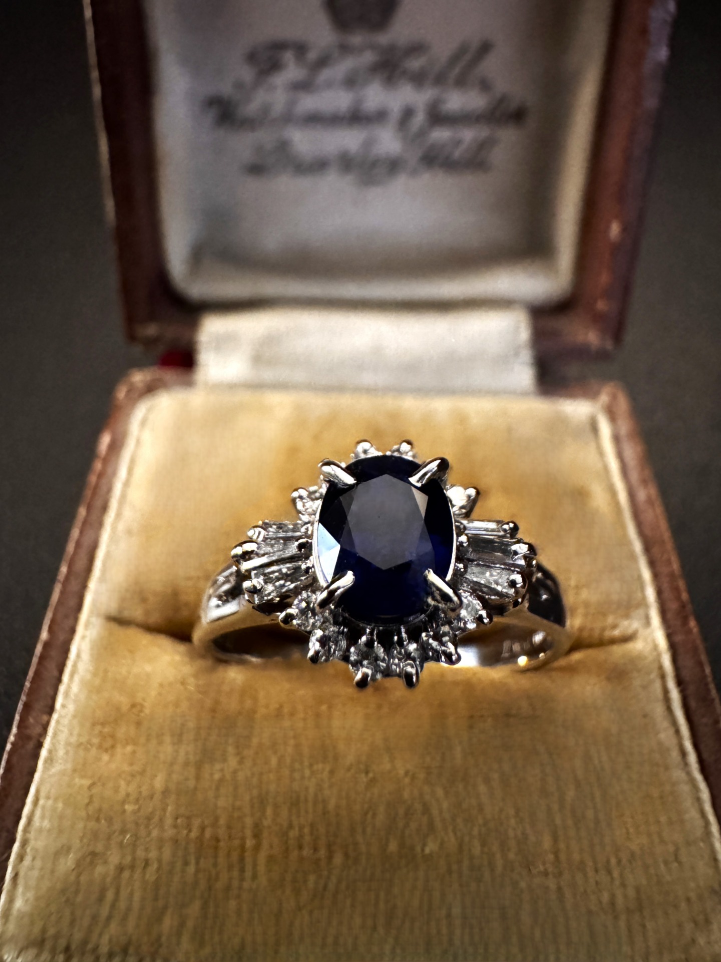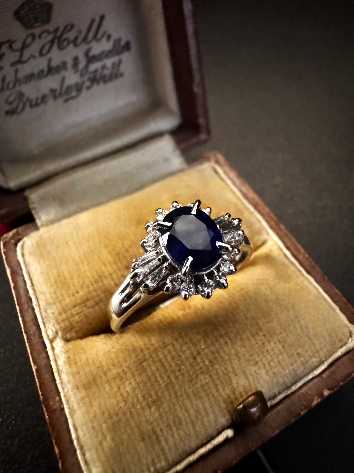 Anello Vintage in Platino con Zaffiro e Diamanti – Splendore Anni ’70