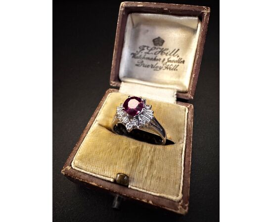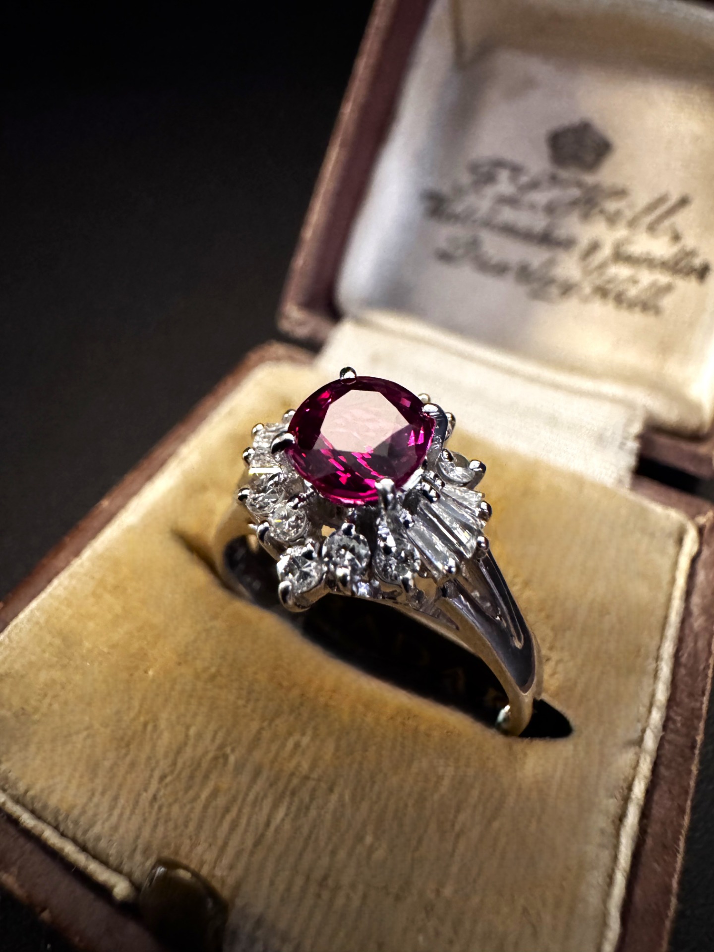 Anello in Platino Anni '70 – Design Unico e Raffinato Un gioiello dal fascino esclusivo, perfetto per chi ama dettagli unici e sofisticati. Eleganza e Design Ricercato Questo splendido anello in platino, di provenienza americana e risalente agli anni '70, si distingue per la sua forma armoniosa. E anche per l’accostamento di pietre in diversi tagli, sapientemente montate per esaltarne la bellezza. Dettagli Preziosi     • Pietra Centrale: Rubino naturale taglio brillante rotondo, dal colore intenso, 0.83 ct circa     • Contorno: Diamanti naturali taglio brillante rotondo e baguette, per un totale di 0.30 ct circa     • Materiale: Platino Un Gioiello di Stile Senza Tempo La particolare montatura e il raffinato abbinamento dei vari tagli delle pietre rendono questo anello un capolavoro di design e maestria artigianale. Ideale per chi cerca un gioiello unico ed elegante.