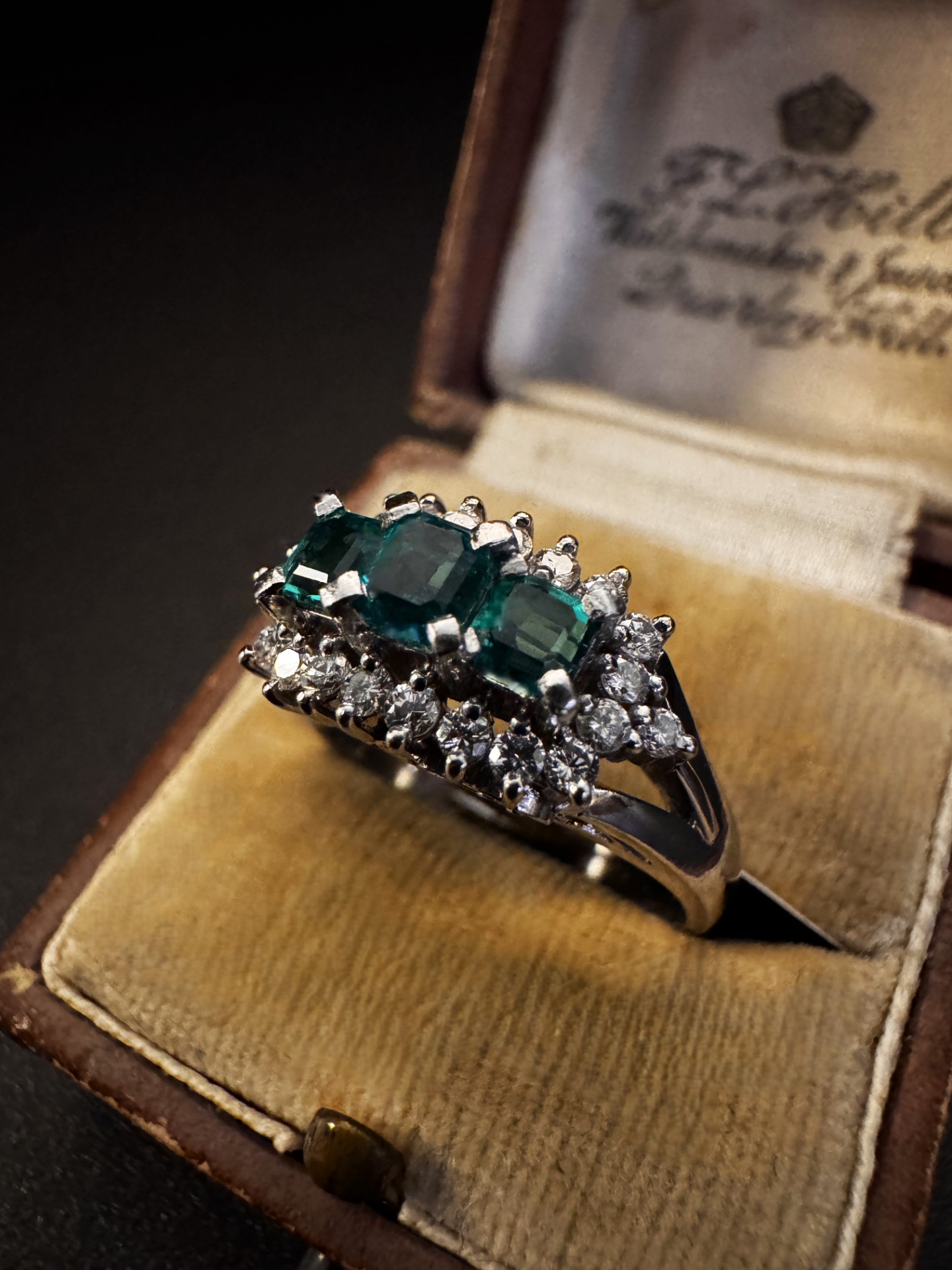 Tre Smeraldi taglio ottagonale, dal tono verde profondo e seducente, sono disposti in una composizione perfettamente bilanciata.