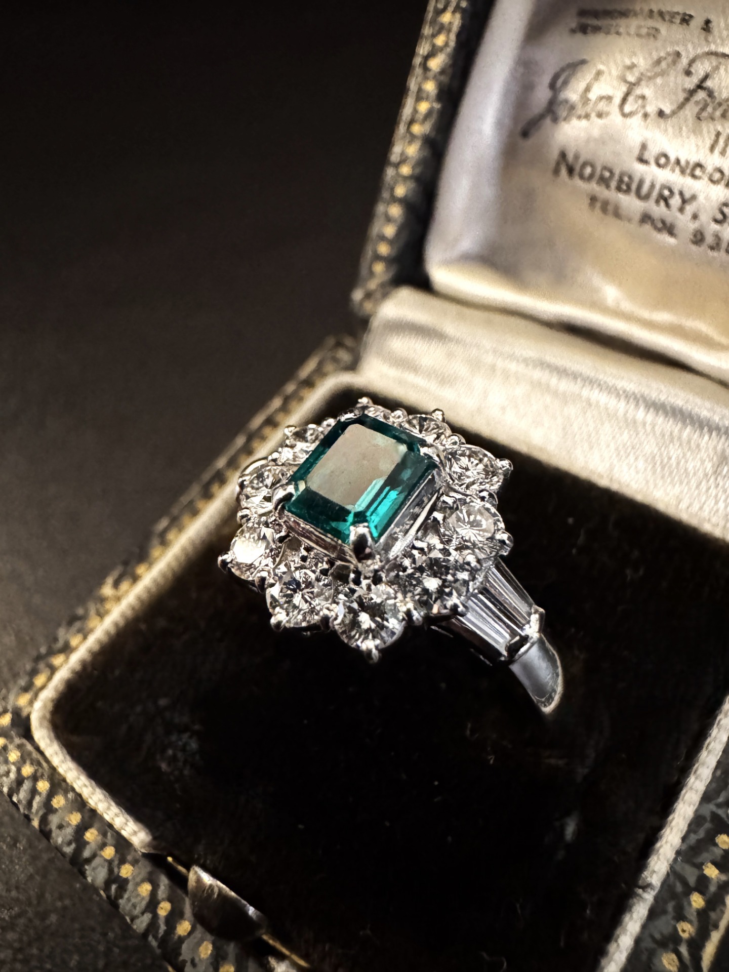 In quest’epoca di innovazione e stile, l’America diede vita a creazioni che fondevano eleganza scultorea e armonia cromatica, come questo straordinario anello in platino con smeraldo e diamanti.