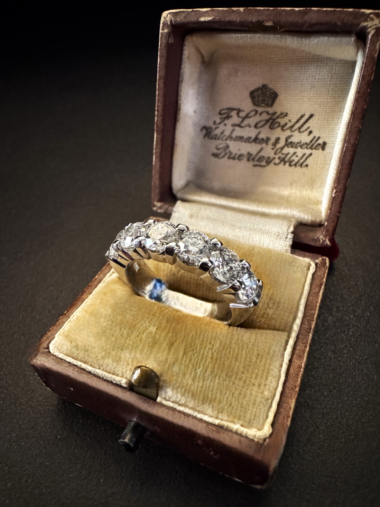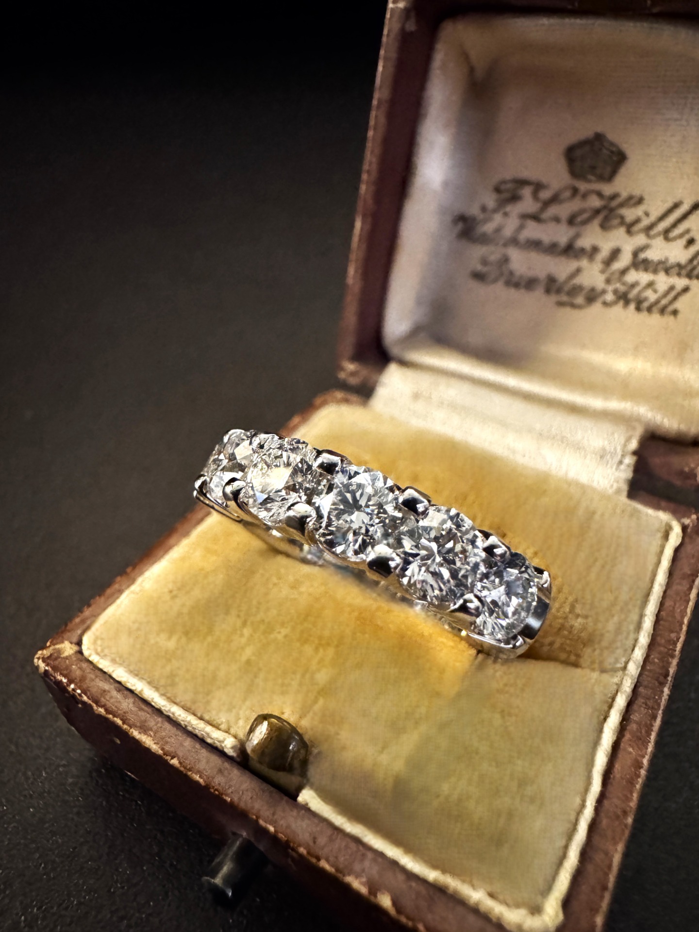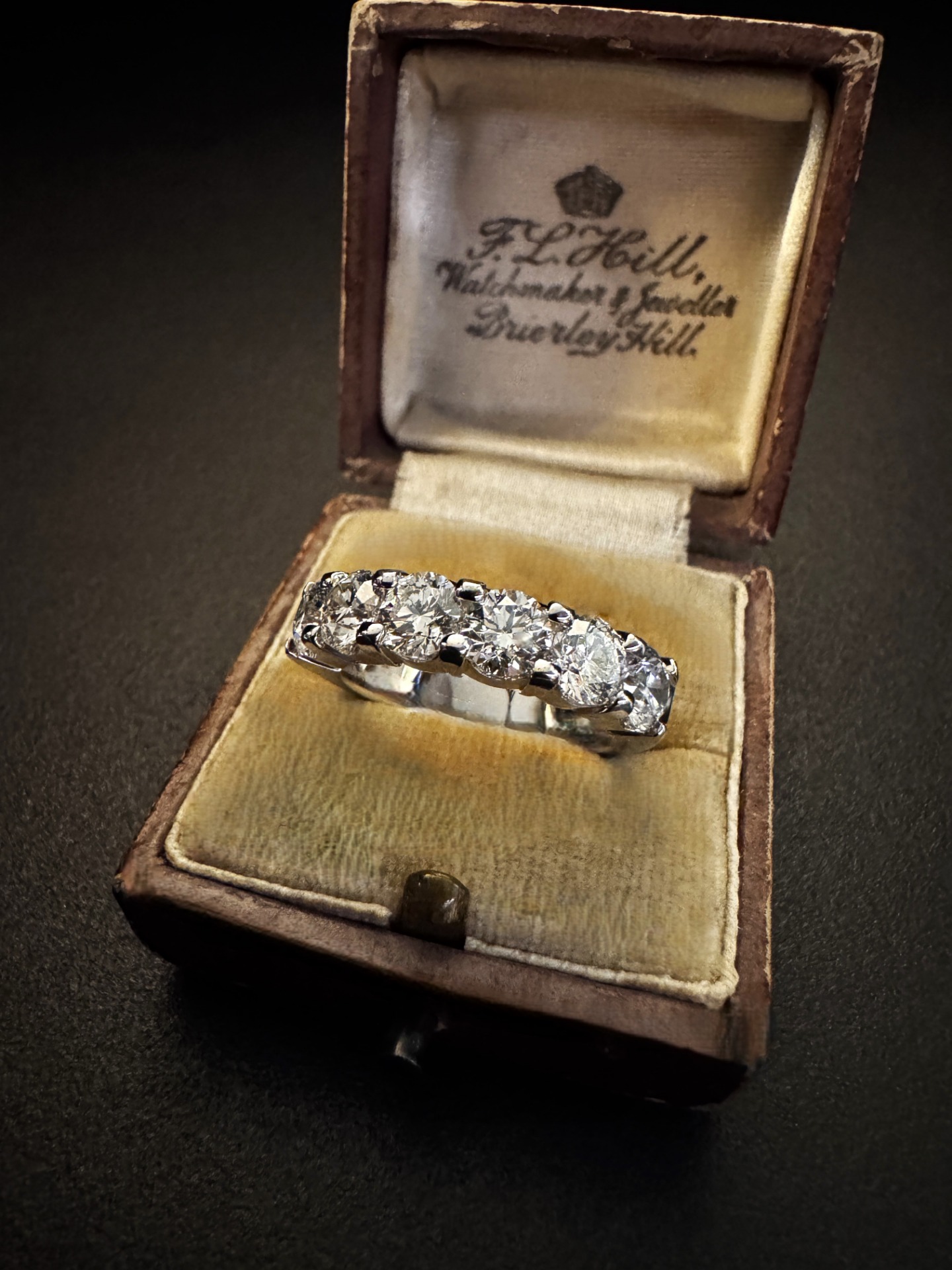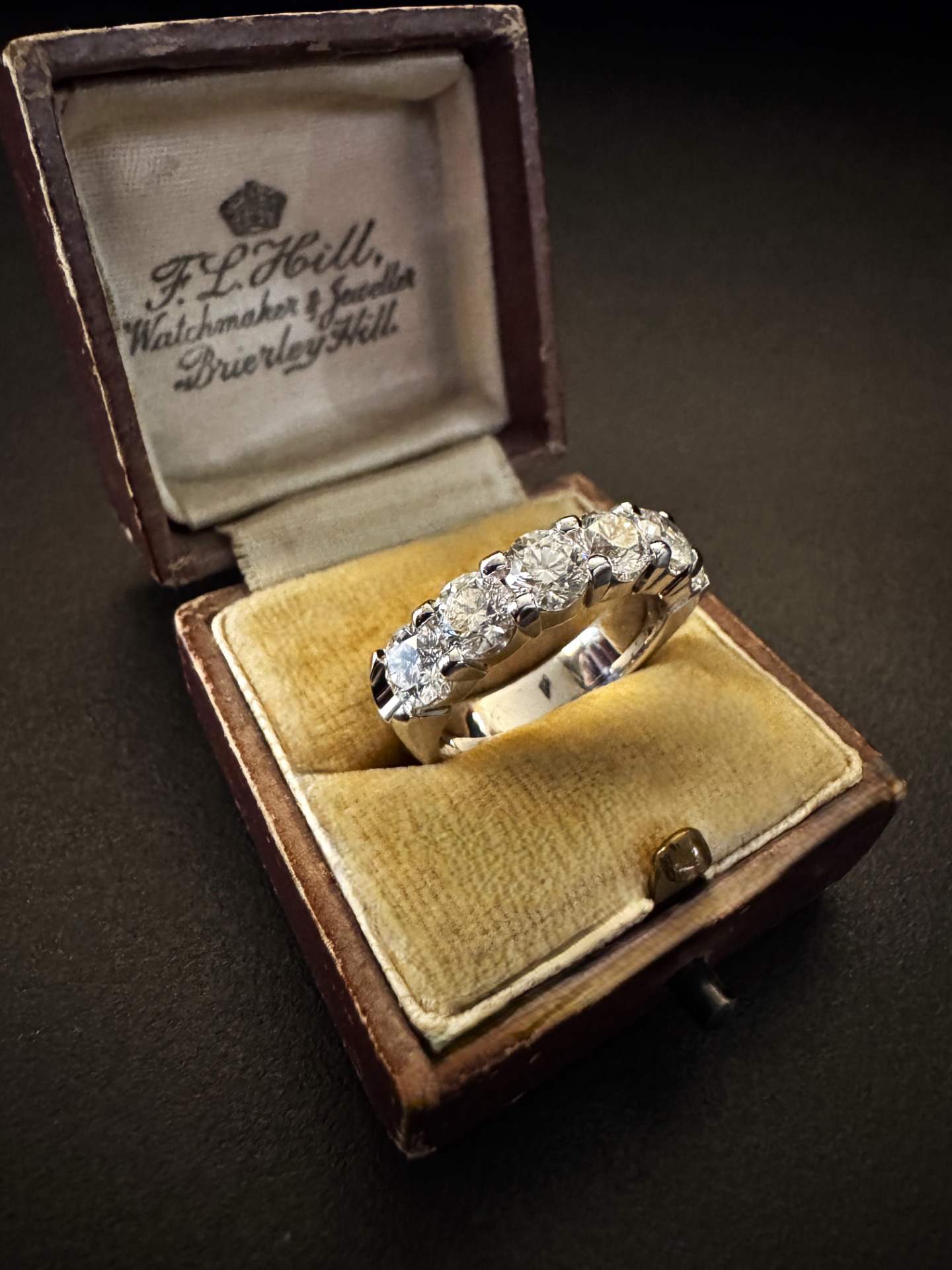 Questa fedina a cinque pietre riprende l’eleganza sobria dei modelli degli anni ’60, quando la gioielleria puntava a creare pezzi essenziali ma ricchi di significato.