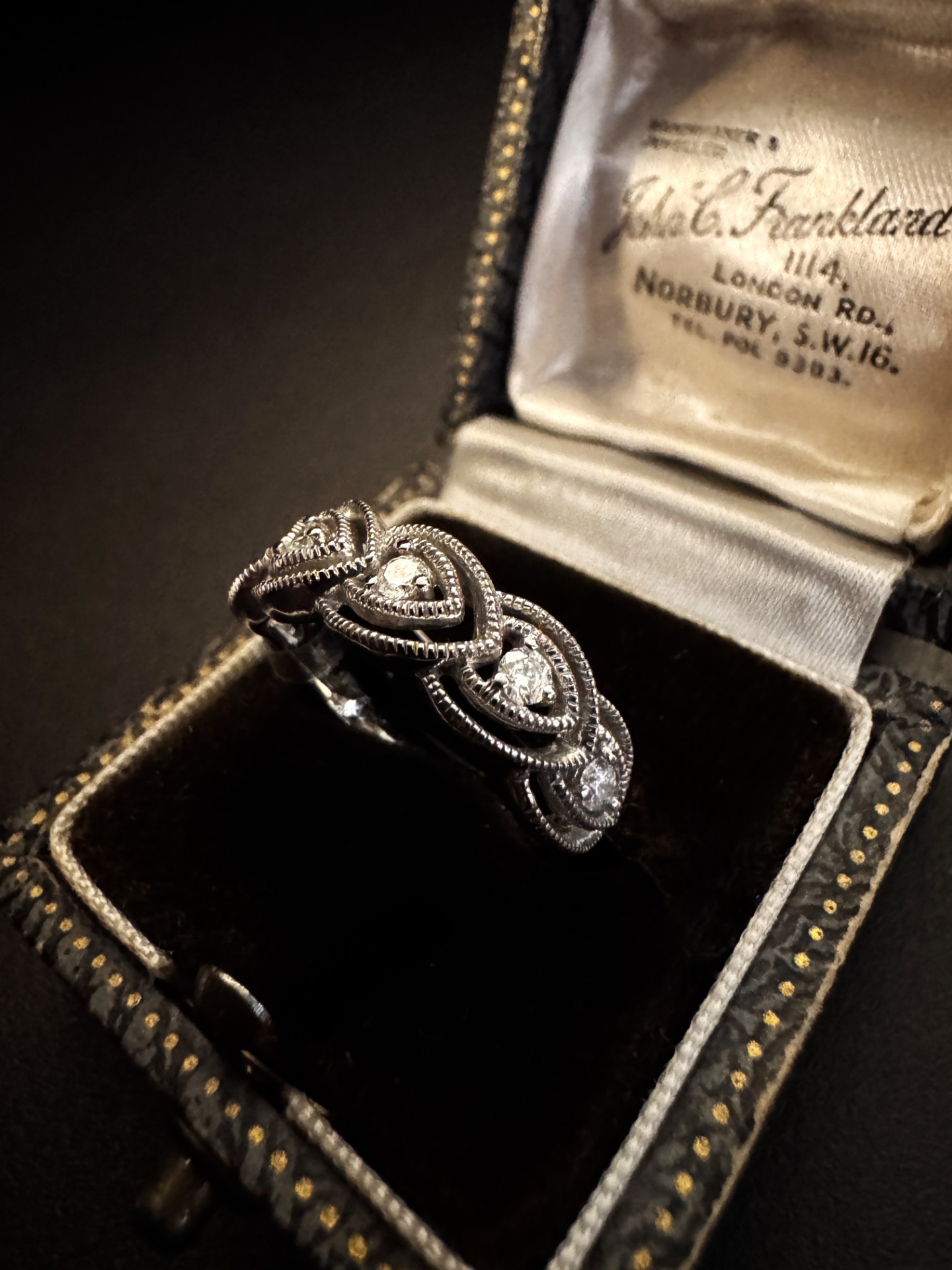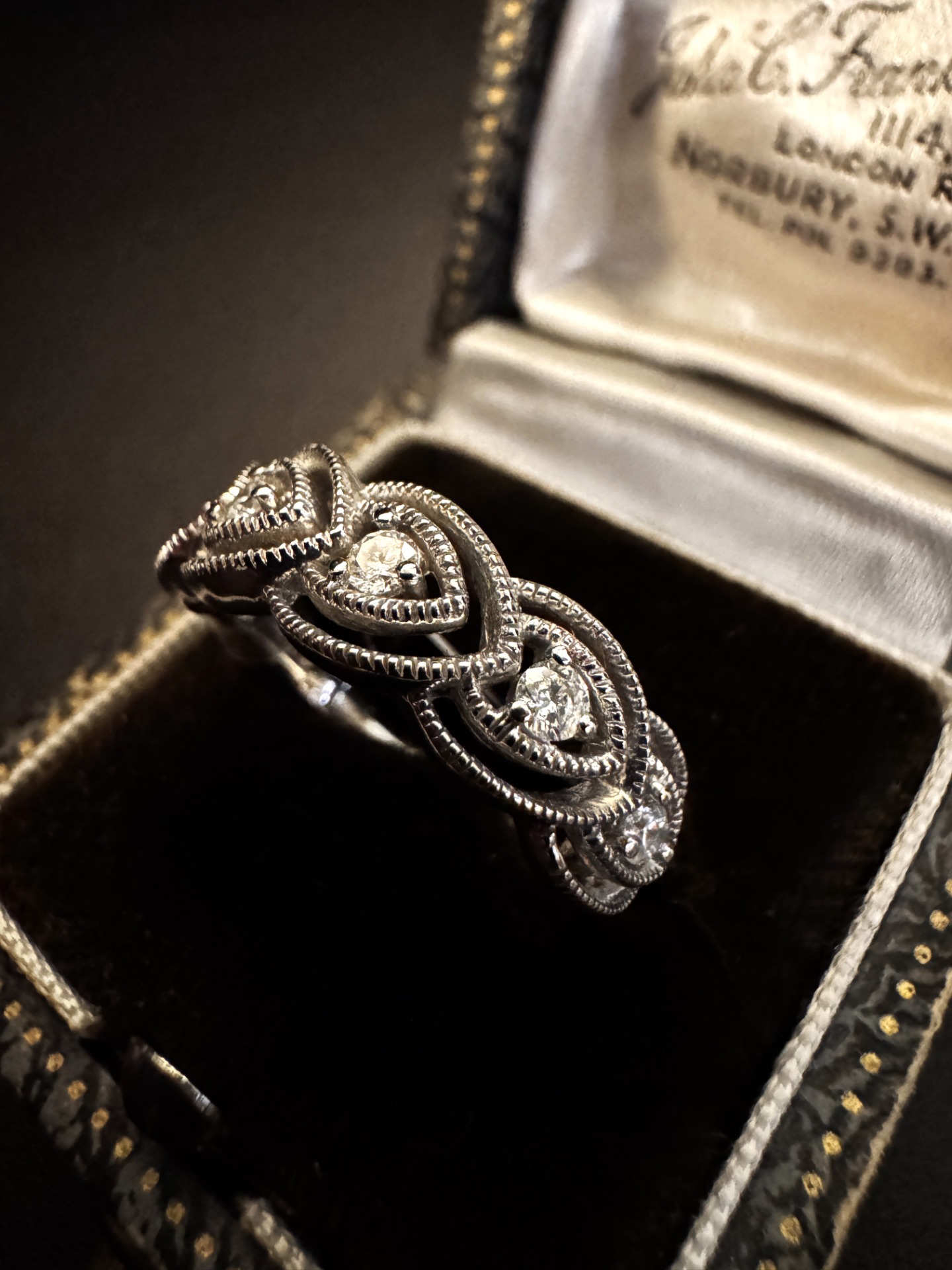 Il motivo a cuori intrecciati, rifinito con una delicata cordonatura e micro-milligrain, crea un gioco di luce continuo che valorizza il pavé di diamanti.