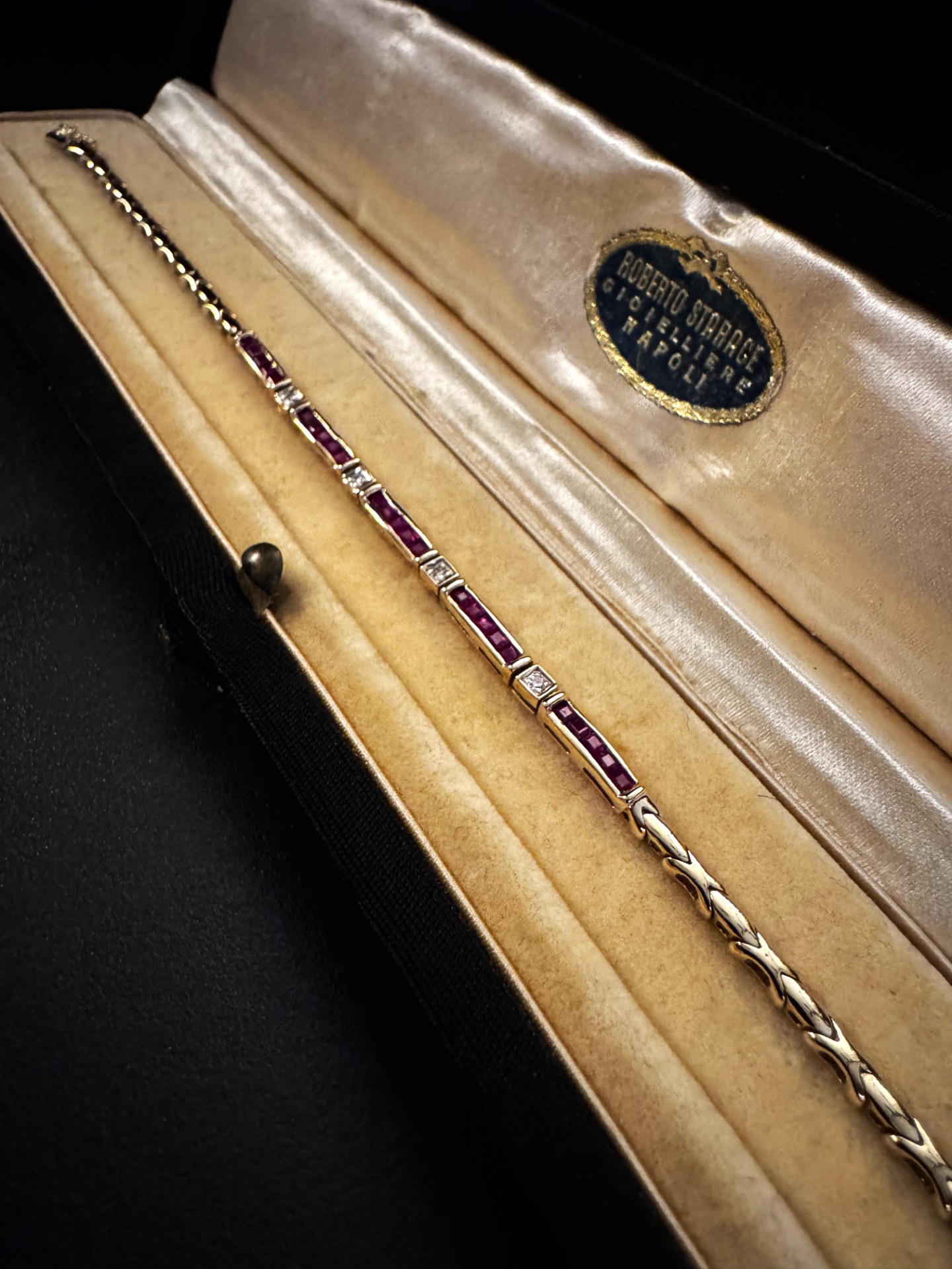 BRACCIALE IN ORO GIALLO CON RUBINI E DIAMANTI – RAFFINATA ELEGANZA INGLESE DEGLI ANNI ’70 Una creazione che nasce dall’eleganza sobria e impeccabile dell’Inghilterra degli anni ’70, dove la gioielleria univa tradizione e modernità con uno stile misurato, luminoso e profondamente raffinato. Questo bracciale in oro giallo incarna perfettamente lo spirito dell’epoca: leggero, armonioso e impreziosito da gemme che raccontano storie di colore e luce. La sua struttura in oro giallo presenta una lavorazione finemente articolata, per conferire fluidità e comfort senza rinunciare alla preziosità. Creato con cura artigianale, riflette la luce con una brillantezza calda e morbida, tipica della gioielleria inglese di quegli anni. Al centro di ogni sezione spiccano rubini naturali dal rosso vivace, tagliati in forma brillante principessa, che aggiungono un tocco di regalità e colore intenso. Accanto a loro, piccoli diamanti naturali taglio brillante completano la composizione con lampi di luce bianca, creando un equilibrio perfetto tra tonalità calde e fredde. Il design lineare, delicato e allo stesso tempo ricco di dettagli, fa di questo bracciale un gioiello estremamente versatile, elegante indossato da solo, perfetto in combinazione con altri bracciali, ideale come pezzo quotidiano o come dettaglio raffinato nelle occasioni speciali. CARATTERISTICHE PRINCIPALI   • Provenienza: Inghilterra, anni ’70   • Materiale: Oro giallo 9k   • Gemme: Rubini naturali taglio brillante principessa – caratura complessiva circa 0.30 ct   • Diamanti naturali: Taglio brillante – caratura complessiva circa 0.05 ct   • Lunghezza: 19 cm, adattabile Un gioiello che attraversa il tempo: autentico, luminoso, ricco di storia. Un bracciale che accompagna chi lo indossa con un tocco di colore regale e una raffinatezza che non teme il passare delle mode. Scopri di più su questo gioiello esclusivo nel nostronegozio o visita il sito www.GioielliGradara.it Ref. BRA15