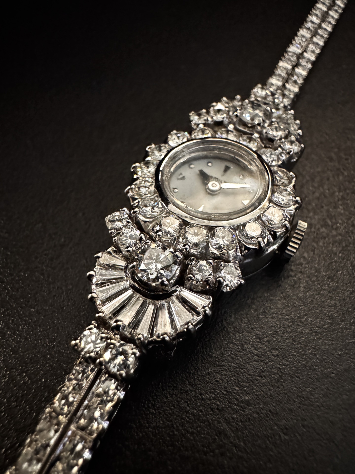 BRACCIALE OROLOGIO " HAMILTON " CON DIAMANTI – ELEGANZA ICONICA DEGLI ANNI ’50 Nato nel cuore degli anni ’50, quando il design raggiungeva i suoi massimi splendori stilistici, trasformando in autentica gioielleria da sera, questo straordinario bracciale orologio firmato " HAMILTON " incarna tutta la grazia, la raffinatezza e l’ingegnosità tecnica dell’epoca. Un gioiello che non si limita a segnare il tempo, ma lo celebra. Ogni dettaglio racconta la visione artigianale di quegli anni, in cui la precisione meccanica si fondeva con l’arte dell’incastonatura, dando vita a capolavori esclusivi destinati a pochi privilegiati. La cassa rotonda è abbracciata da un sontuoso pavé di diamanti naturali taglio brillante, disposti in una cornice radiale che accende il quadrante con riflessi scintillanti e morbidi giochi di luce. Ai lati, due spettacolari ventagli di diamanti taglio baguette creano un effetto a ventaglio tipico dell’alta gioielleria degli anni ’50. Pietre lunghe e perfettamente calibrate, incastonate una ad una con maestria per esaltare la pulizia del platino e donare tridimensionalità alla struttura. La precisione dell’incassatura sottolinea l’altissima qualità del lavoro: ogni baguette è posizionata con un angolo leggermente divergente, realizzando un’esplosione luminosa che si apre verso il bracciale con elegante armonia. Il cinturino, un delicato intreccio di maglie in oro bianco, è interamente impreziosito da diamanti, una scelta tipica dei modelli da sera commissionati alle grandi maison negli anni ’50, pensati per avvolgere il polso come un gioiello regale. Il risultato è un equilibrio perfetto tra orologio e gioiello, in cui la funzione si nasconde quasi per lasciare spazio al puro splendore delle gemme e alla morbidezza delle linee vintage. Questo pezzo rappresenta un gioiello di rara bellezza autentica dell’epoca. Caratteristiche principali   • Epoca: Anni ’50 – alta gioielleria-orologeria dell’epoca.   • Materiale: Oro bianco   • Diamanti naturali: circa 5,5 ct complessivi, taglio brillante e baguette, selezionati per purezza e luminosità   • Incastonatura: pavé radiale attorno alla cassa, baguette calibrate a ventaglio sui lati, brillanti sul bracciale   • Quadrante: rotondo, minimalista, tipico degli orologi gioiello degli anni ’50   • Particolarità: Design a ventaglio con diamanti baguette – una delle configurazioni più rare e ricercate dell’epoca Un gioiello-orologio di straordinaria eleganza, pensato per chi desidera indossare una vera opera d’arte dell’alta gioielleria vintage, capace di illuminare il polso con un fascino intramontabile. Scopri di più su questo gioiello esclusivo nel nostro negozio o visita il sito www.GioielliGradara.it Ref. 4597 KT