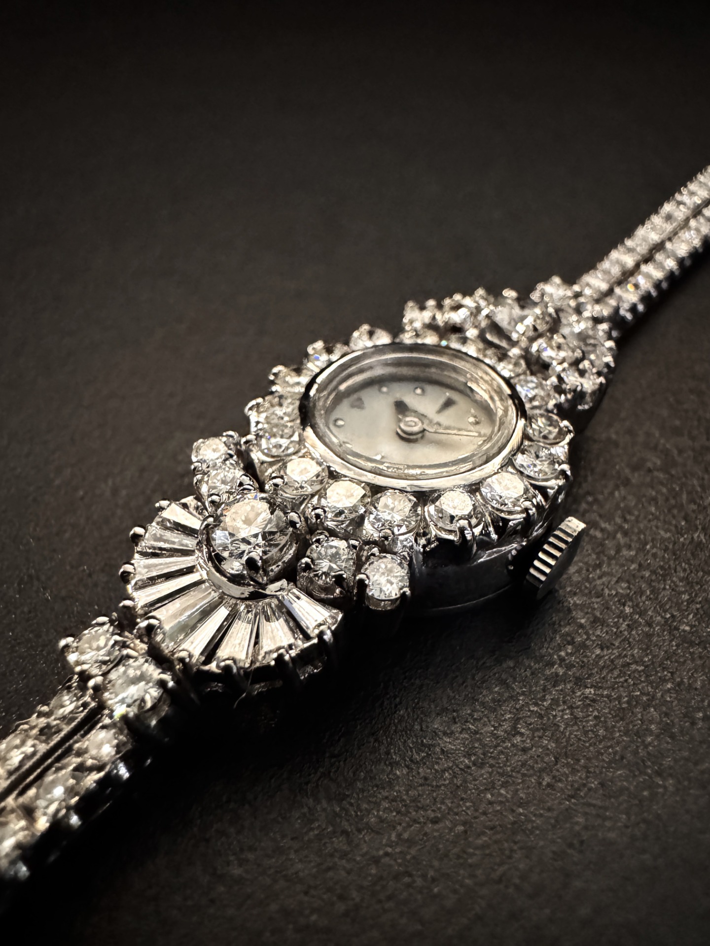 Il cinturino, un delicato intreccio di maglie in oro bianco, è interamente impreziosito da diamanti, una scelta tipica dei modelli da sera commissionati alle grandi maison negli anni ’50, pensati per avvolgere il polso come un gioiello regale.