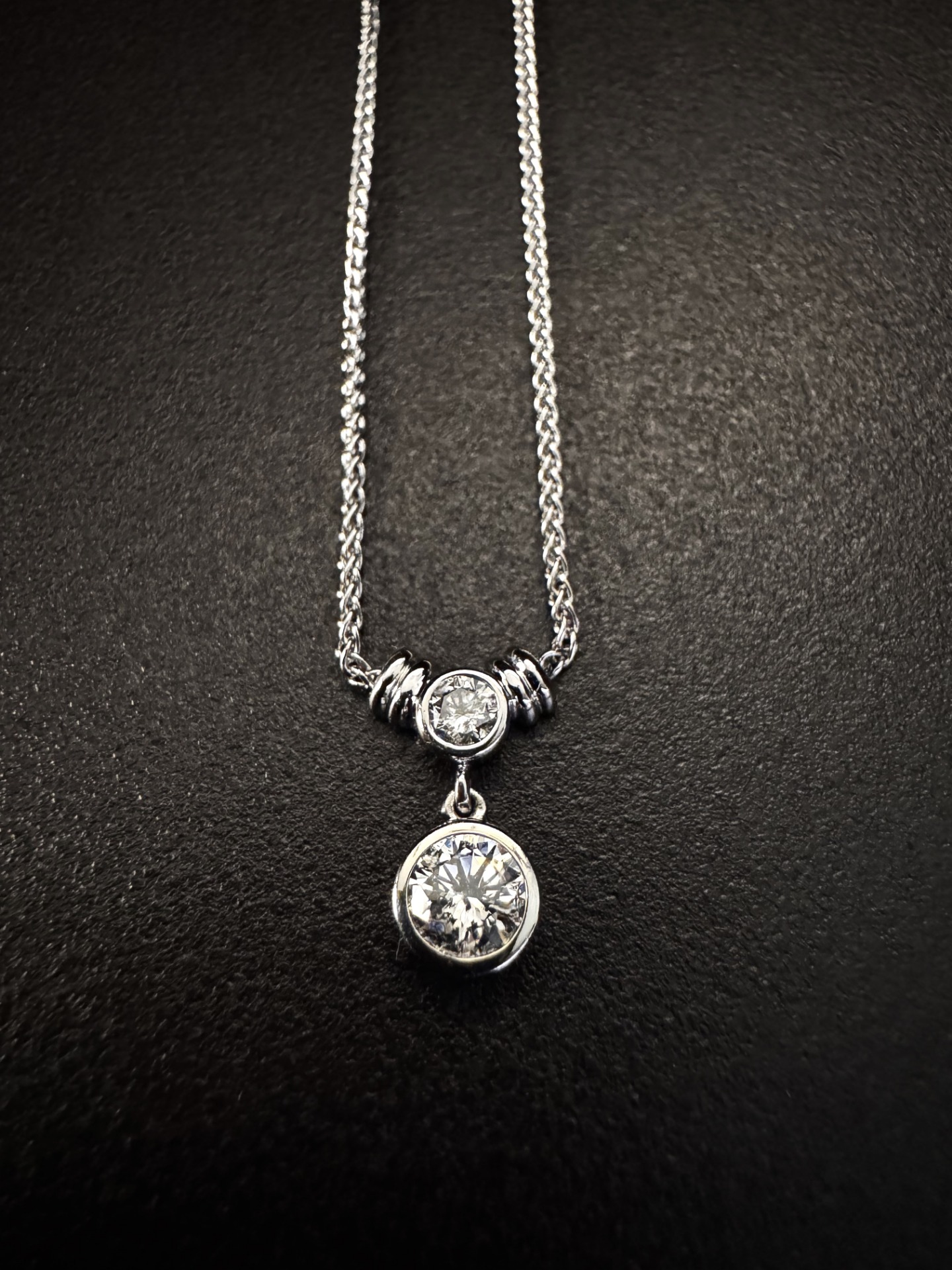 • Diamante inferiore – 0.45 ct, colore F-G, purezza VS1, taglio brillante rotondo, protagonista del pendente grazie al profilo più ampio del bezel