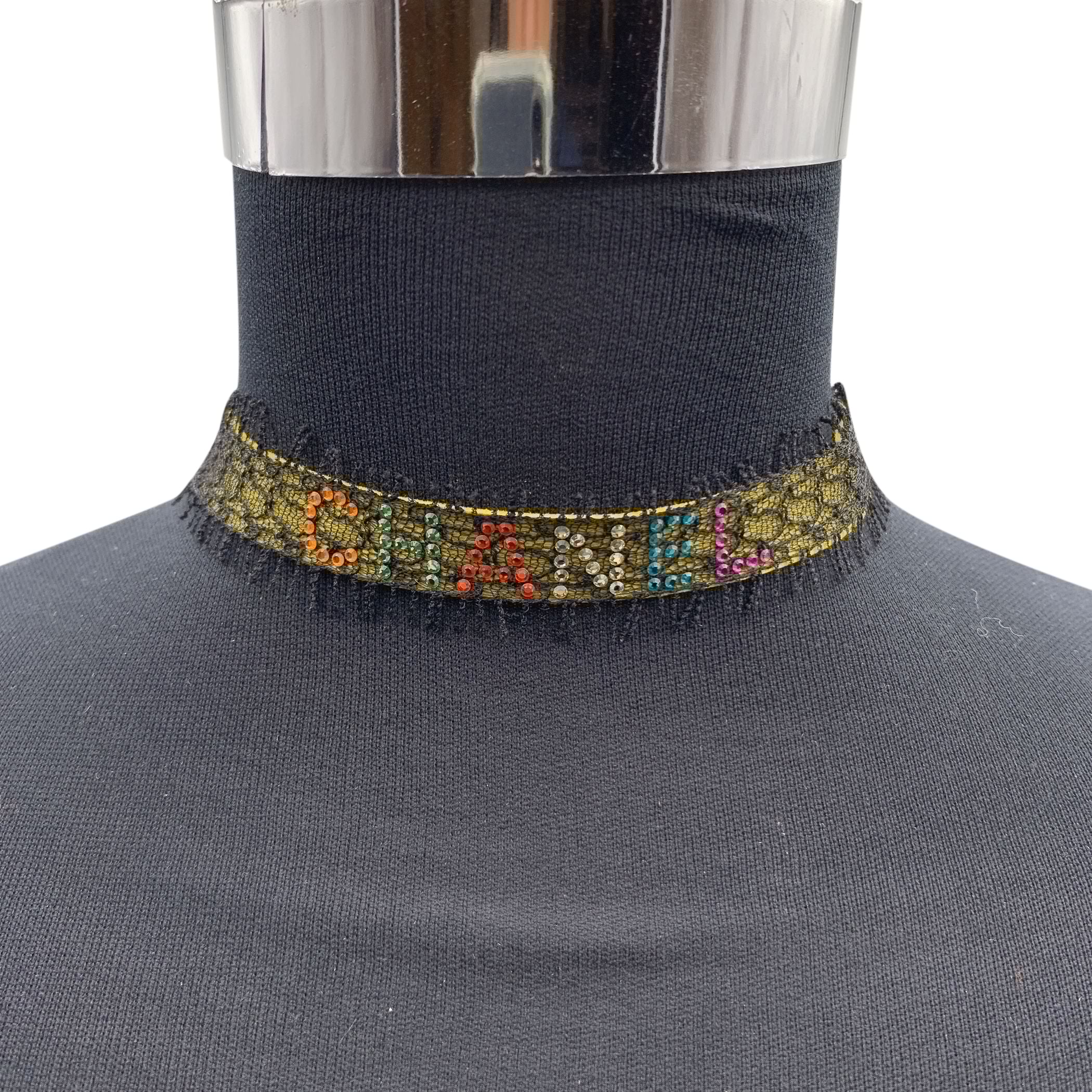 https://opavintage.it/products/chanel-multicolor-rhinestones-yellow-suede-black-lace-choker-necklace-1