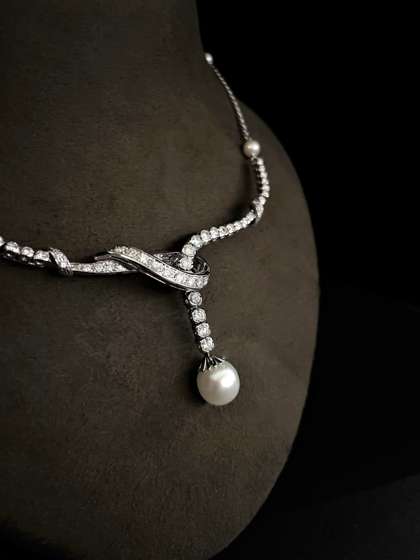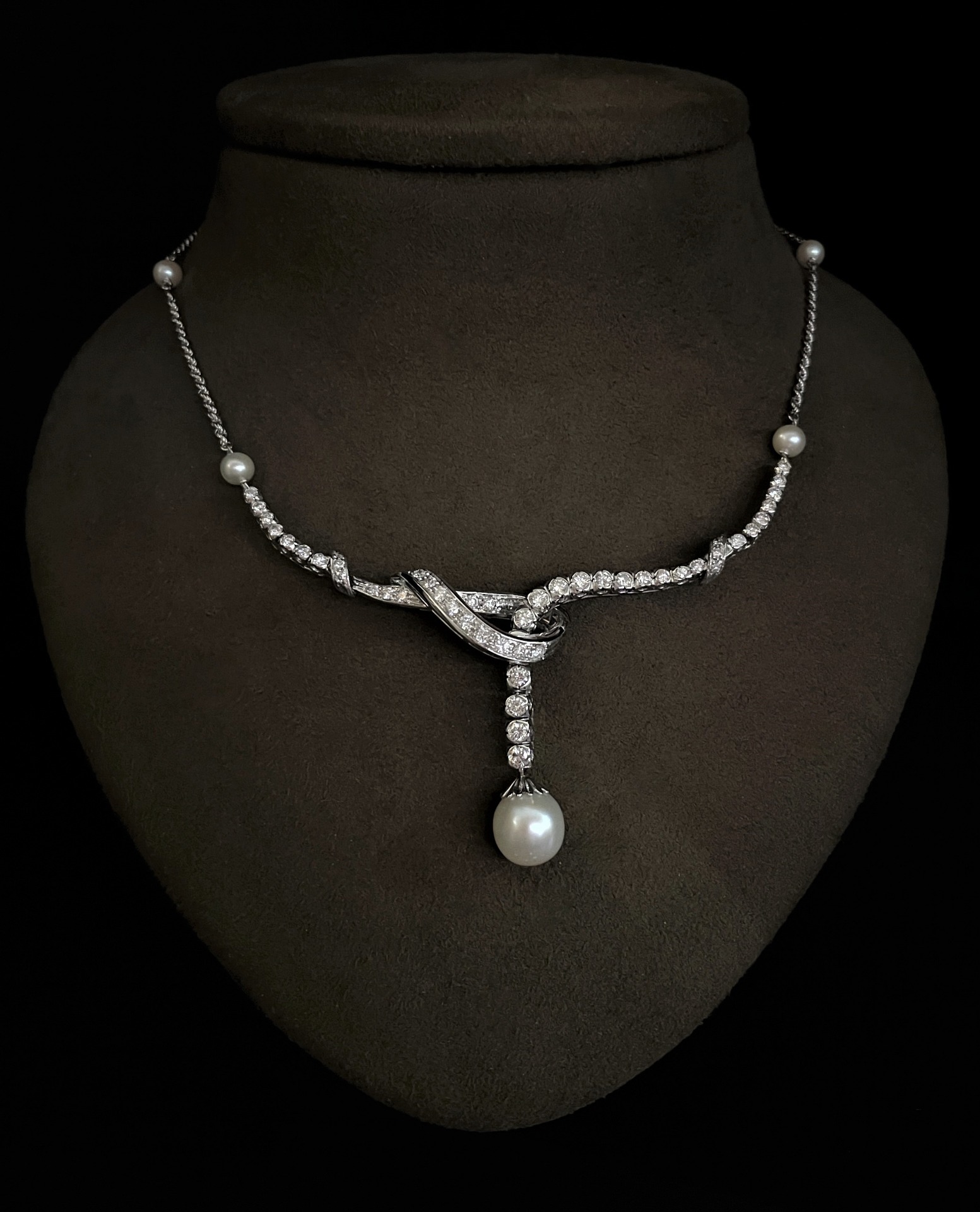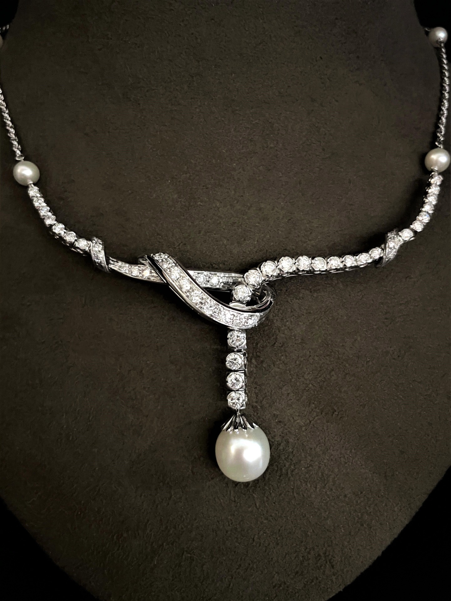 SPLENDIDA COLLANA VINTAGE IN ORO BIANCO CON DIAMANTI E PERLA – MAESTRIA ITALIANA ANNI ’50
