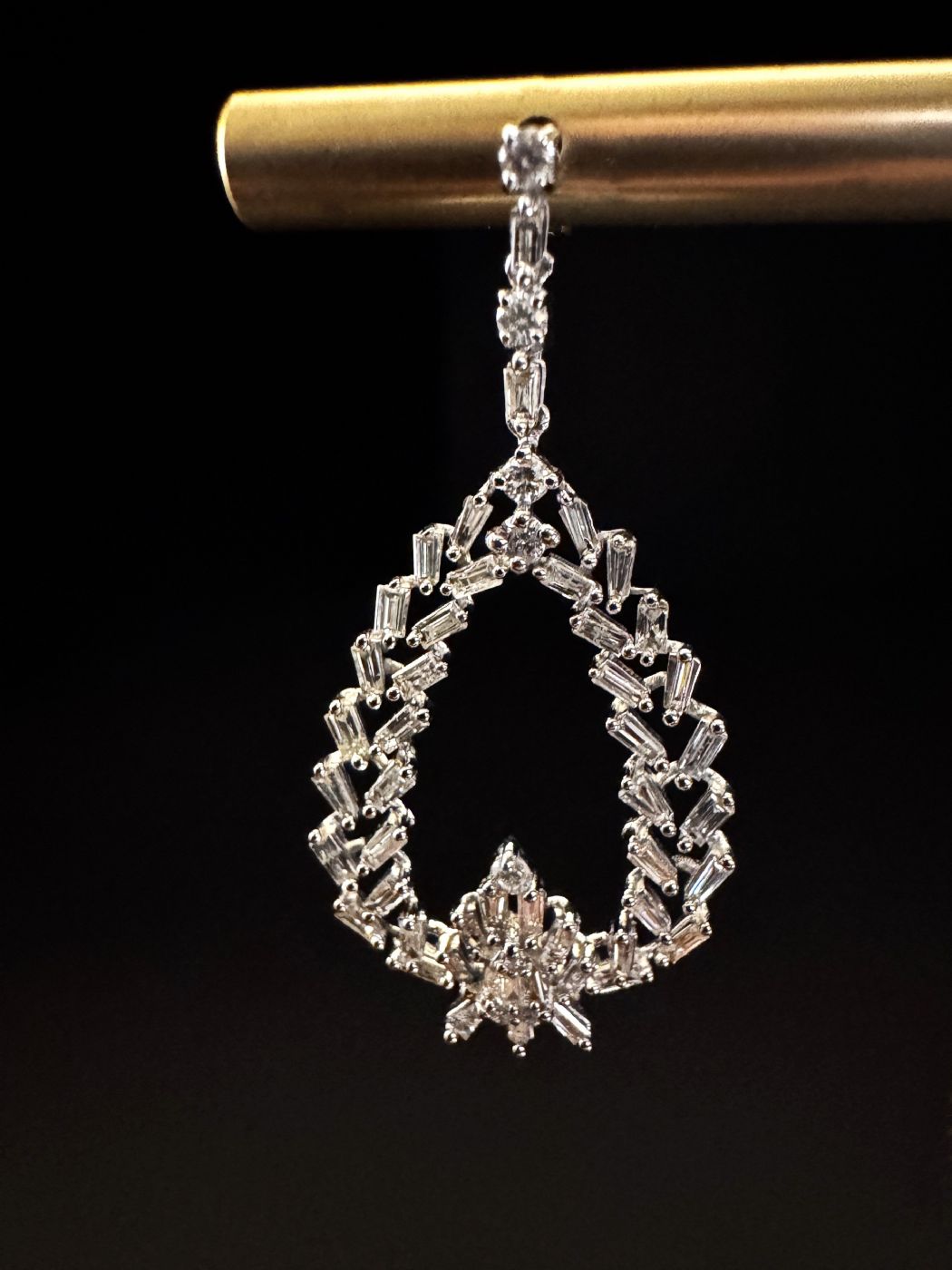 • Punto Focale – Nella parte inferiore interna della goccia, un cluster di diamanti taglio baguette e brillanti crea una goccia luminosa, che aggiunge profondità e intensità scenografica.