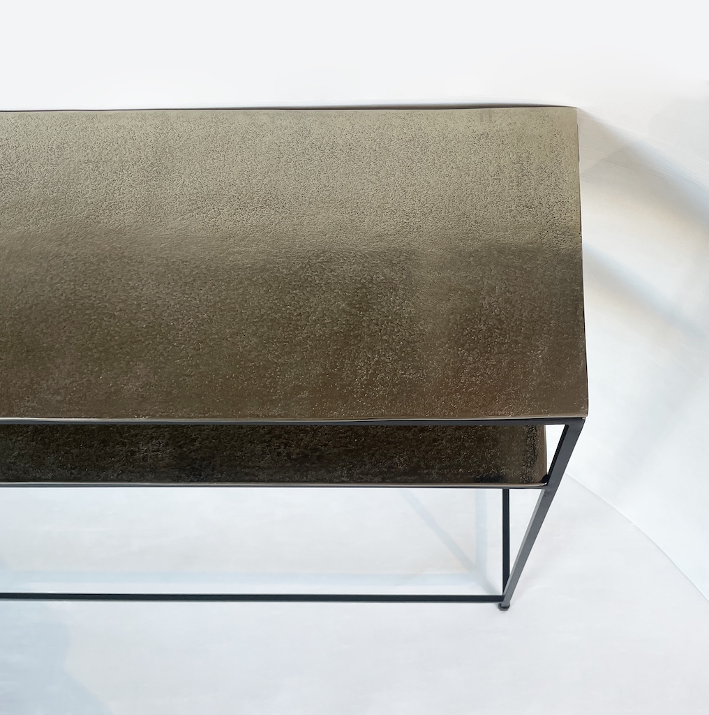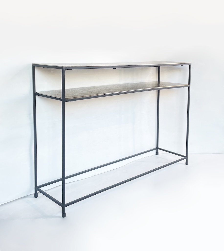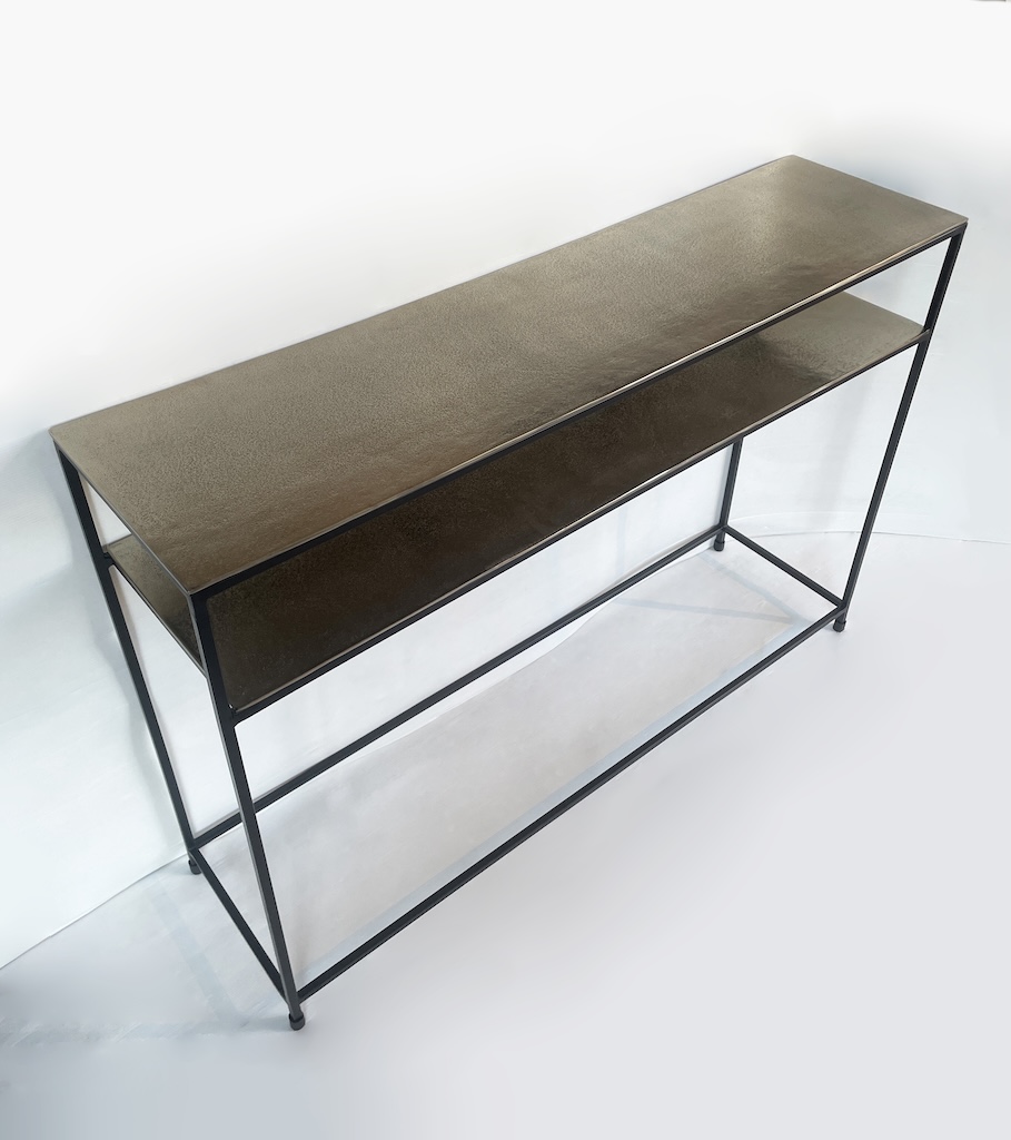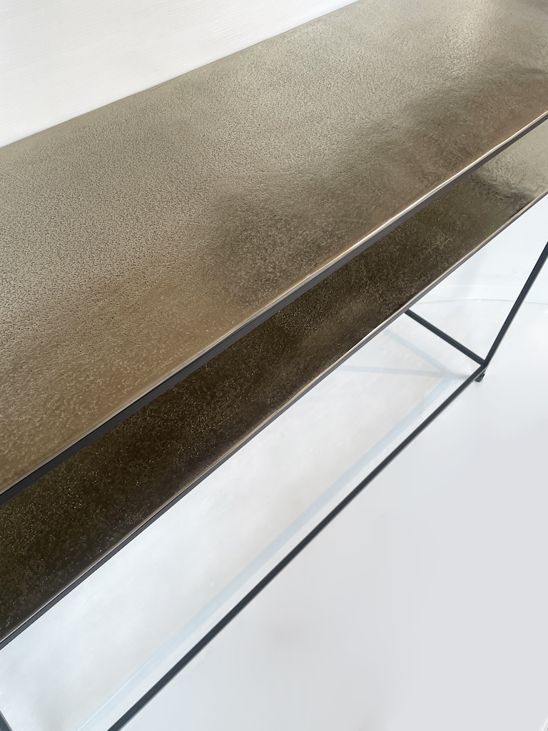 Particolare consolle dallo stile industrial contemporaneo interamente realizzata in alluminio color oro/champagne e ferro.