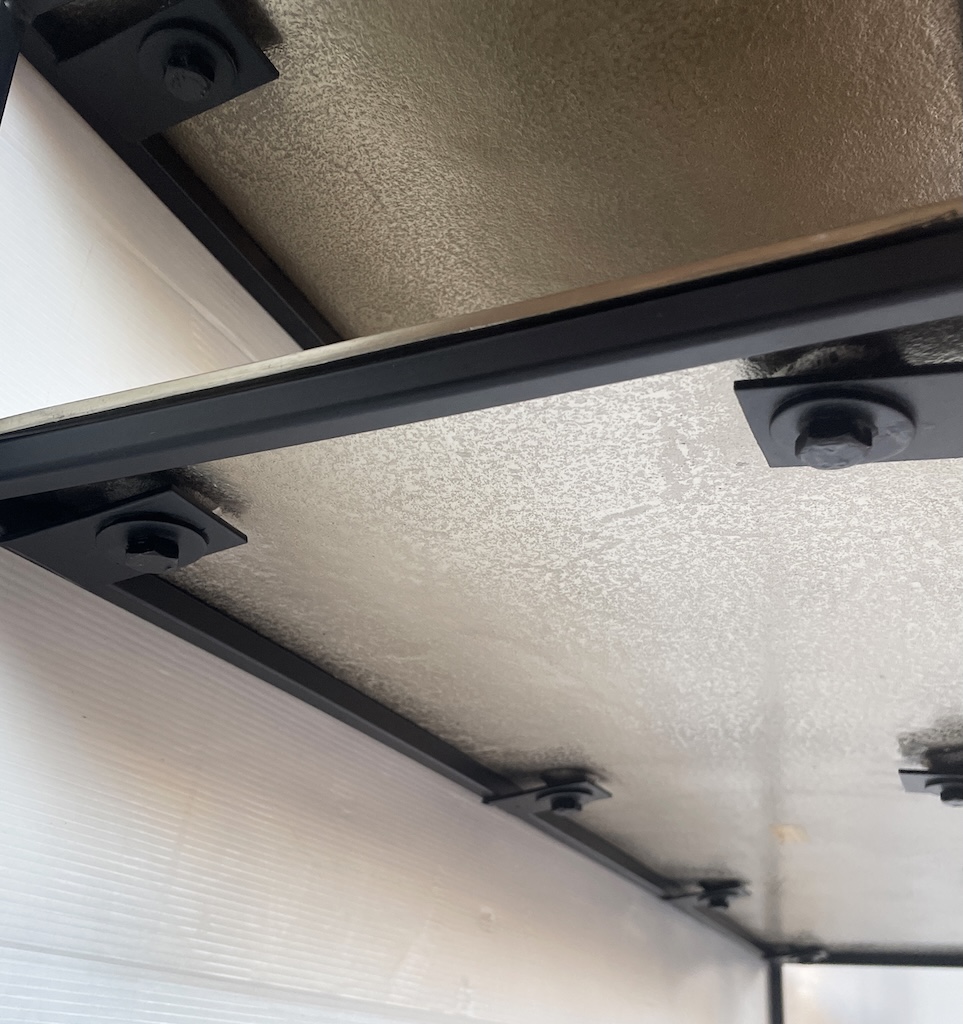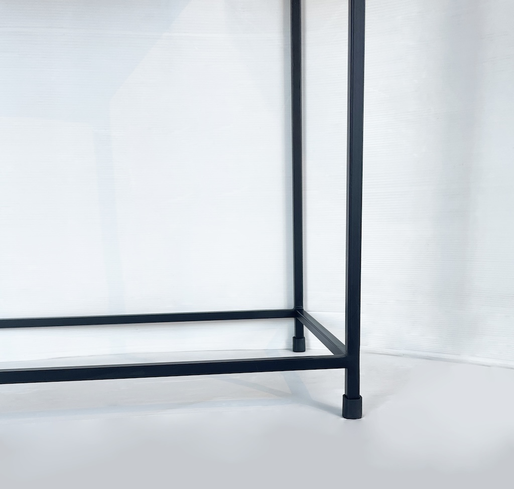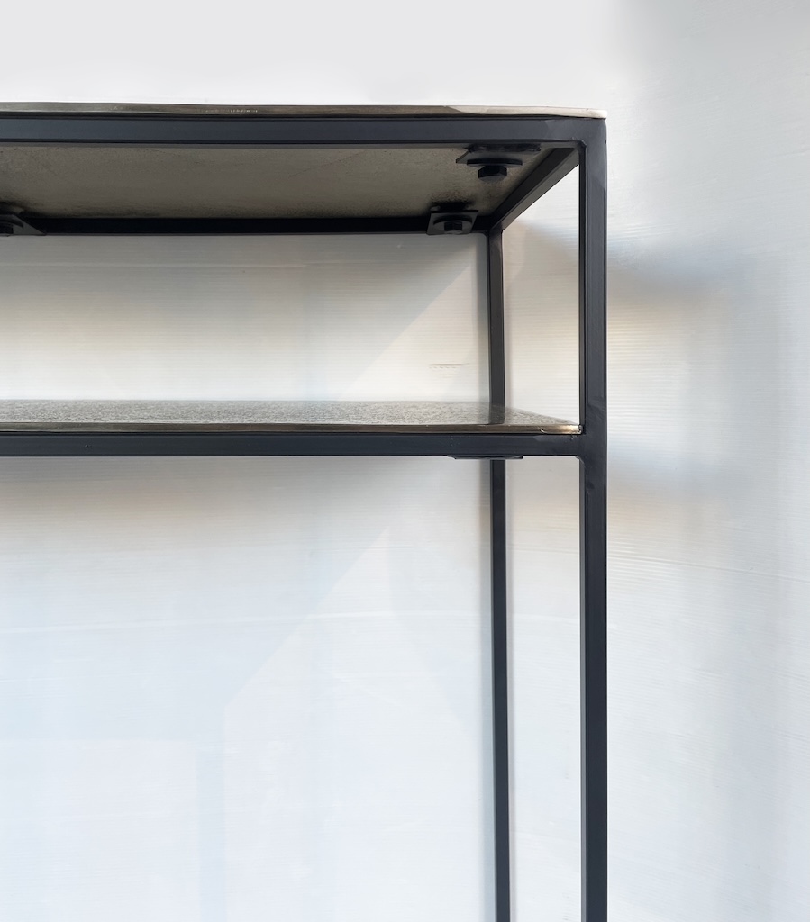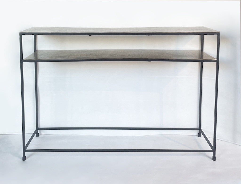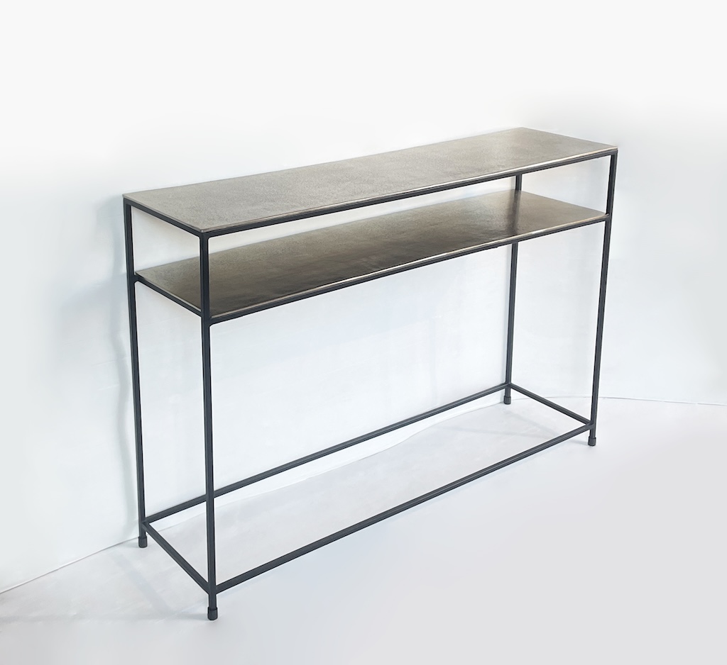 Particolare consolle dallo stile industrial contemporaneo interamente realizzata in alluminio color oro/champagne e ferro.