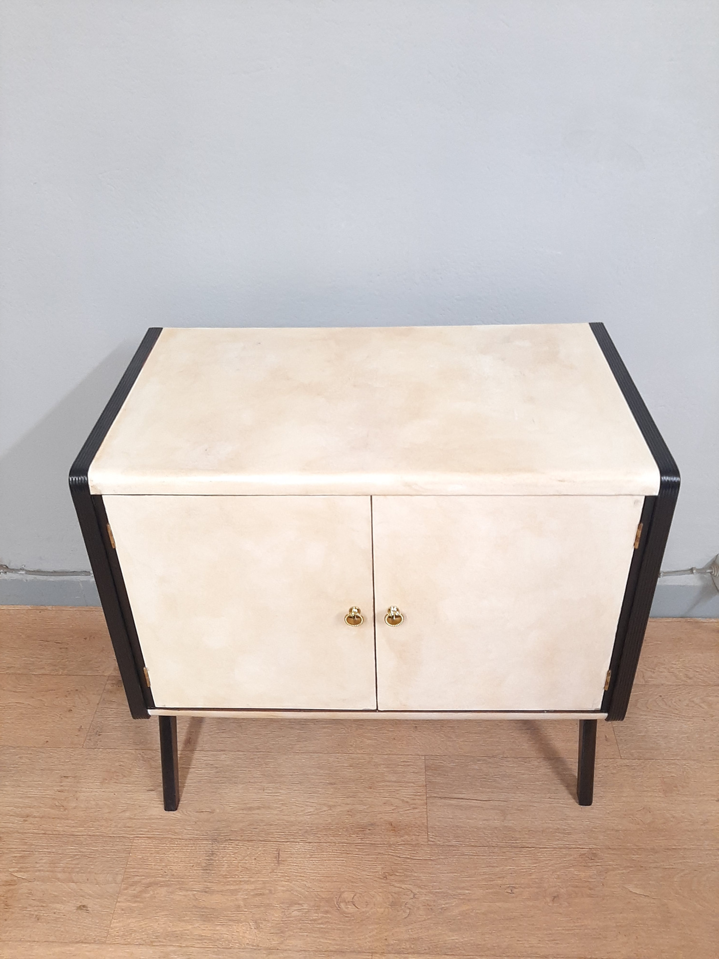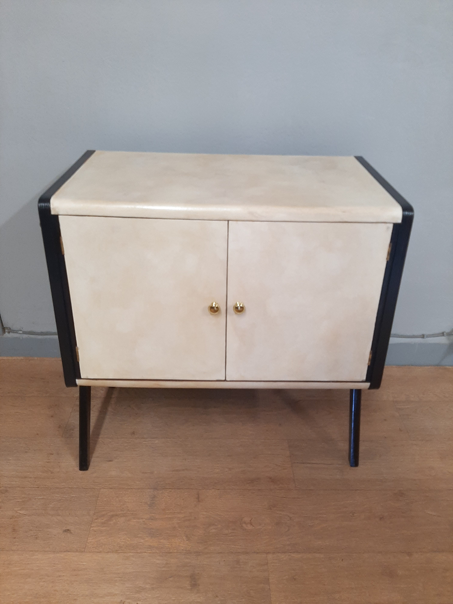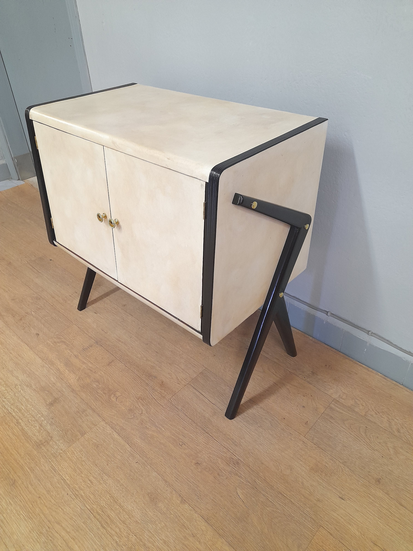 Piccolo mobile bar in legno laccato nero e pergamena , anni '50