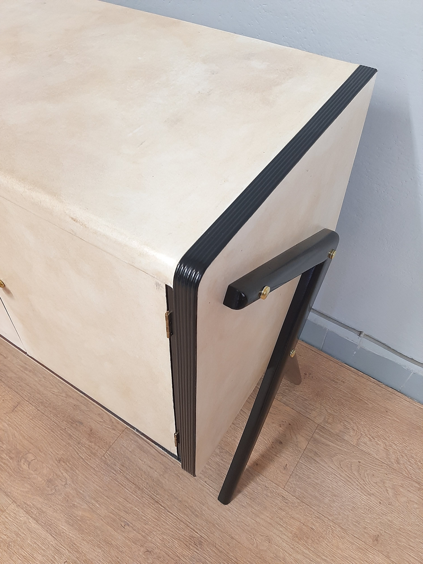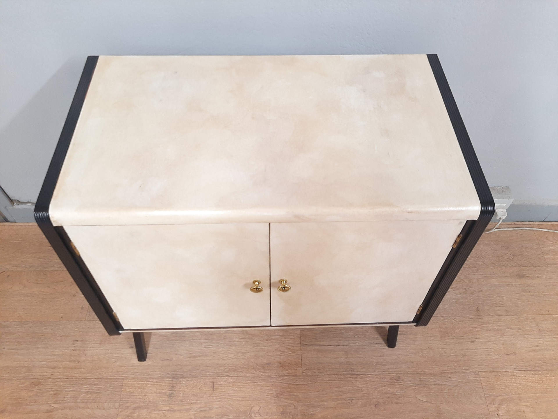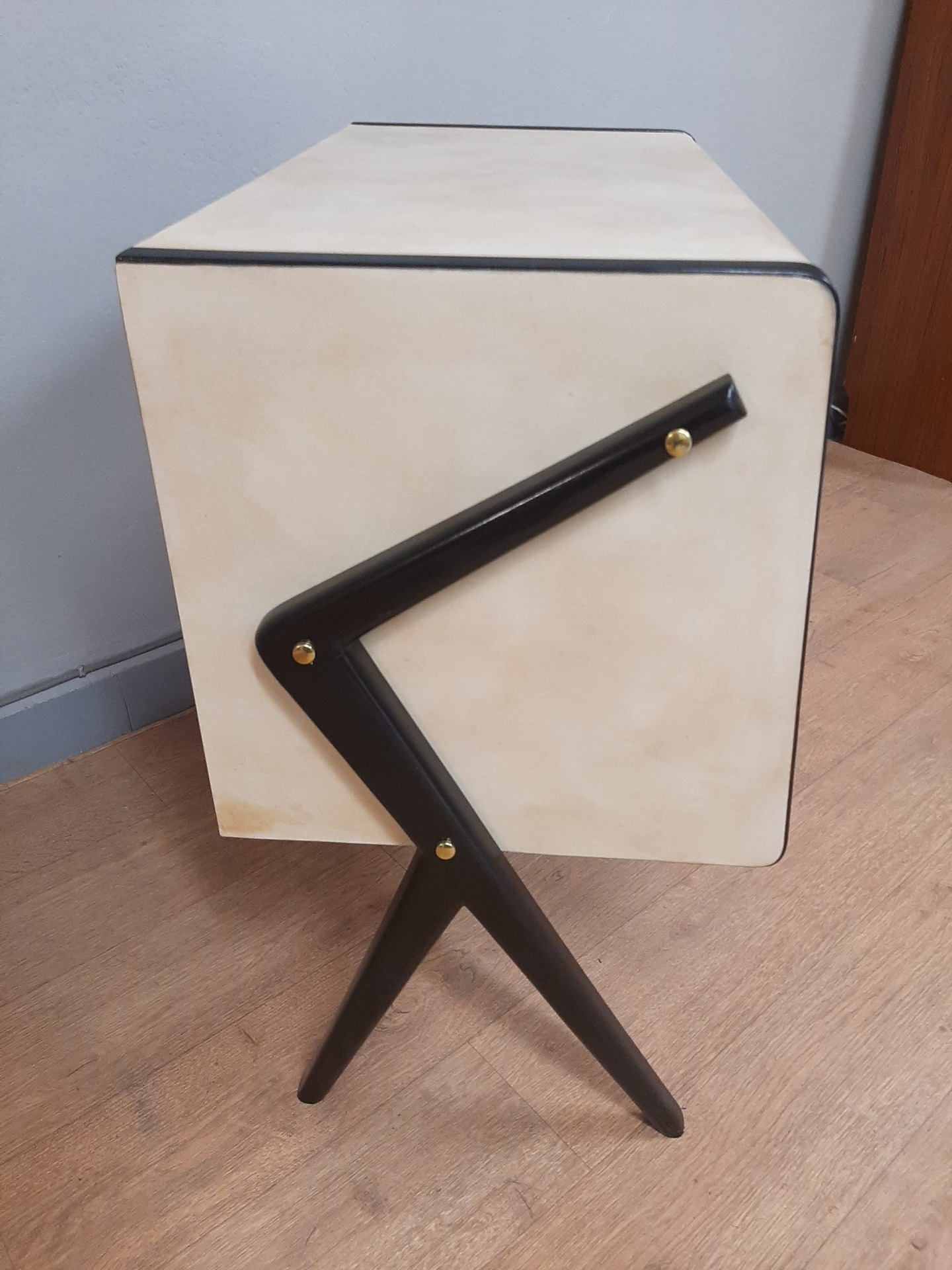 Piccolo mobile bar in legno laccato nero e pergamena , anni '50