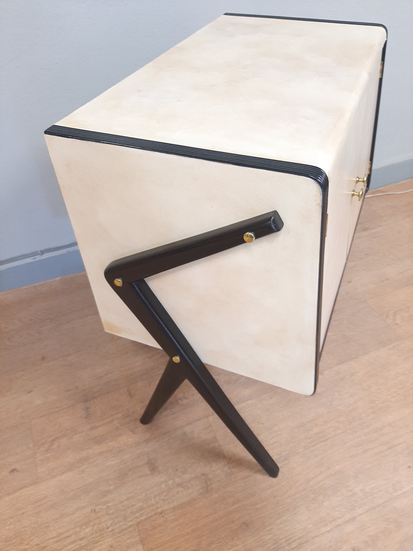 note: Piccolo mobile bar in lego laccato nero e rivestito in pergamena, molto particolare per le dimensioni contenute e il piede a "Y" tipico degli anni '50. Restaurato in maniera professionale conservativa e lucidato a gommalacca, pronto per essere inserito da subito, presenta piccole macchie dovute all' utilizzo.