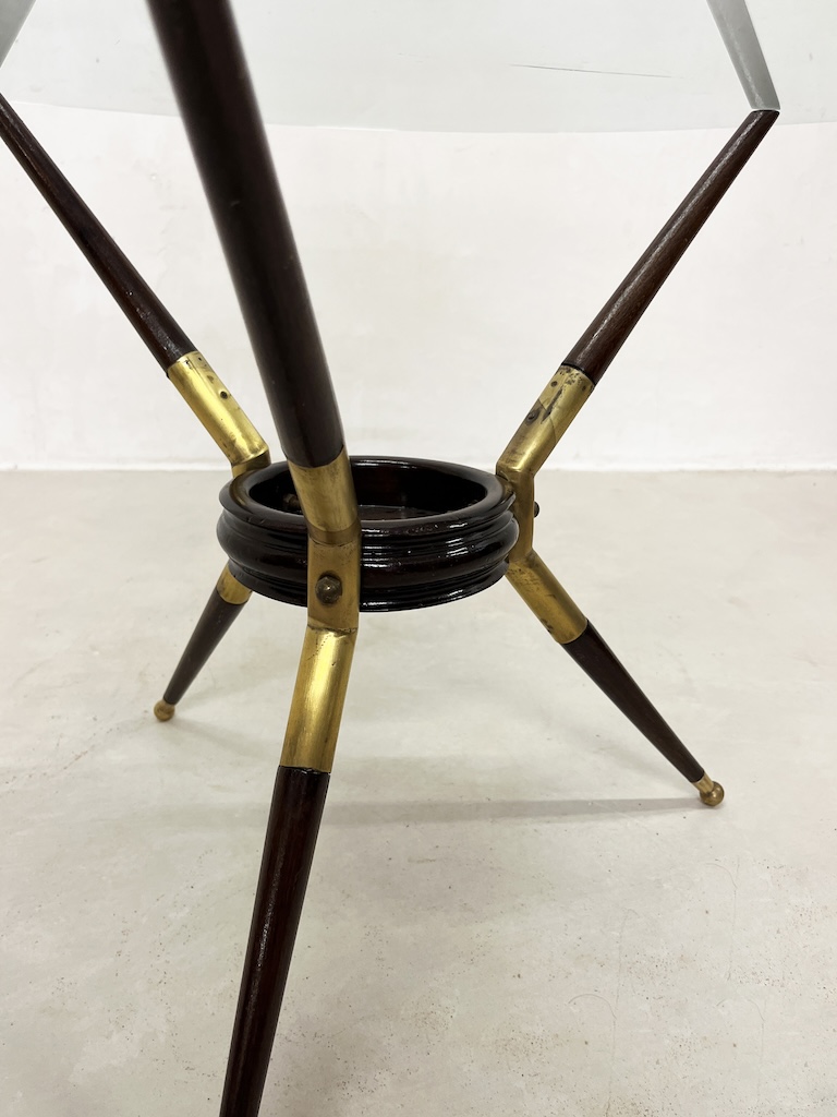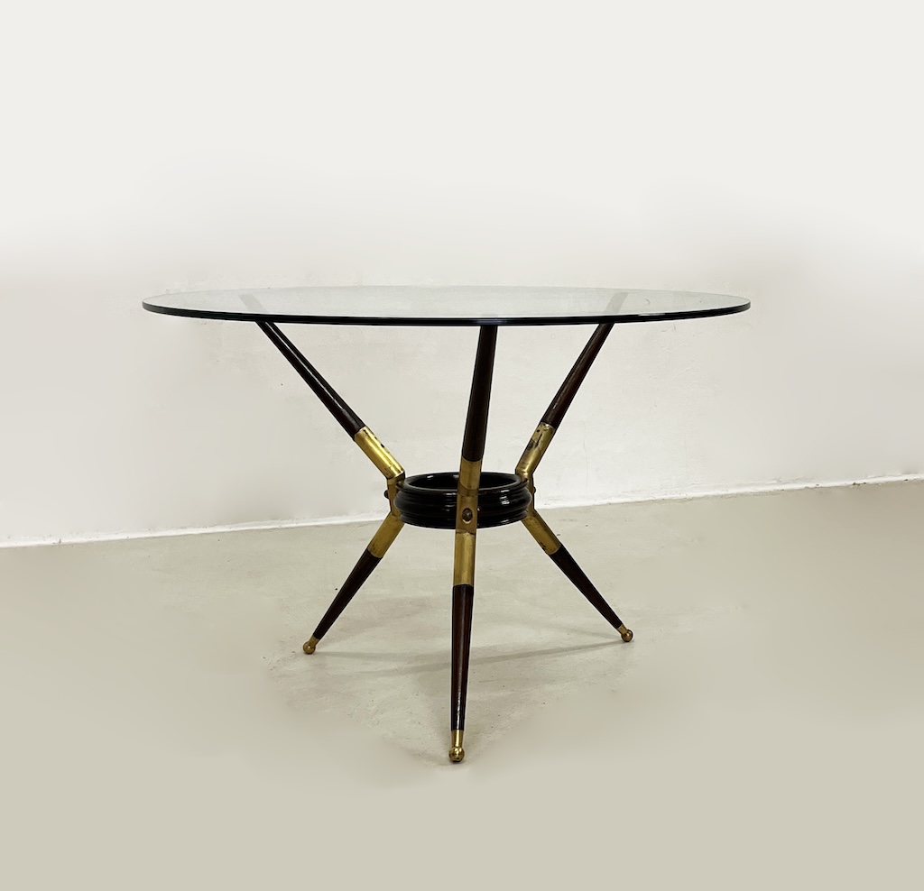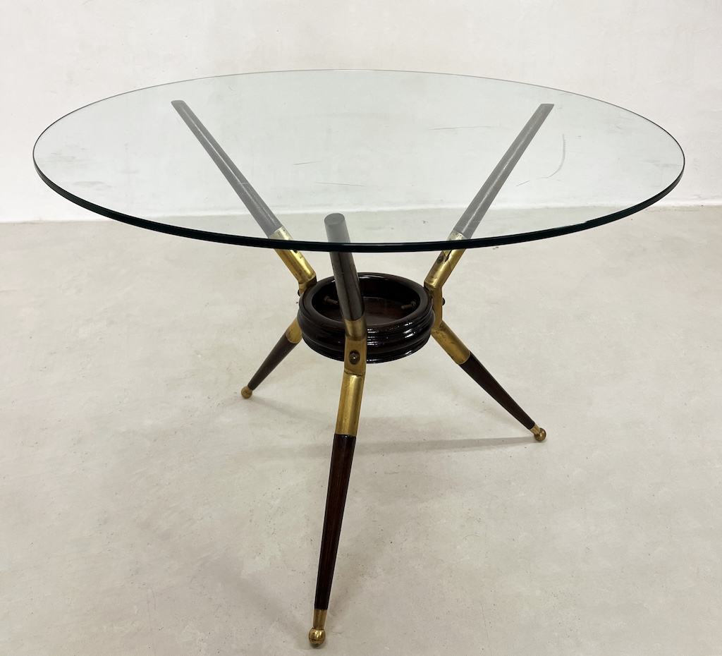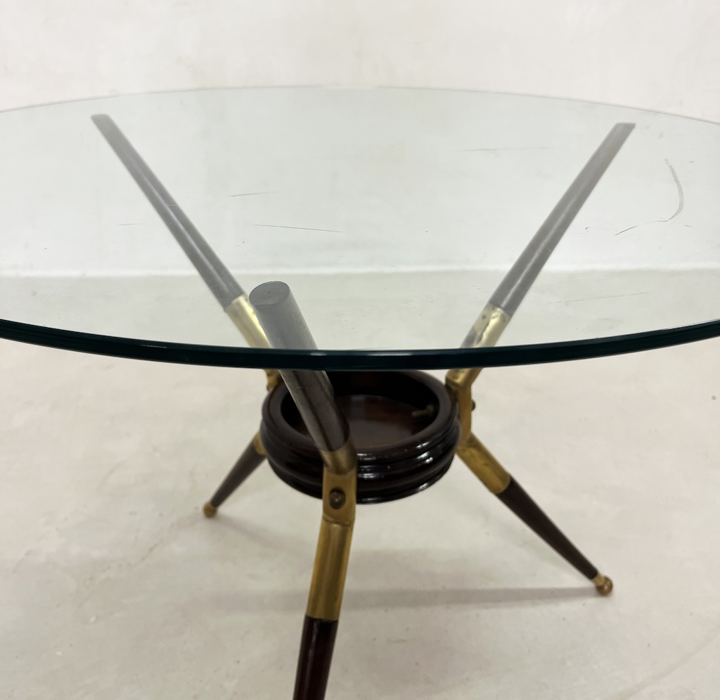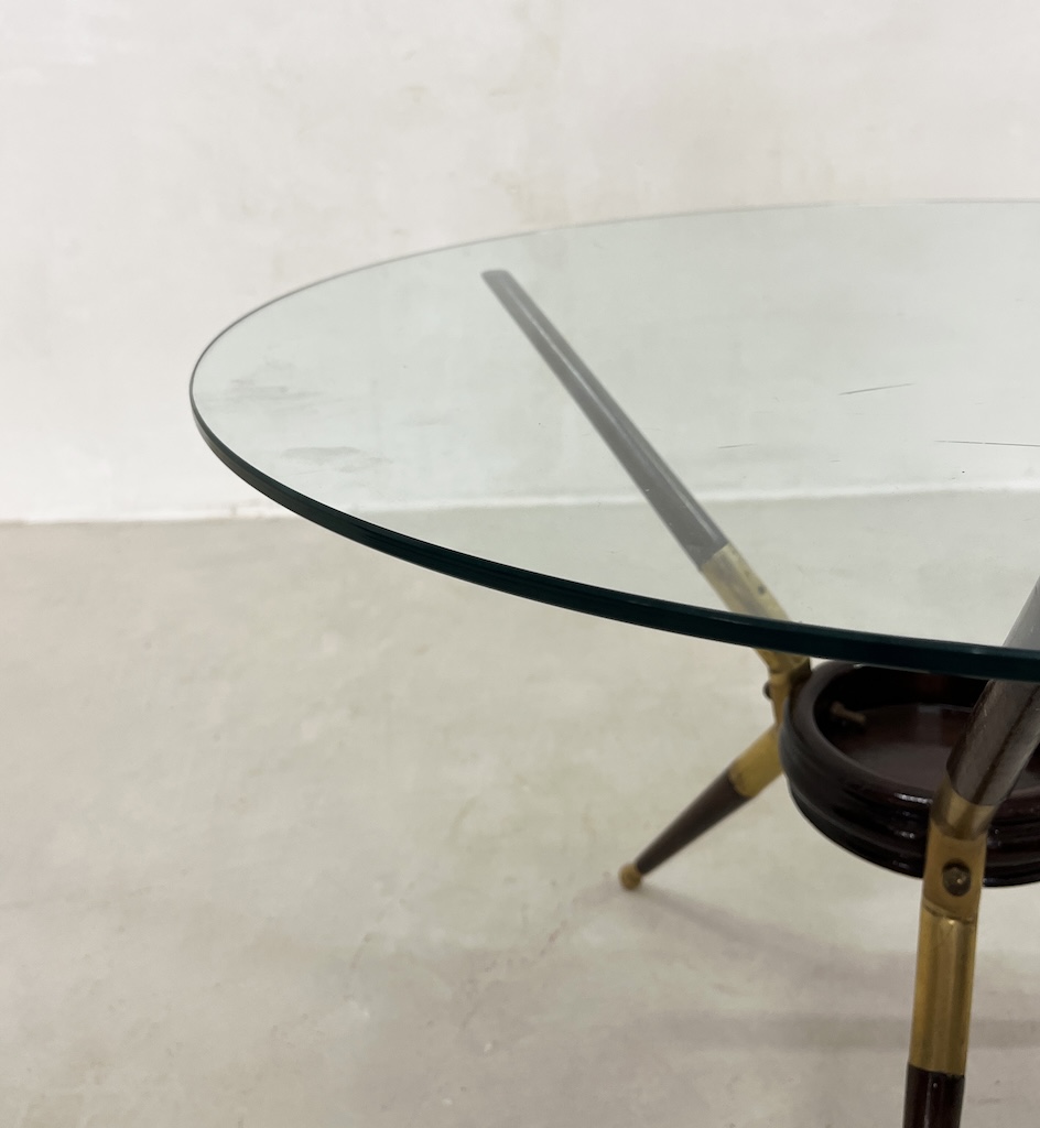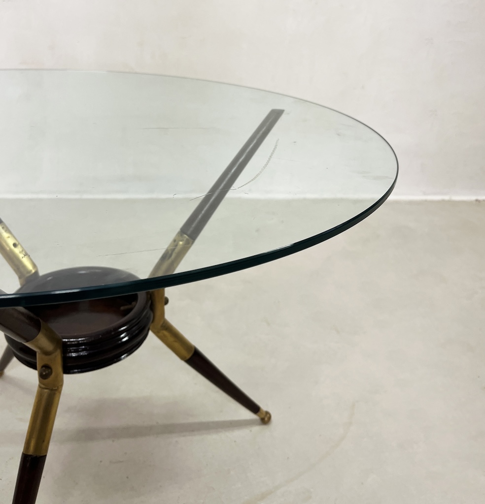 Particolare coffee table in stile Cesare Lacca 1950 con struttura a tre piedi realizzata in legno ebanizzato nero e ottone, con elemento tondo centrale nero e piano in vetro trasparente.