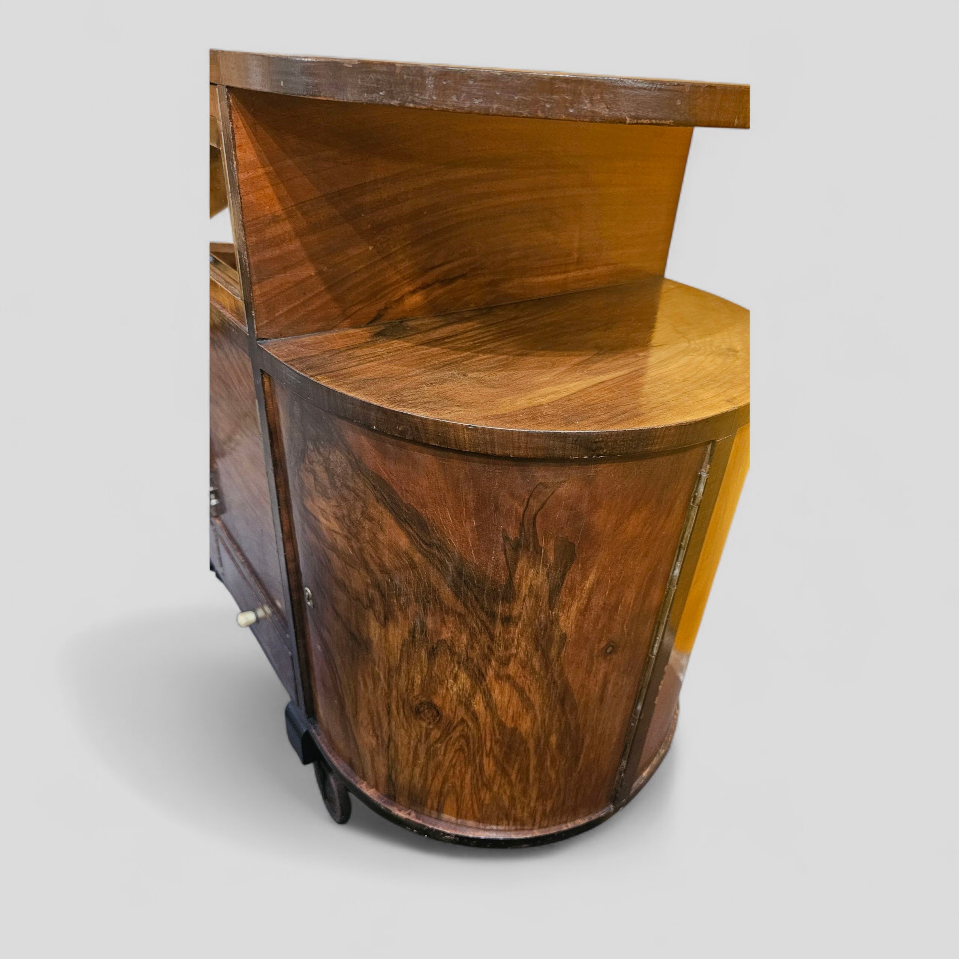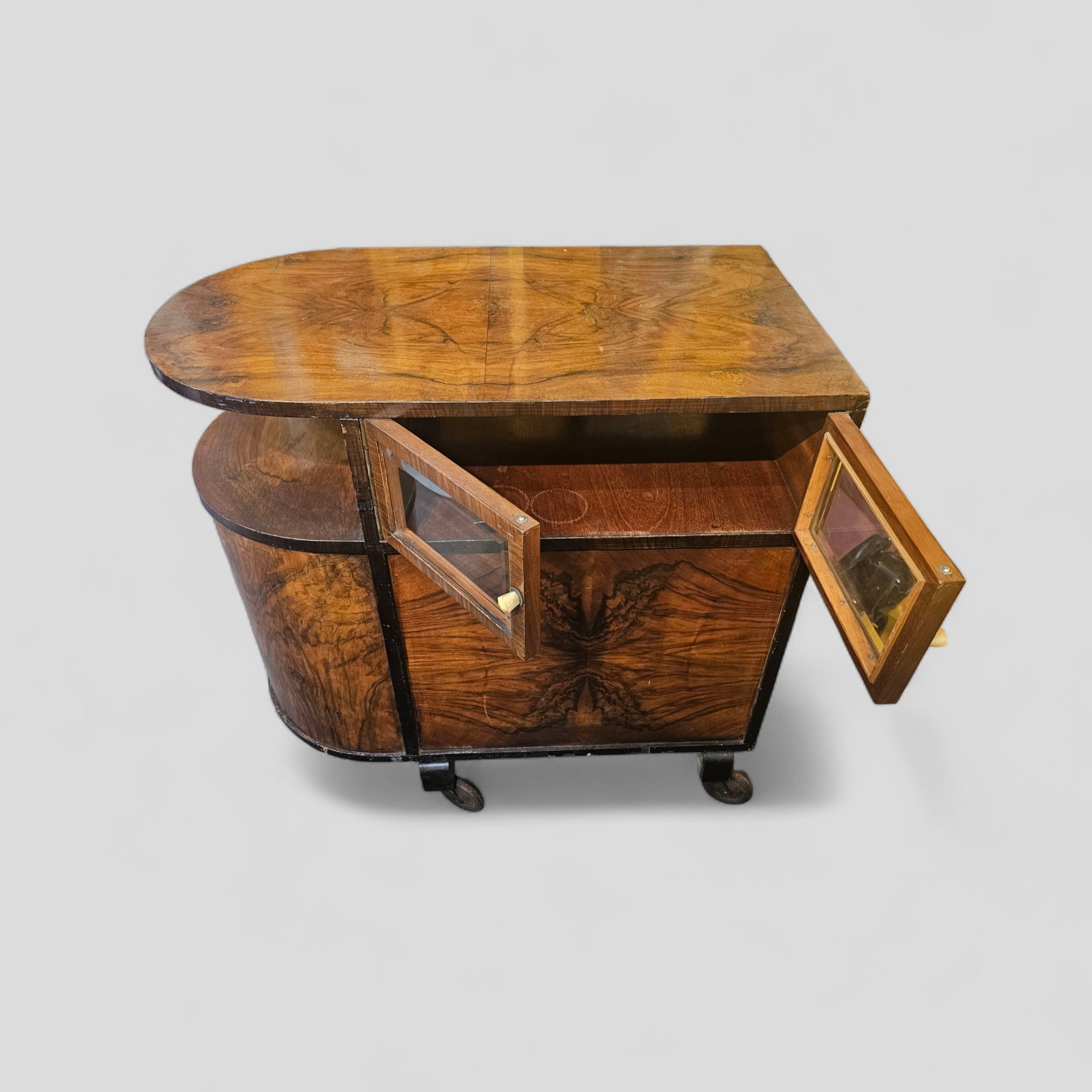 Bel tavolino art décaud in radica di betuul radica di noce con rotelle 2 sportelli con vetri. Antina bombata. Misura larghezza ottanta, profondità quaranta altezza settantotto. Epoca anni quaranta