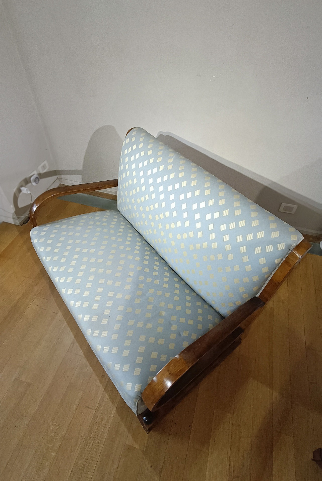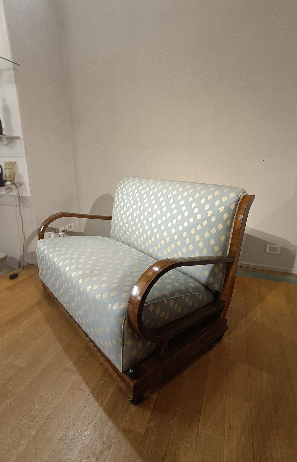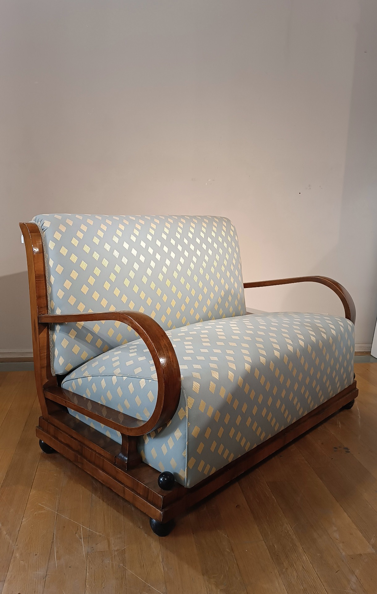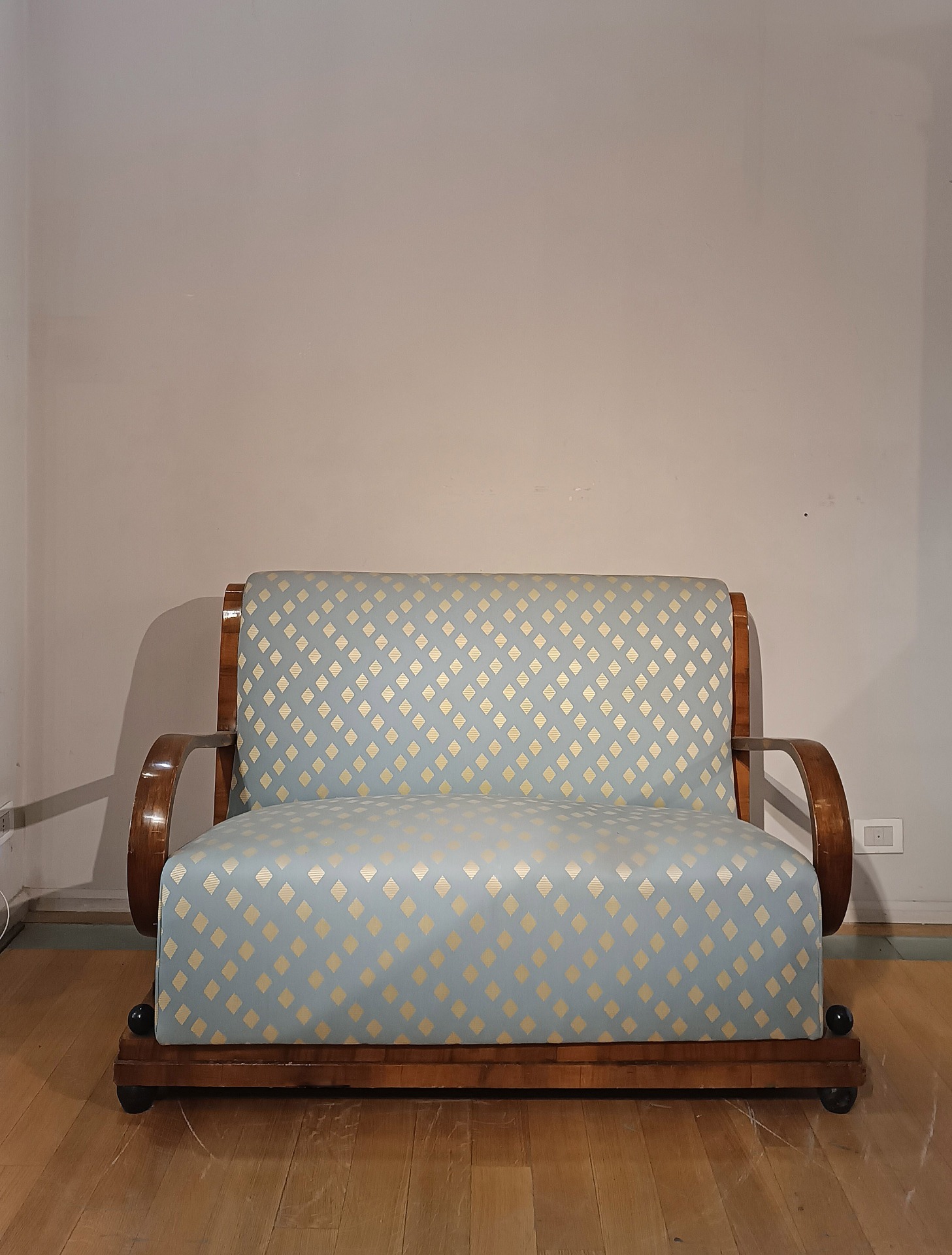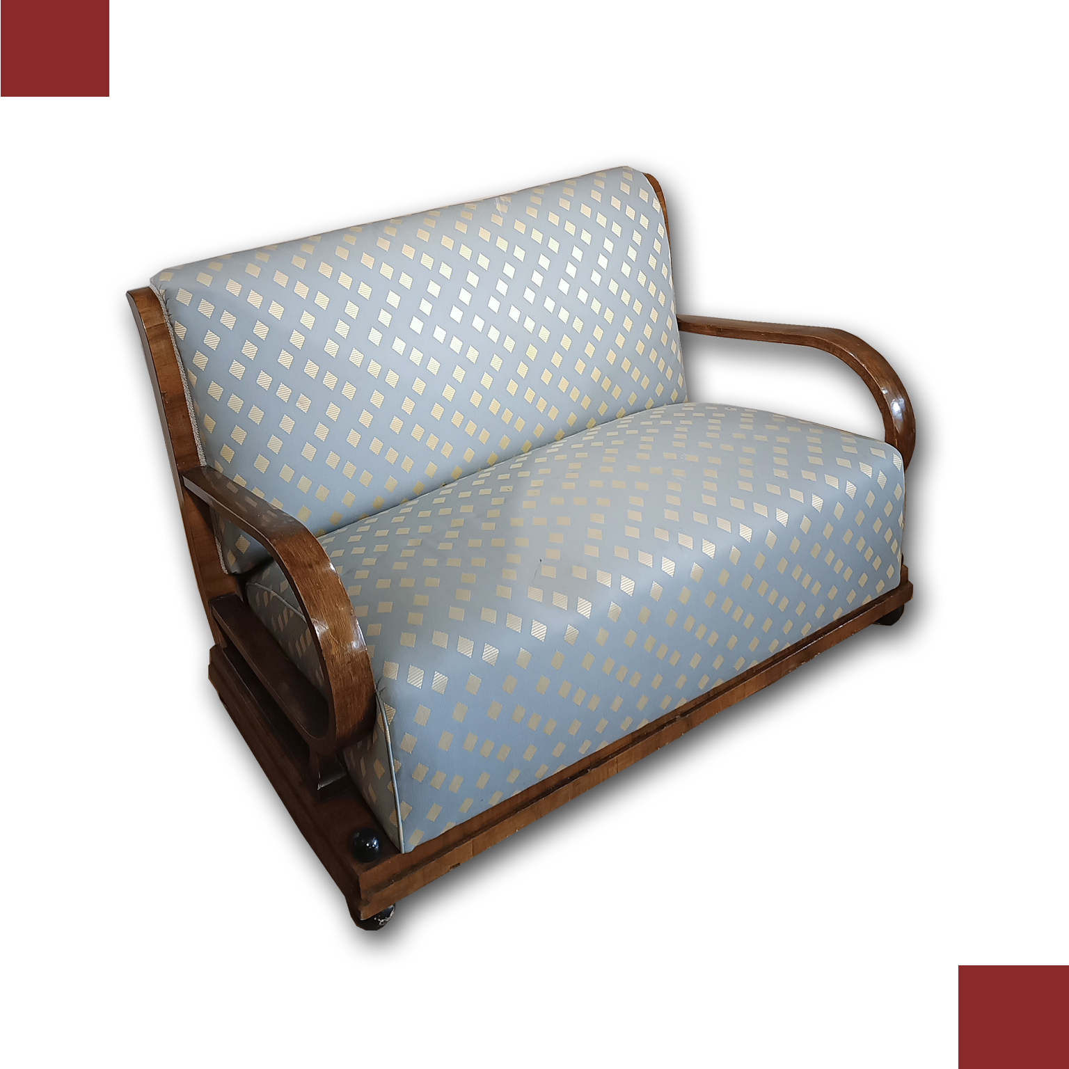 Splendido divanetto art déco lastronato in noce, con decorazioni e piedi ebanizzati. Imbottito con sospensioni a molla e rivestito con un tessuto azzurro a rombi bianchi, questo divanetto presenta uno schienale curvo e bracci arcuati che gli conferiscono un elegante design. La base lineare, decorata con sfere ebanizzate ai lati, aggiunge un tocco di modernità. Comodo e di gusto raffinato, questo divanetto era parte di un salottino completo e può essere acquistato singolarmente o insieme alla coppia di poltrone e al tavolino coordinati. Prodotto in Italia negli anni '30 del XX secolo, questo divanetto è un vero gioiello per arricchire qualsiasi ambiente con stile e design.