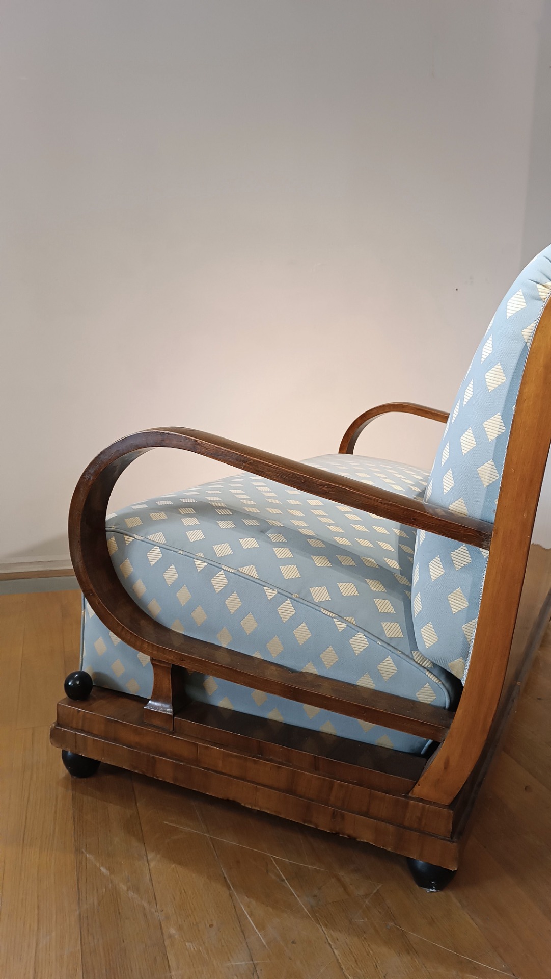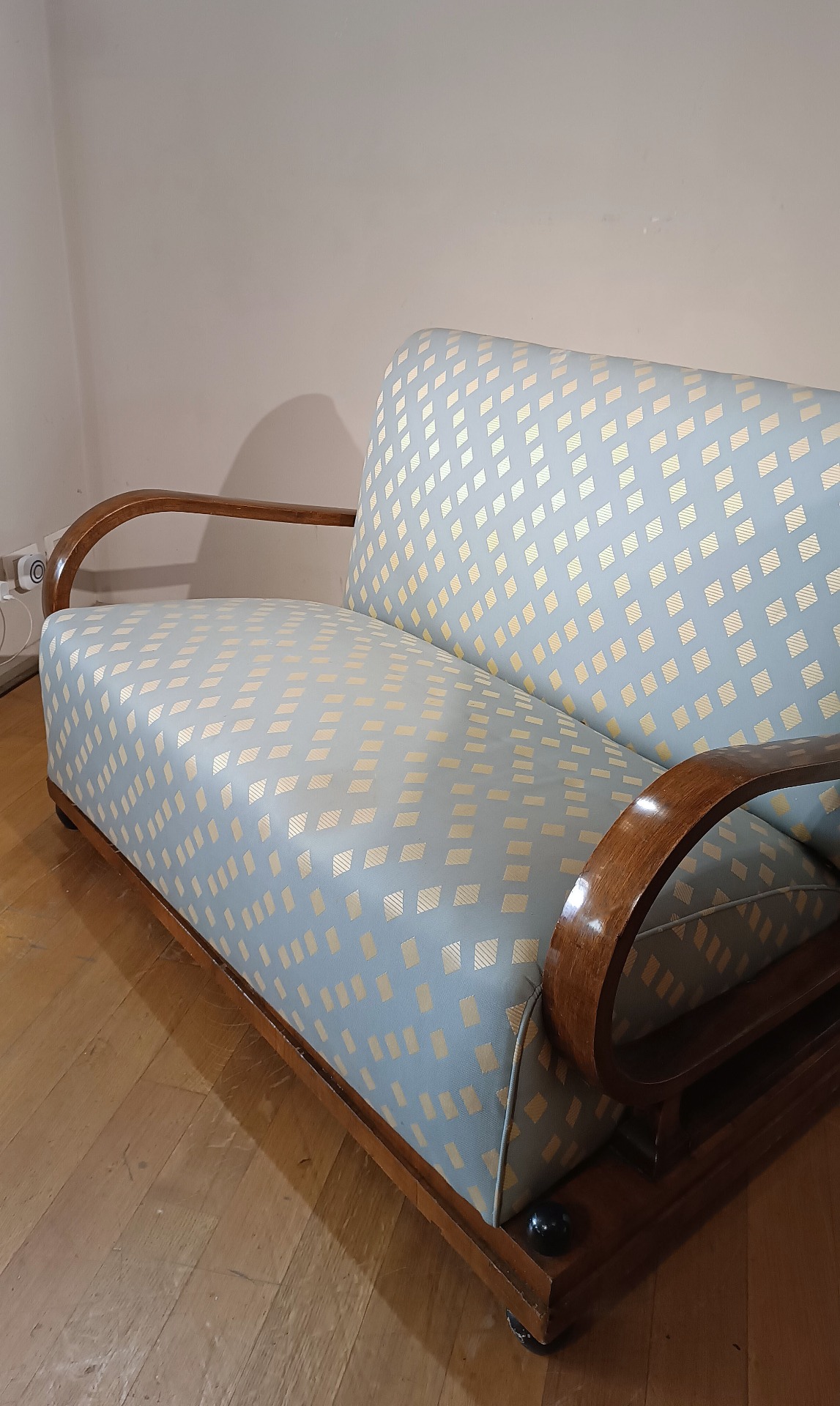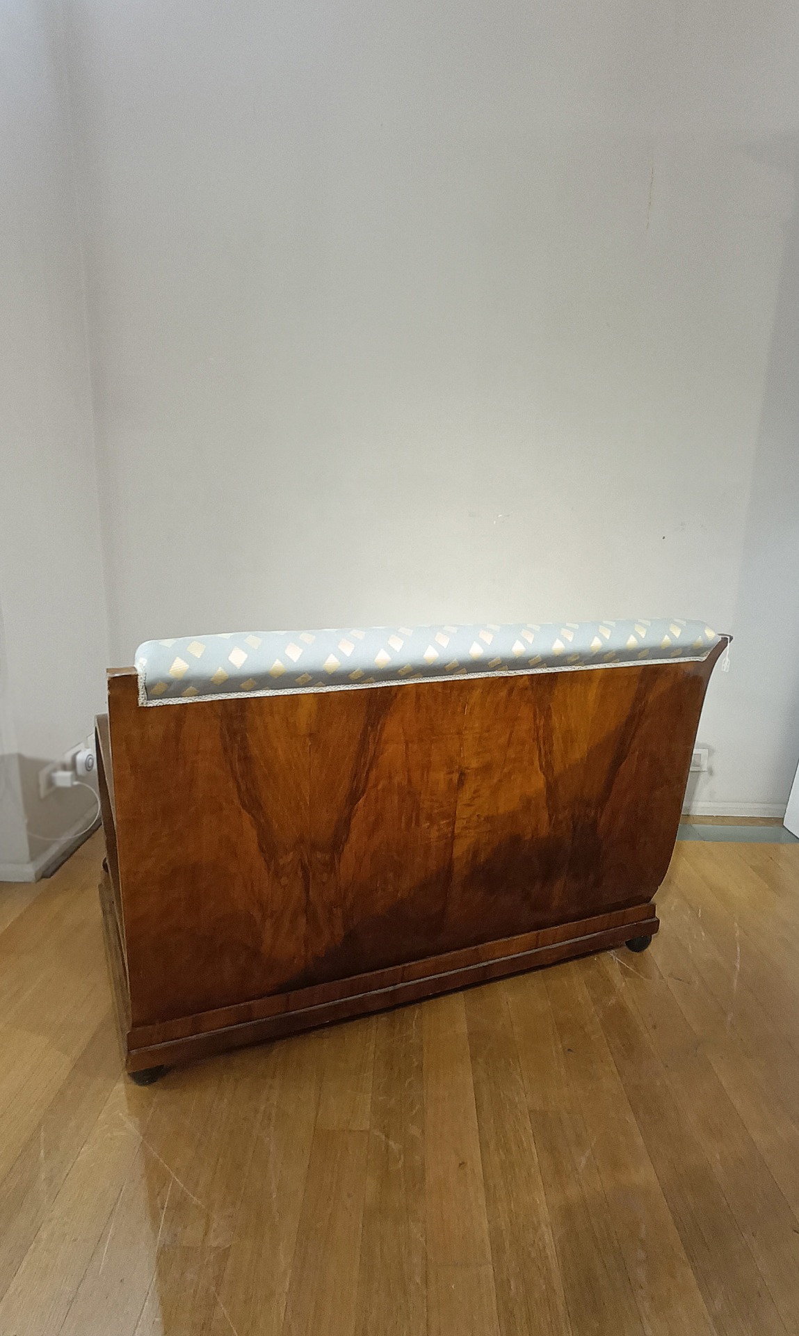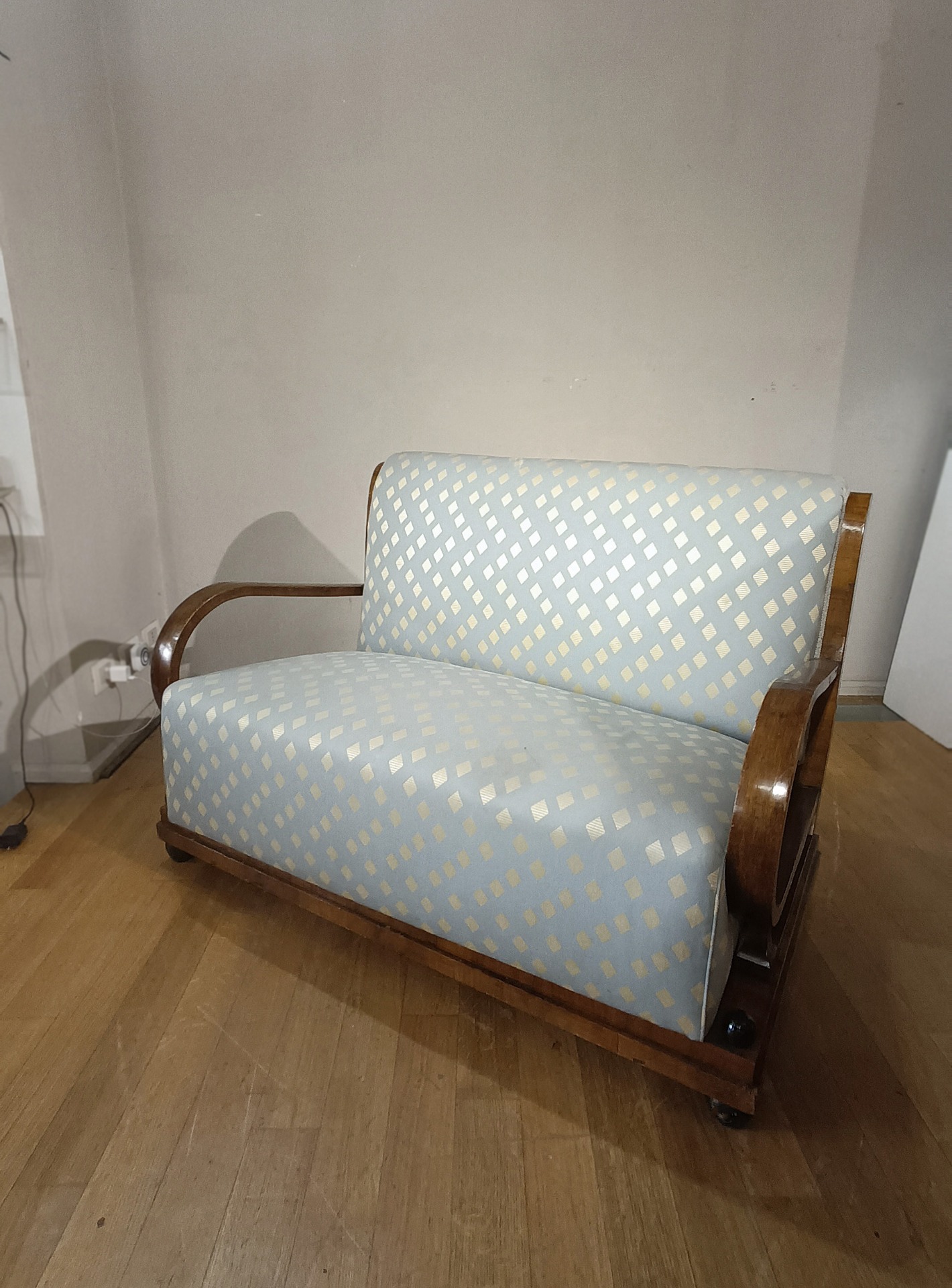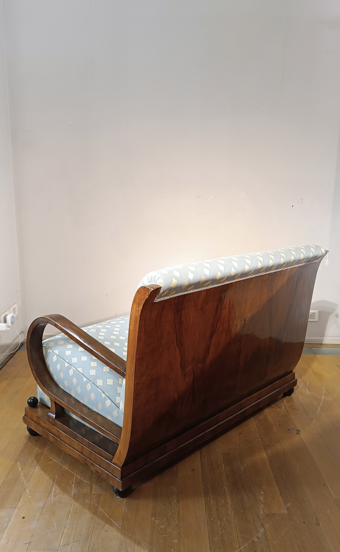 Splendido divanetto art déco lastronato in noce, con decorazioni e piedi ebanizzati. Imbottito con sospensioni a molla e rivestito con un tessuto azzurro a rombi bianchi, questo divanetto presenta uno schienale curvo e bracci arcuati che gli conferiscono un elegante design. La base lineare, decorata con sfere ebanizzate ai lati, aggiunge un tocco di modernità. Comodo e di gusto raffinato, questo divanetto era parte di un salottino completo e può essere acquistato singolarmente o insieme alla coppia di poltrone e al tavolino coordinati. Prodotto in Italia negli anni '30 del XX secolo, questo divanetto è un vero gioiello per arricchire qualsiasi ambiente con stile e design.