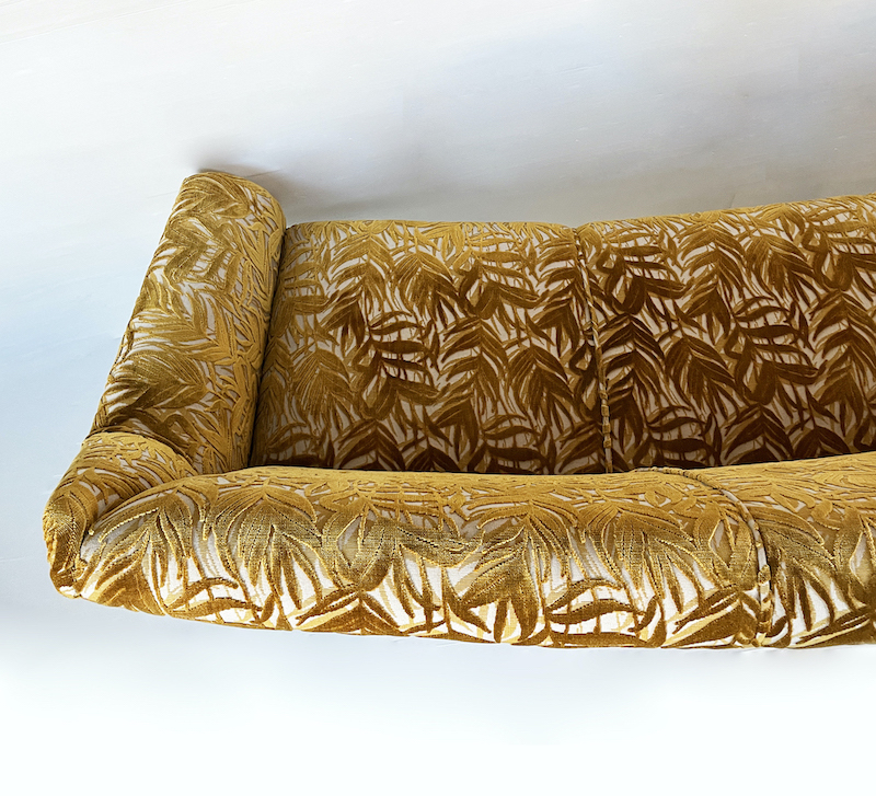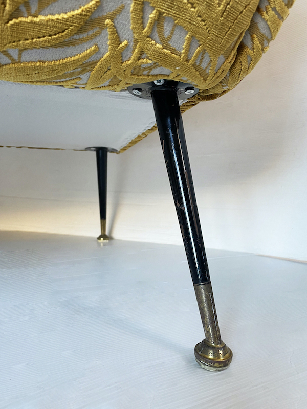 Particolare divano vintage 1970 dalla forma lineare e leggera completamente ritappezzato con tessuto color ocra di prima qualità in viscosa dall’elegante trama a foglie. Struttura in legno, piedini in legno laccato nero con dettaglio in ottone.
