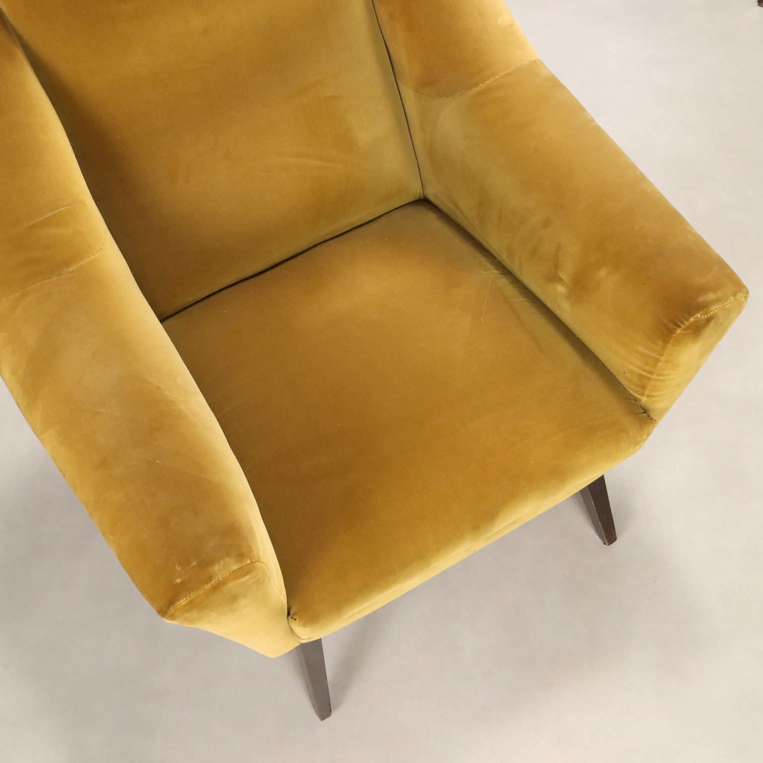 Coppia di poltrone vintage di manifattura italiana con imbottitura in espanso e rivestimento in velluto originale del periodo nei toni del verde bottiglia.